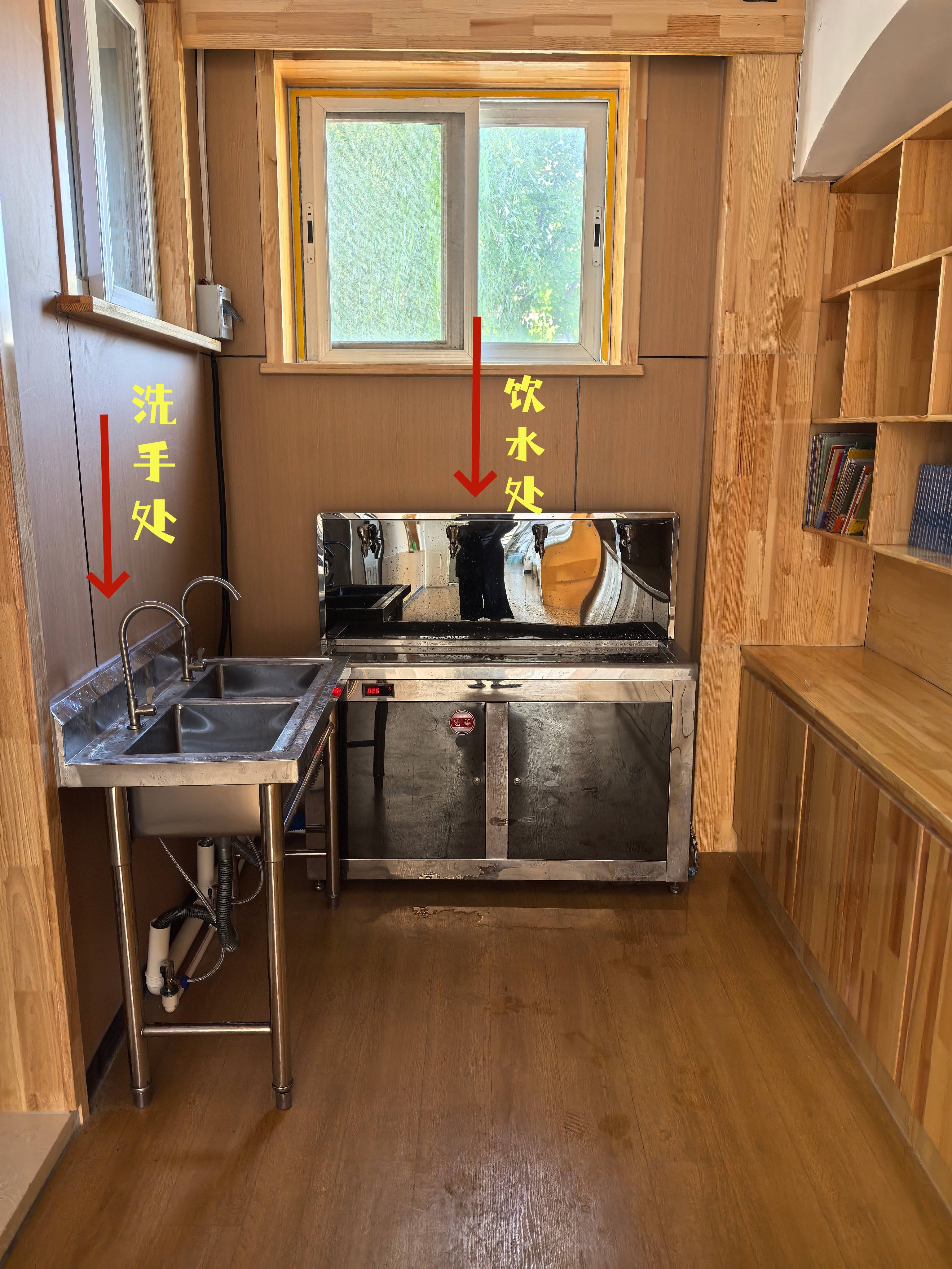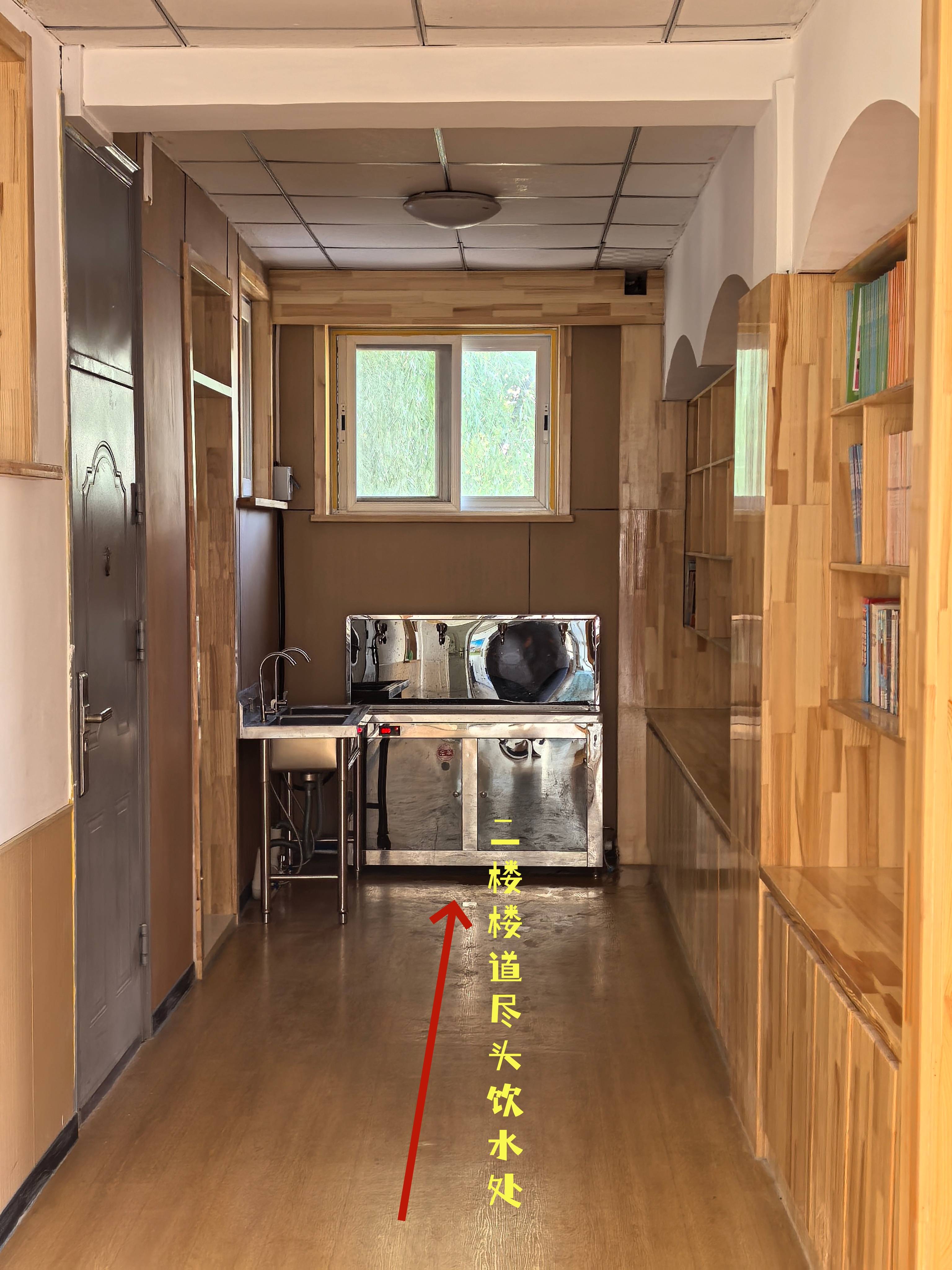 饮水处在二楼楼梯尽头,有直饮温开水。一楼同样位置还有一个温开水饮水处。馆内也有常备矿泉水和小型加热饮水机。