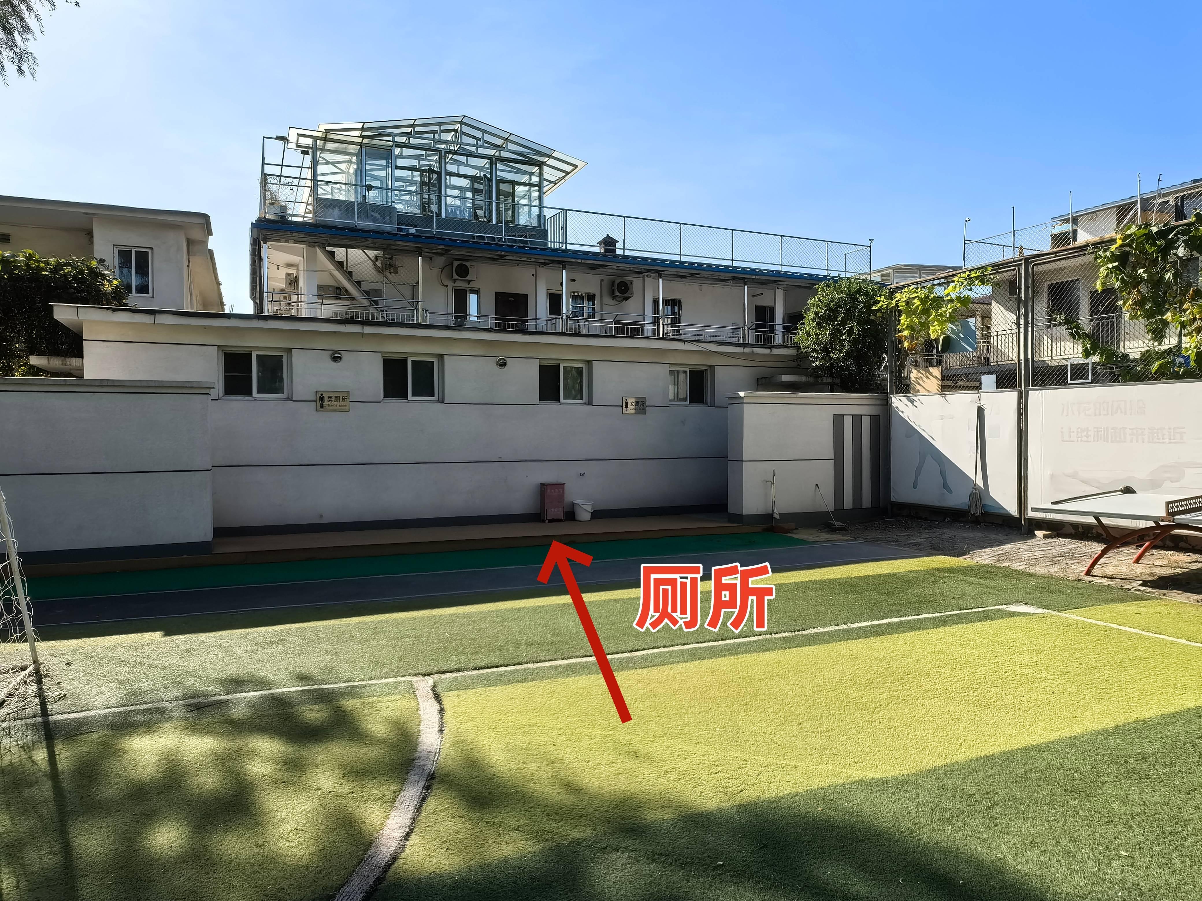 洗手间在学校院内北侧右前方(图书馆所在楼后面)。