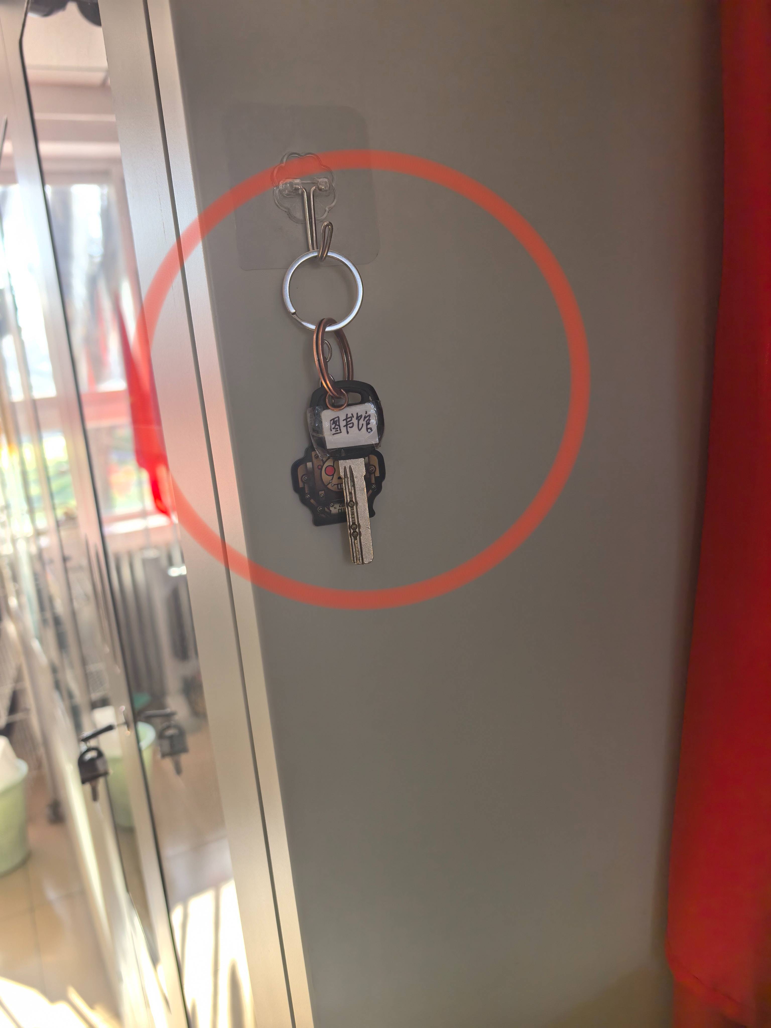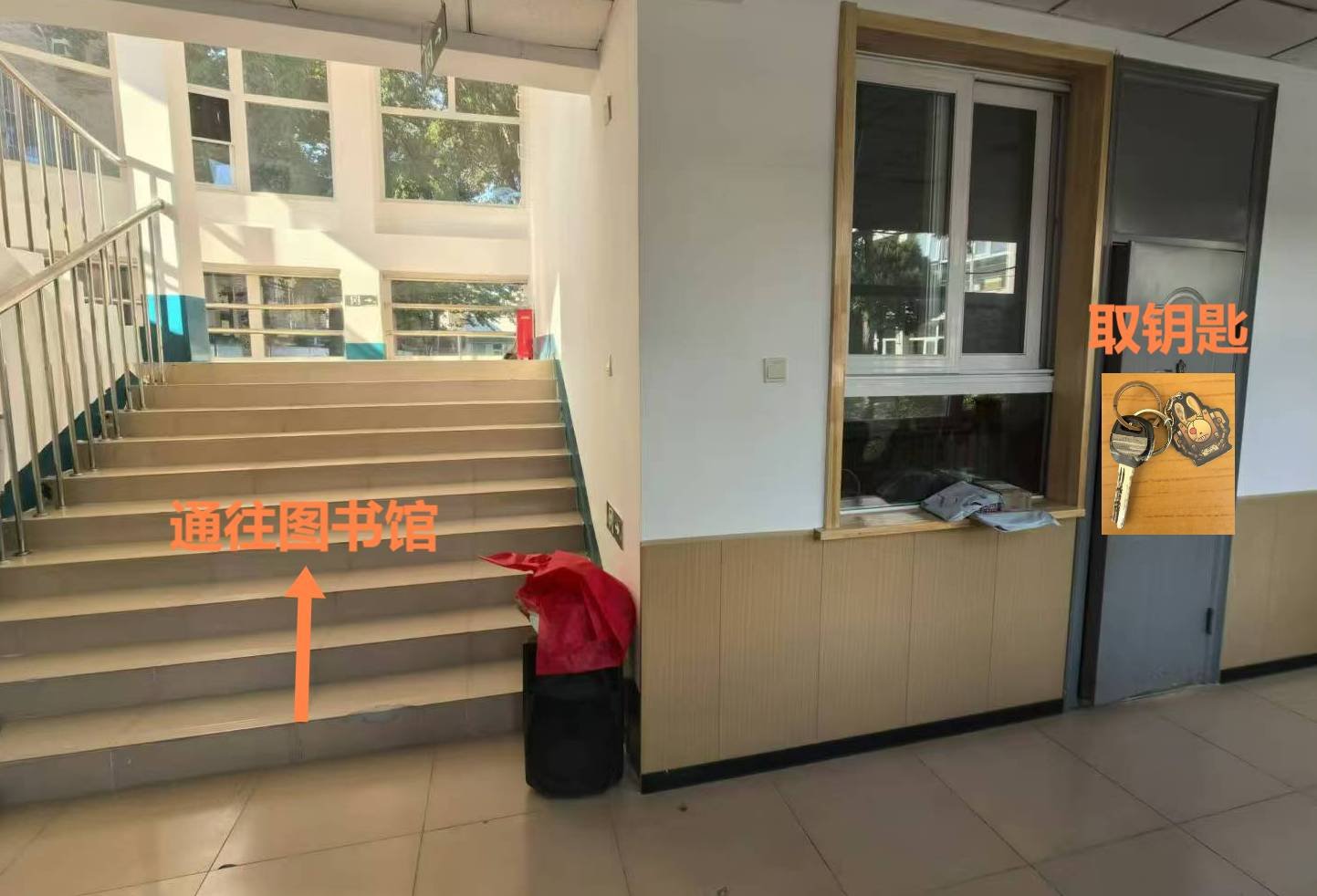 取钥匙处:通往图书馆的一楼楼梯旁贺校长办公室(见下图),闭馆后钥匙仍放回此处。