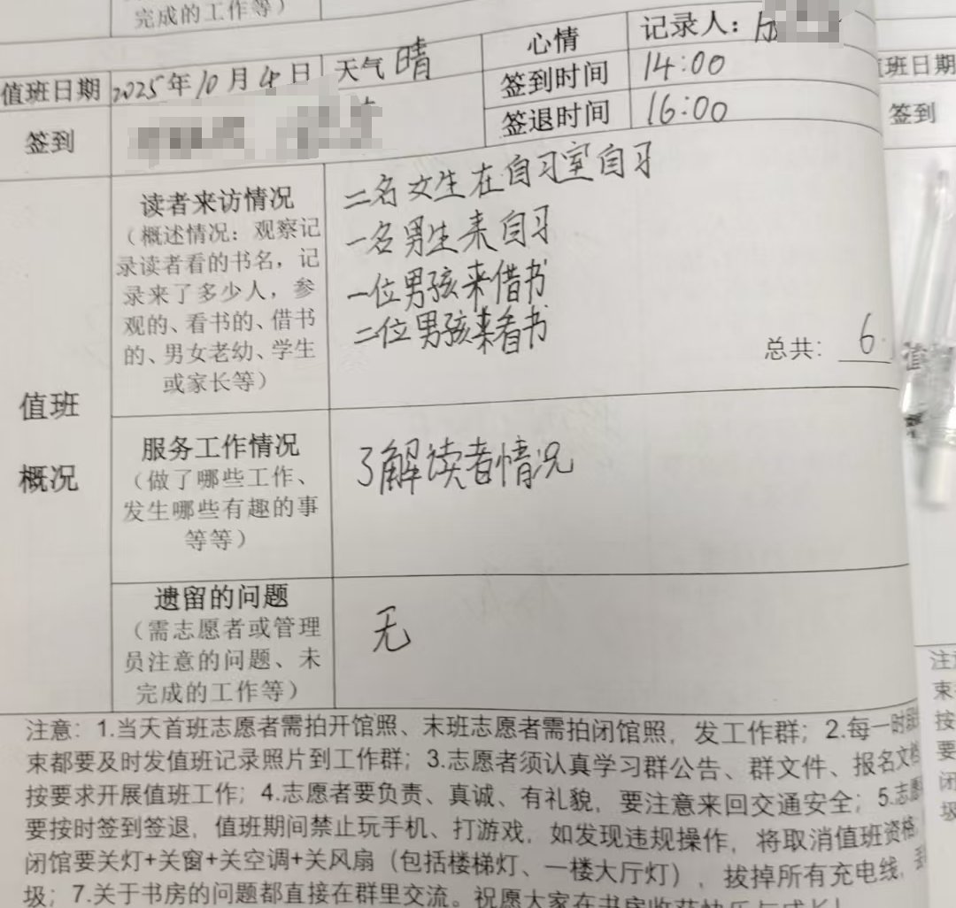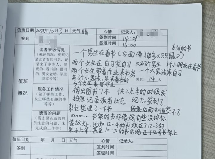 10月1日,志愿者兴冲冲来值班,然而ℹ️志愿系统不给力,出现了之前的bug,说签到码失效,更新了还是失效。这个之前已经打电话反馈过了,然而还是出现这个问题。只能让志愿者等系统好了再补签,但这个有点像空头支票,我有点担心志愿者因此不来值班了,今天2号,还是出现这个问题,但还好,暂时没有志愿者因此取消值班。连续全天开馆的第二天。