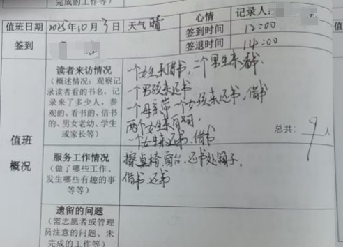 晚上负责ℹ️志愿录用的心莲来问志愿者们签到补签的问题,这两天没法签到,她也很替大家着急呢。了解了管理员辅助签到的方法,如果明天还是不能签的话,她可以帮助大家签。需要登记大家这两天的值班时长,收集大家的志愿者码,按照时长签到签退。是一项挺麻烦琐碎的活~但是心莲愿意负担起来。