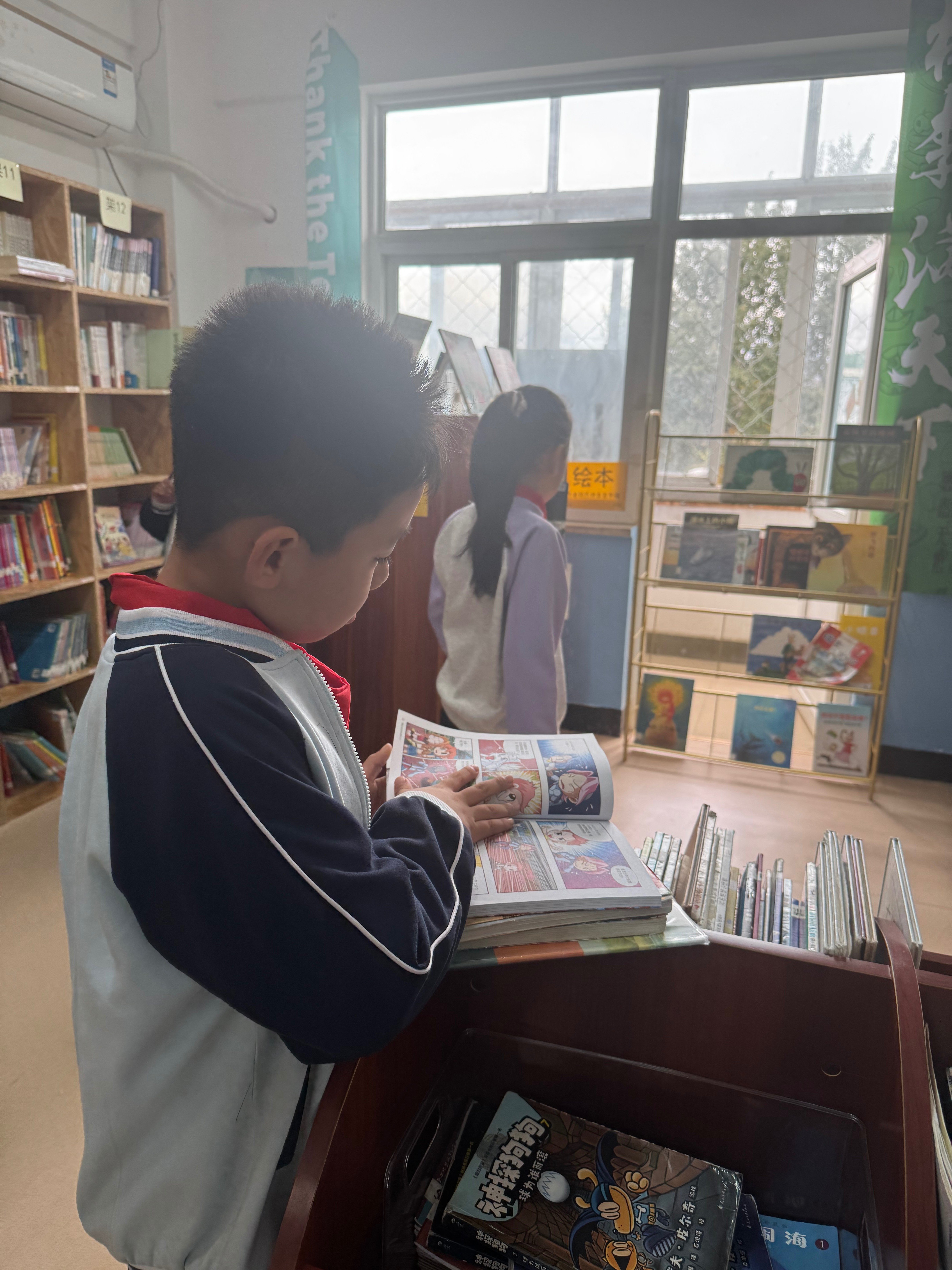 今天下雨,下雨天孩子们更喜欢来图书馆了,一个可爱的小同学特意过来告诉我说:我一直盯着图书馆等着开门呢!每个课间,图书馆都异常热闹,有的独自看书,也有三三两两一起看,还时不时讨论,看着孩子们逐渐养成了阅读兴趣非常开心!