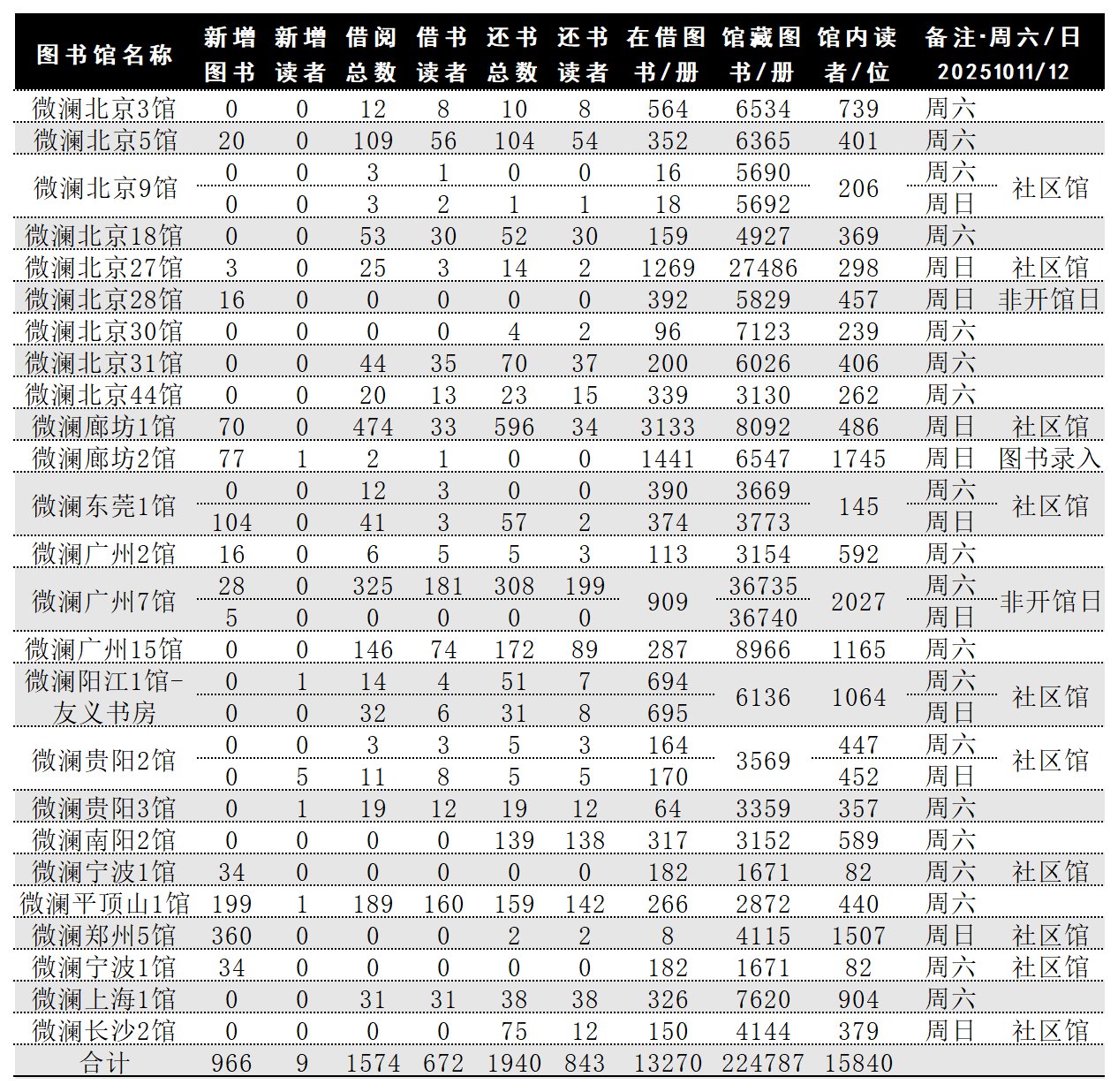 各馆数据日报20251011/12/周六日: