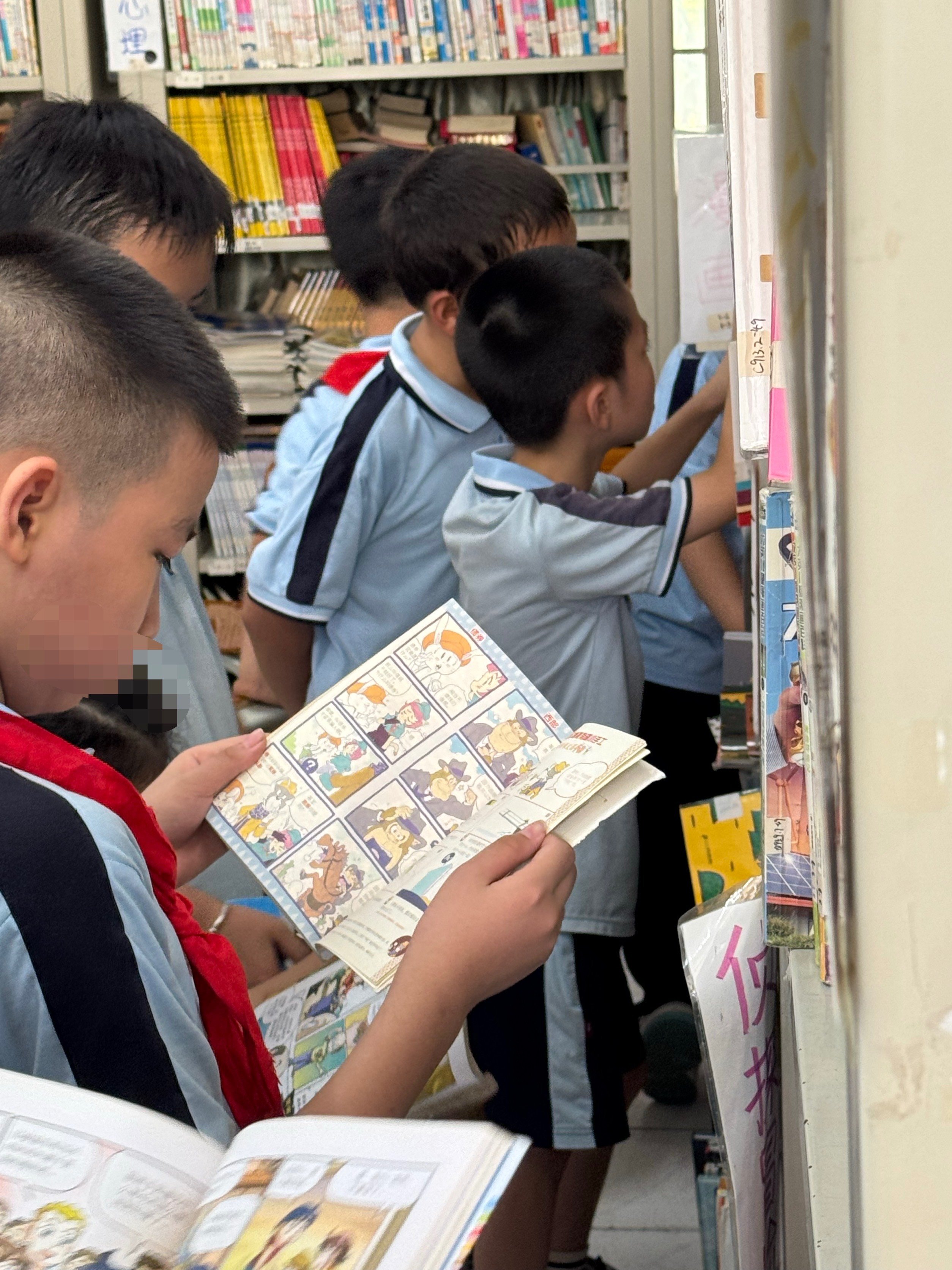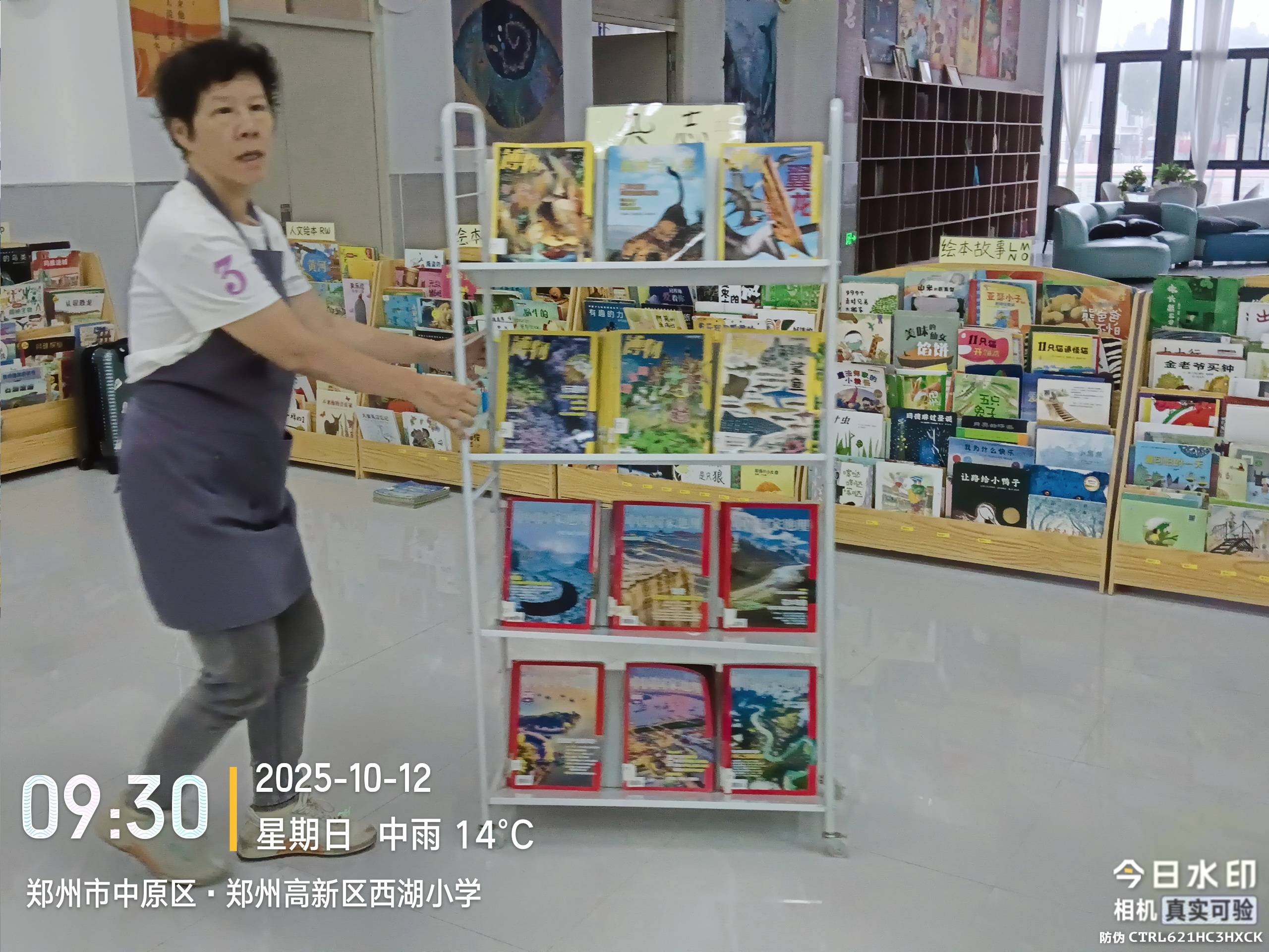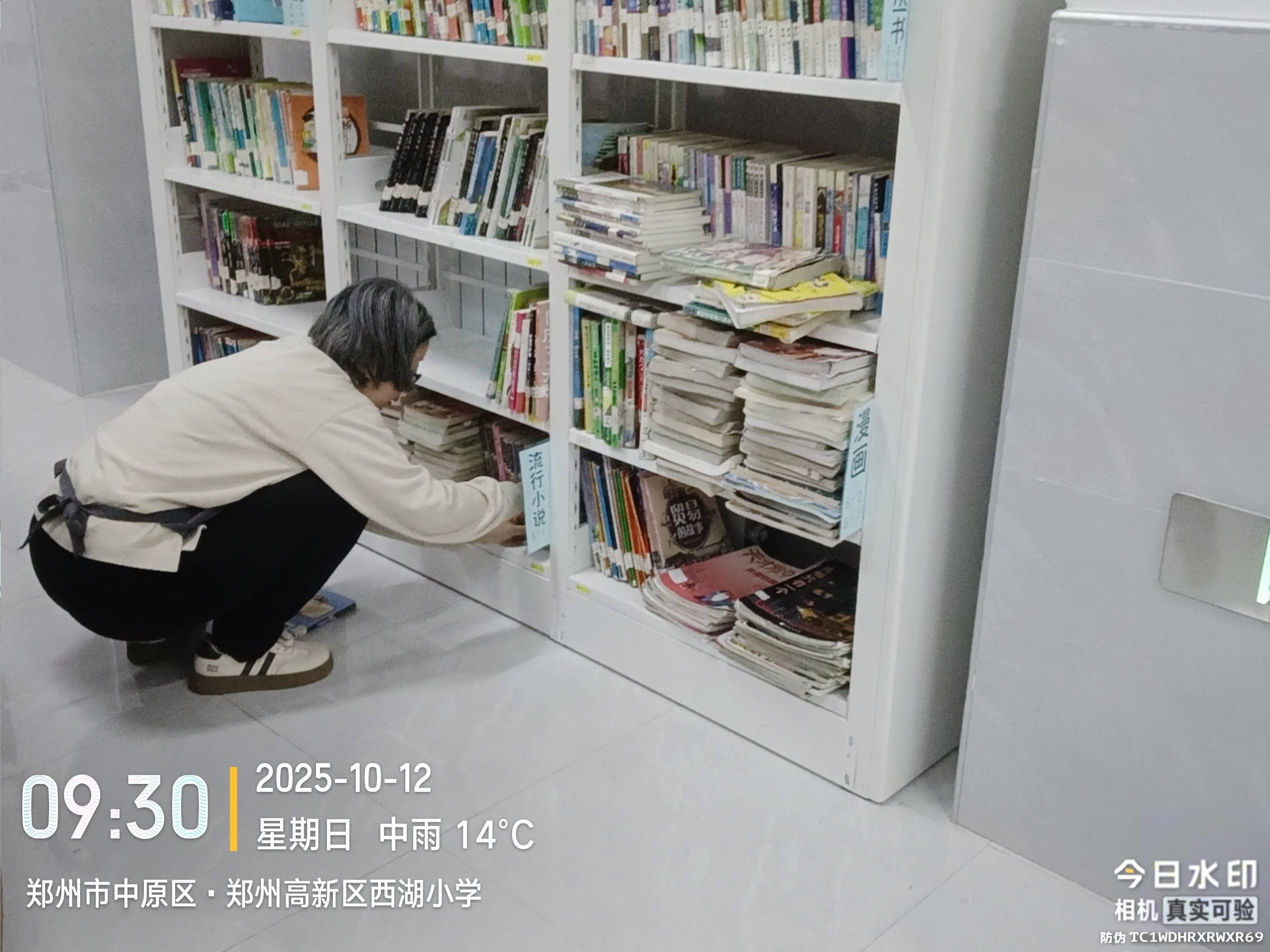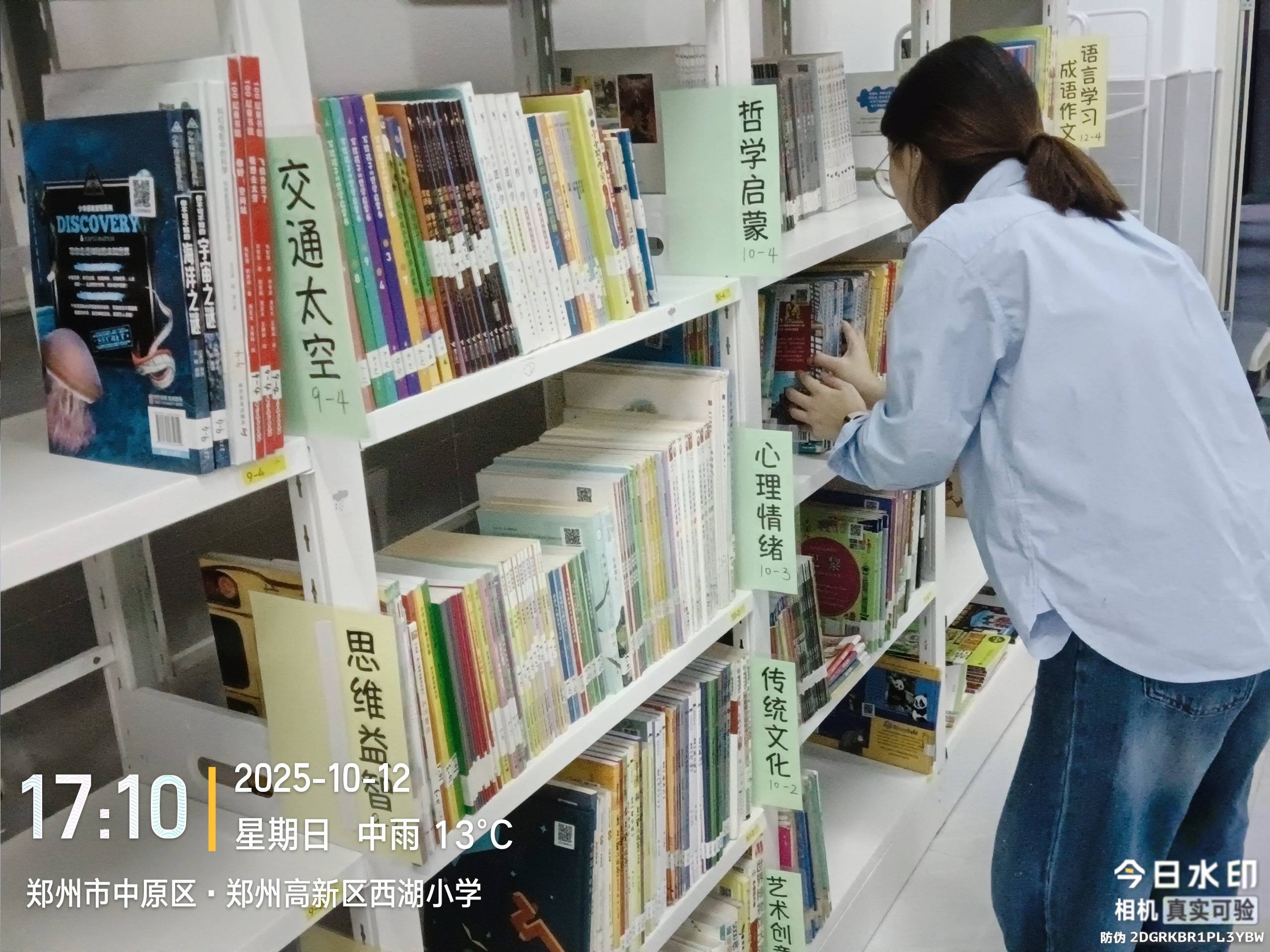 ◦ 今日对每列书架进行了升级:在顶端放置A4大小的分类牌,方便小读者快速识别每列书架的文类;同时清理出学校旧馆藏,将其改设为中国文学类层架。
