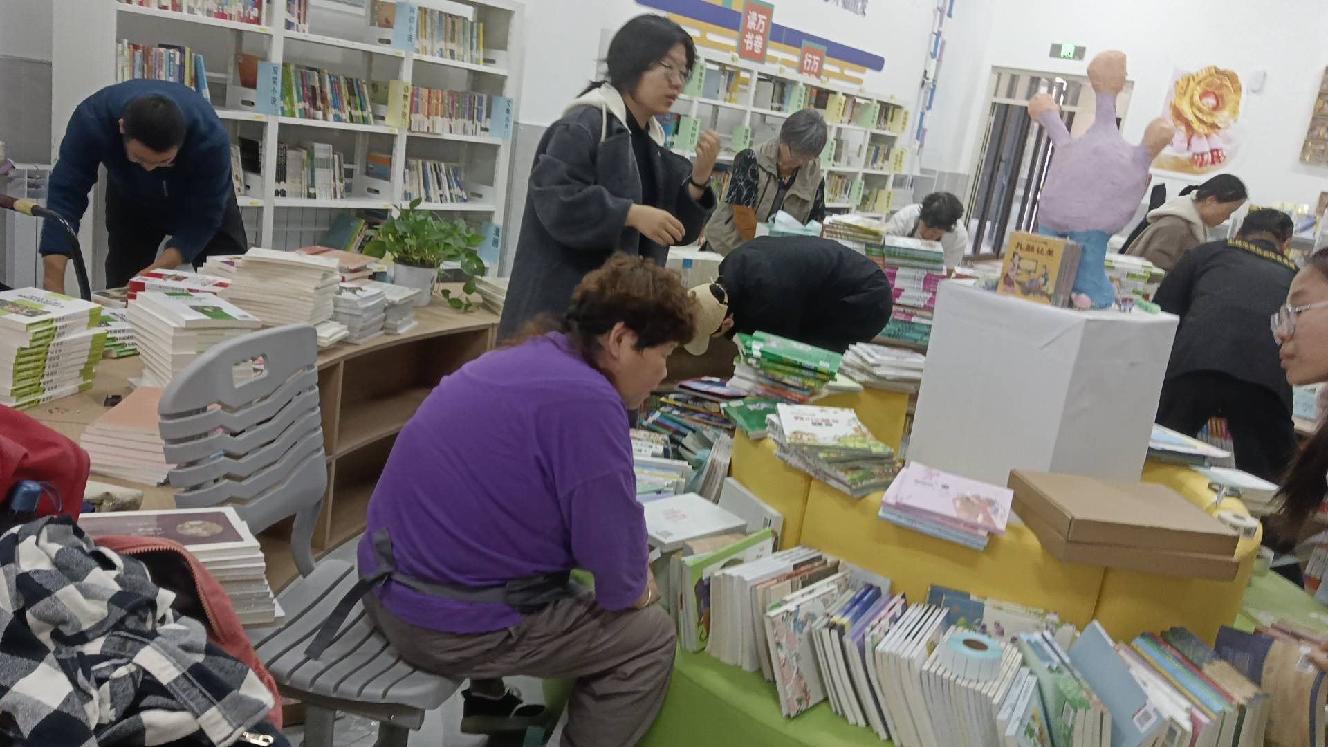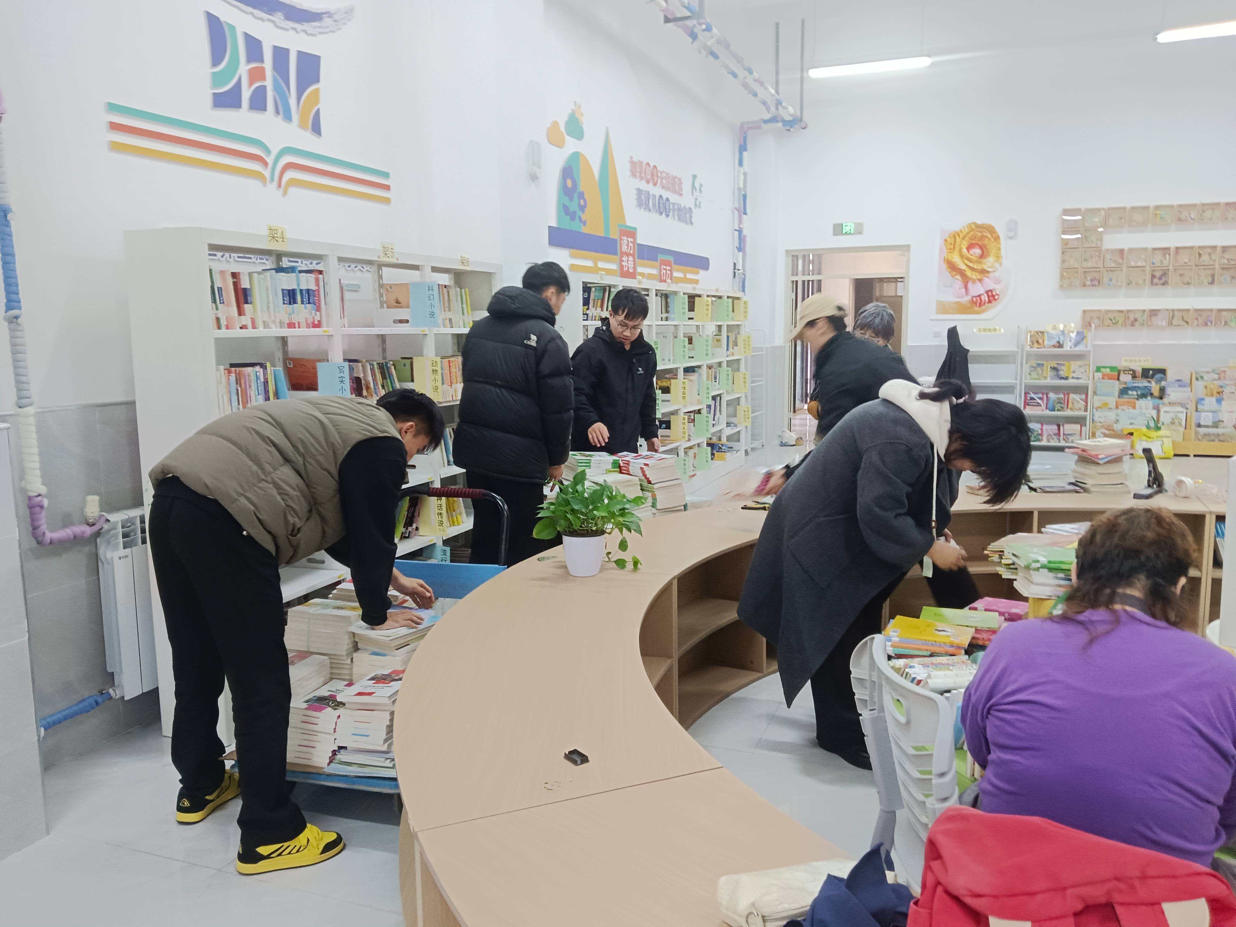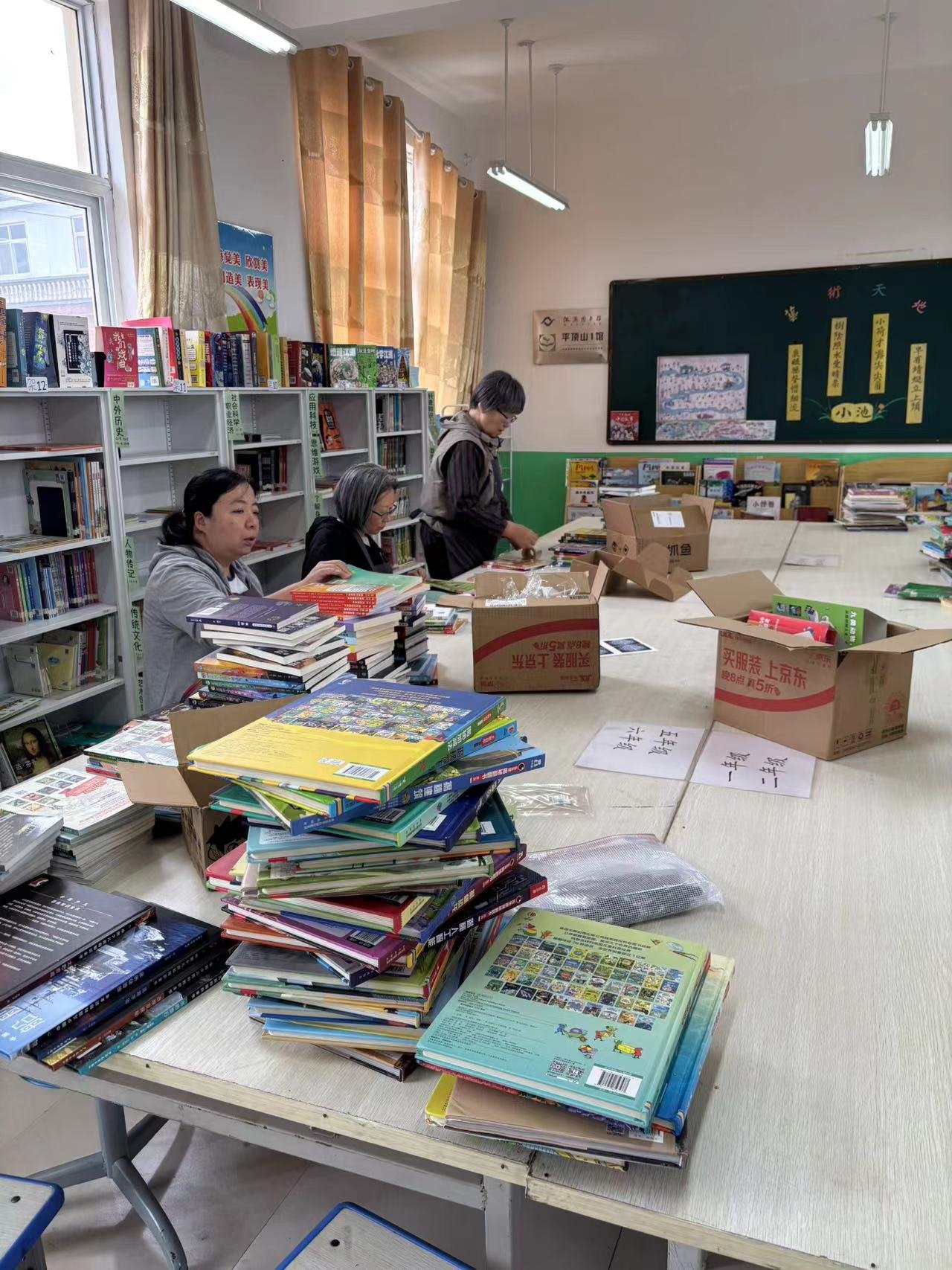 由于北京6家人要返京回家,在最短的时间,在毅桦老师和雨晨老师的带领下,完成所有图书分类上架处理,又把新书分类录入上架。