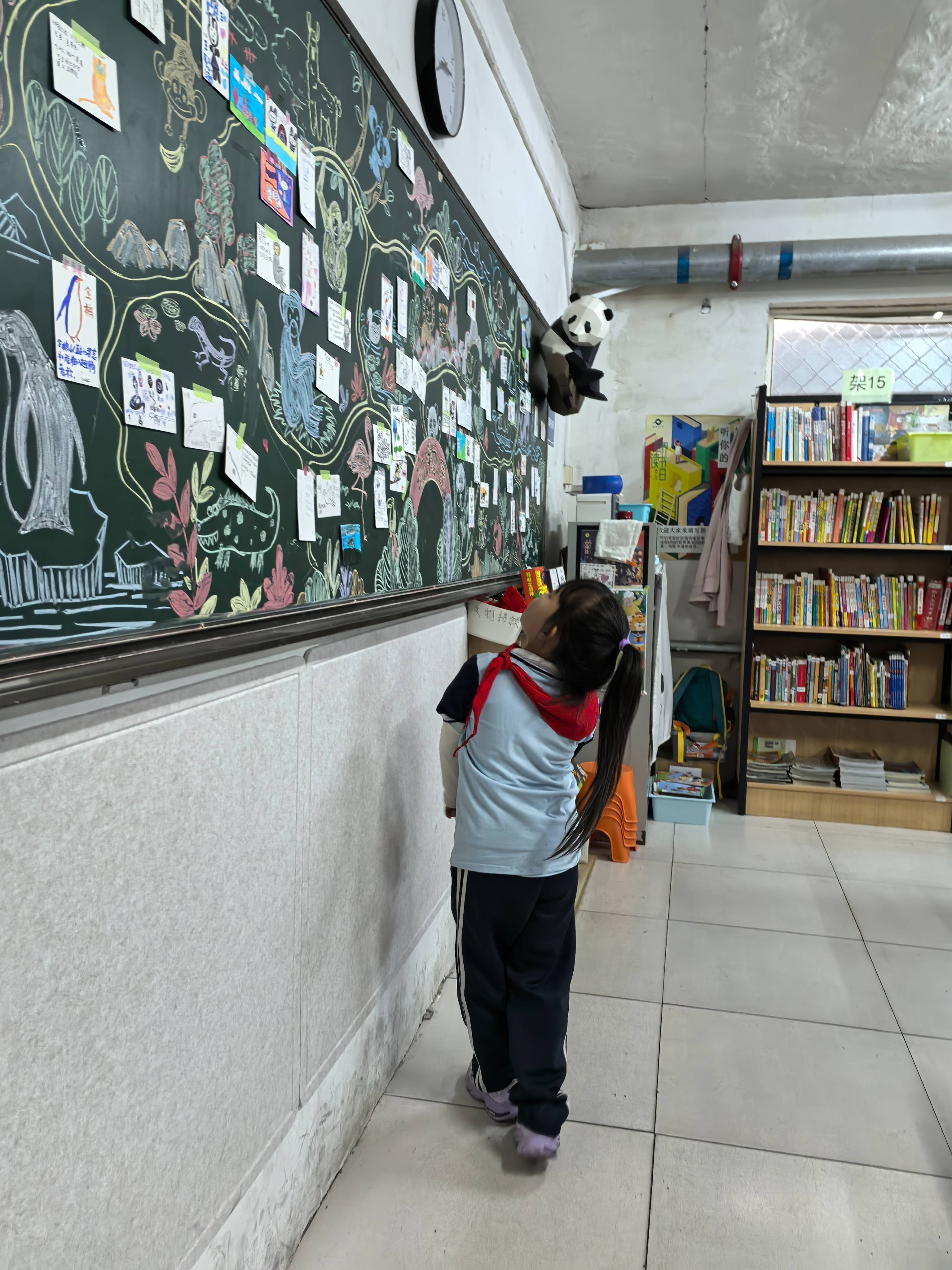 课间到操场和孩子们聊天,了解这一年多图书馆的开馆情况。中高年级的孩子们每星期都可以到图书馆借书。有的提到借书卡丢了,和同学共用。(后来和校长交流也证实了学校的灵活管理模式,借阅系统额度是两本,但是目前学校只让学生借一本,丢卡的同学与一位有卡同学绑定,一起借、一起还,额度够用。)有说喜欢看漫画,有说喜欢看寻宝记。感觉开馆状况蛮好,如果有引导,收获会更大。