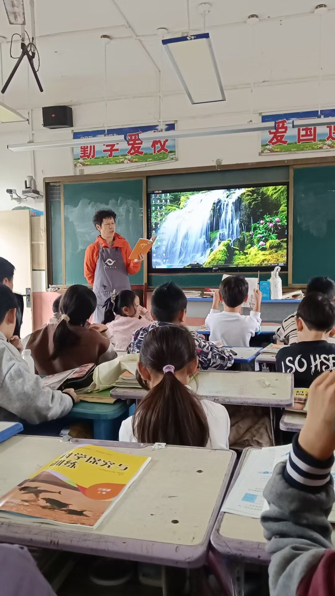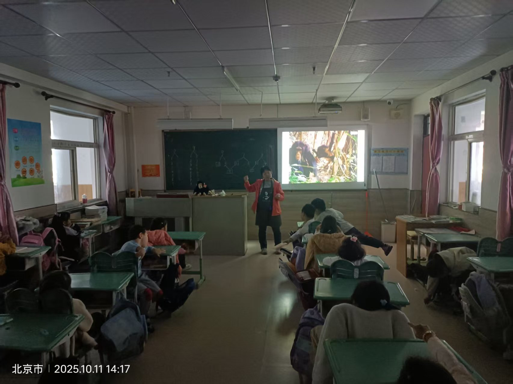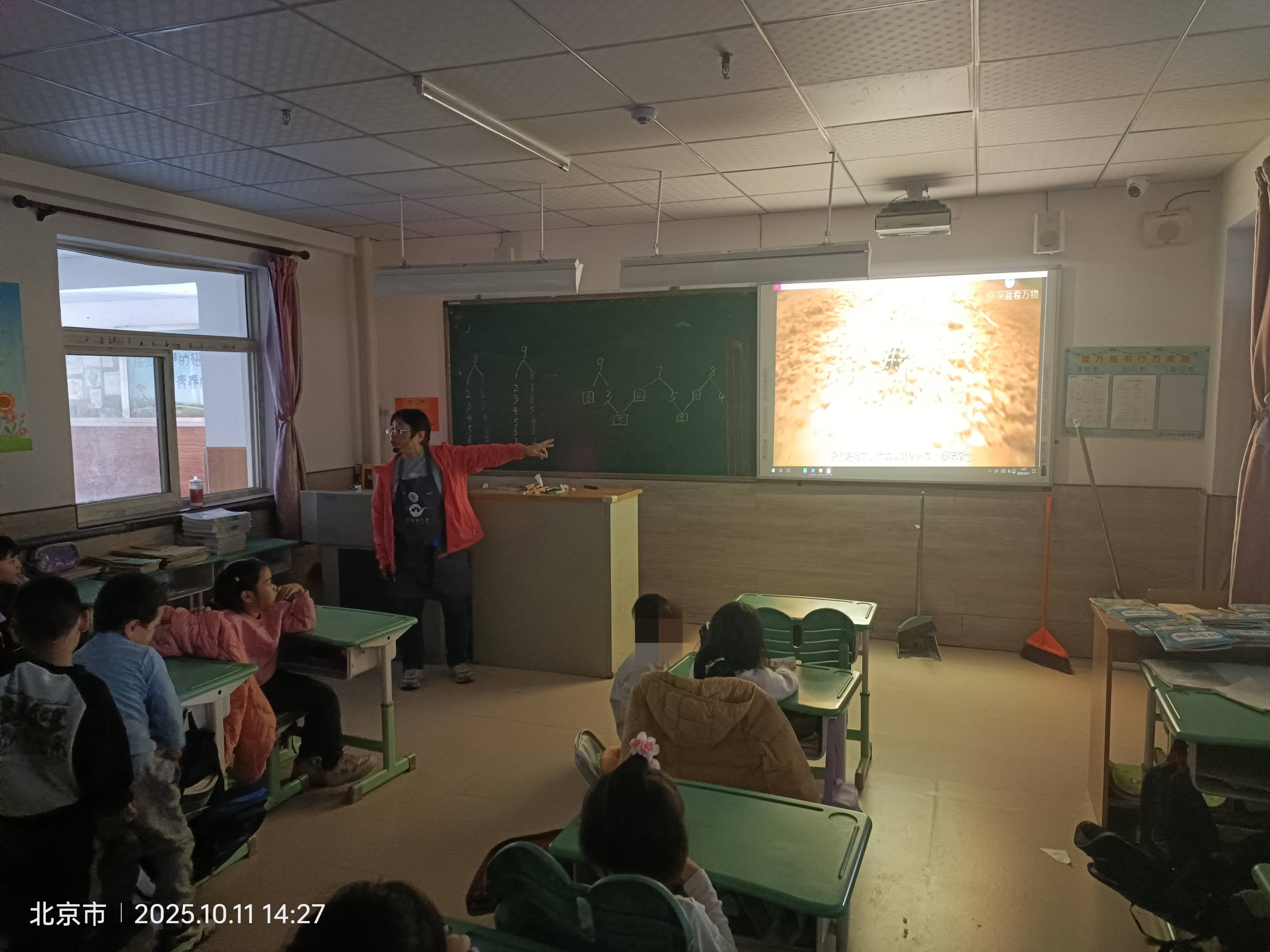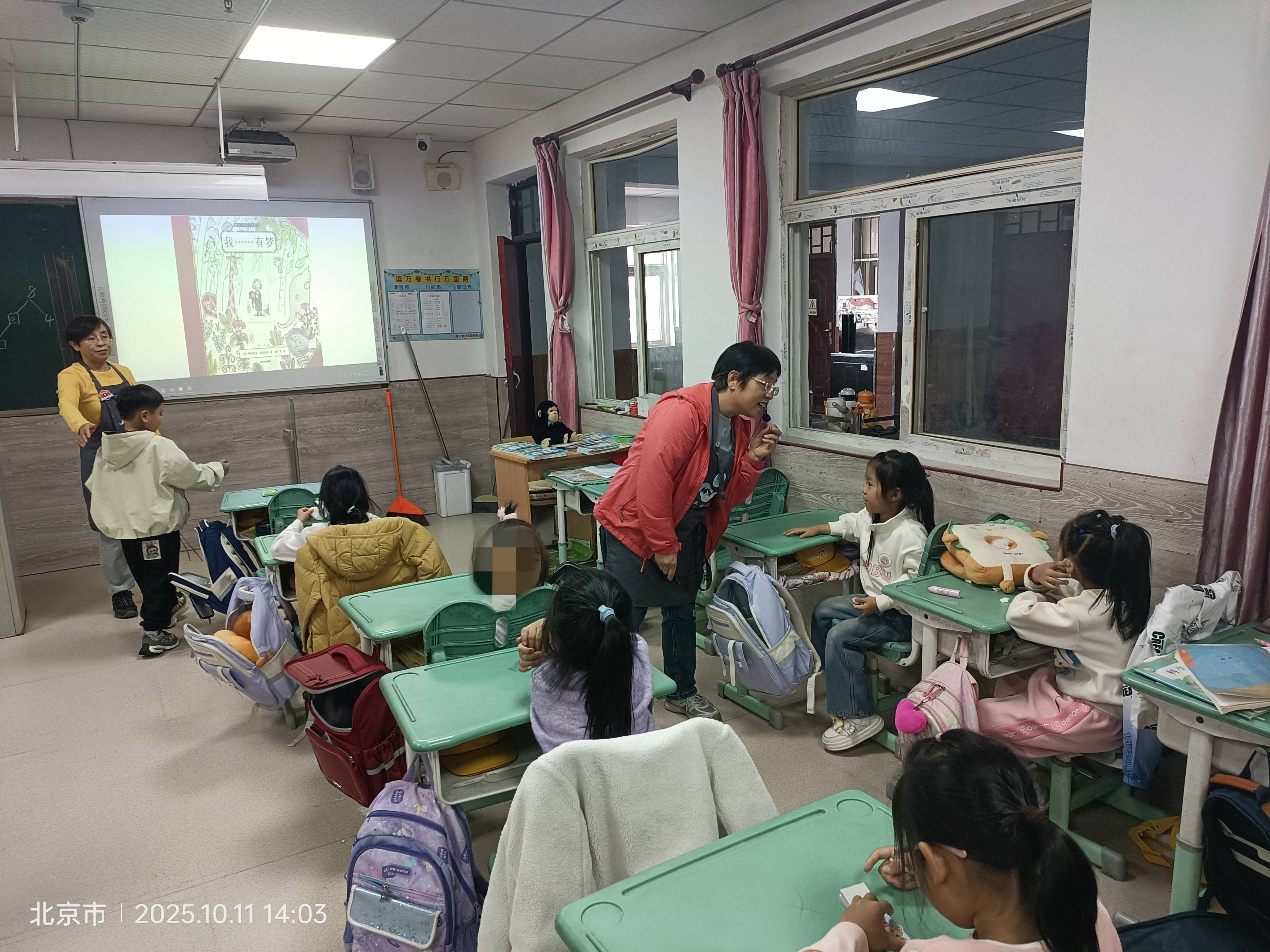 由于二年级2班班主任给学生辅导作业绘本课,暂停一次,下午一年级1班的绘本课,有我和罗晖老师一起进进班讲了三个绘本,利用剩下的三分钟给孩子们放了一个虎甲的小视频,为讲《生命的故事-虎甲》这本书预热一下,周贺老师负责维持秩序和拍照,并学习观摩。在讲的过程中,有五位同学的注意力很难集中,剩下的大部分同学还是非常认真的在听并参与互动。