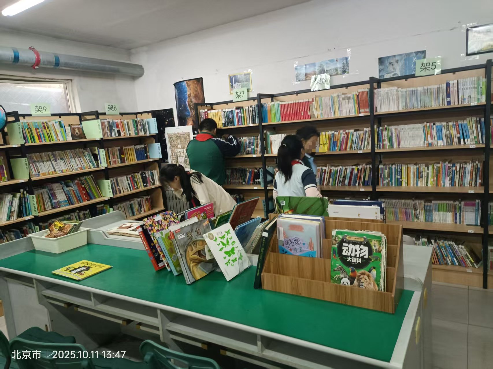周六补周二的班,临时来支援。没想到学校开运动会,所有的阅读课都没有开展。零零星星孩子们还是来借书、看书。新书到了几包,已经拆了贴了书脊贴,可惜没有益迪码,没有入库。由于新书《上下五千年》建议放到5-5/5-4,但是5-5太满,把一套更适合放到科普的图书进行了调整(调整到了1-5)书名忘记了。已经有不少小朋友对新书表达了喜爱。有一个五年级的孩子特别喜欢历史。一个女同学问《作文里的奇案》下架问题,询问了其他伙伴,得知丢失下架,还没来的及回复该同学,下周值班伙伴可告知。推荐了《夏洛的网》,同学们都没借阅,小遗憾。