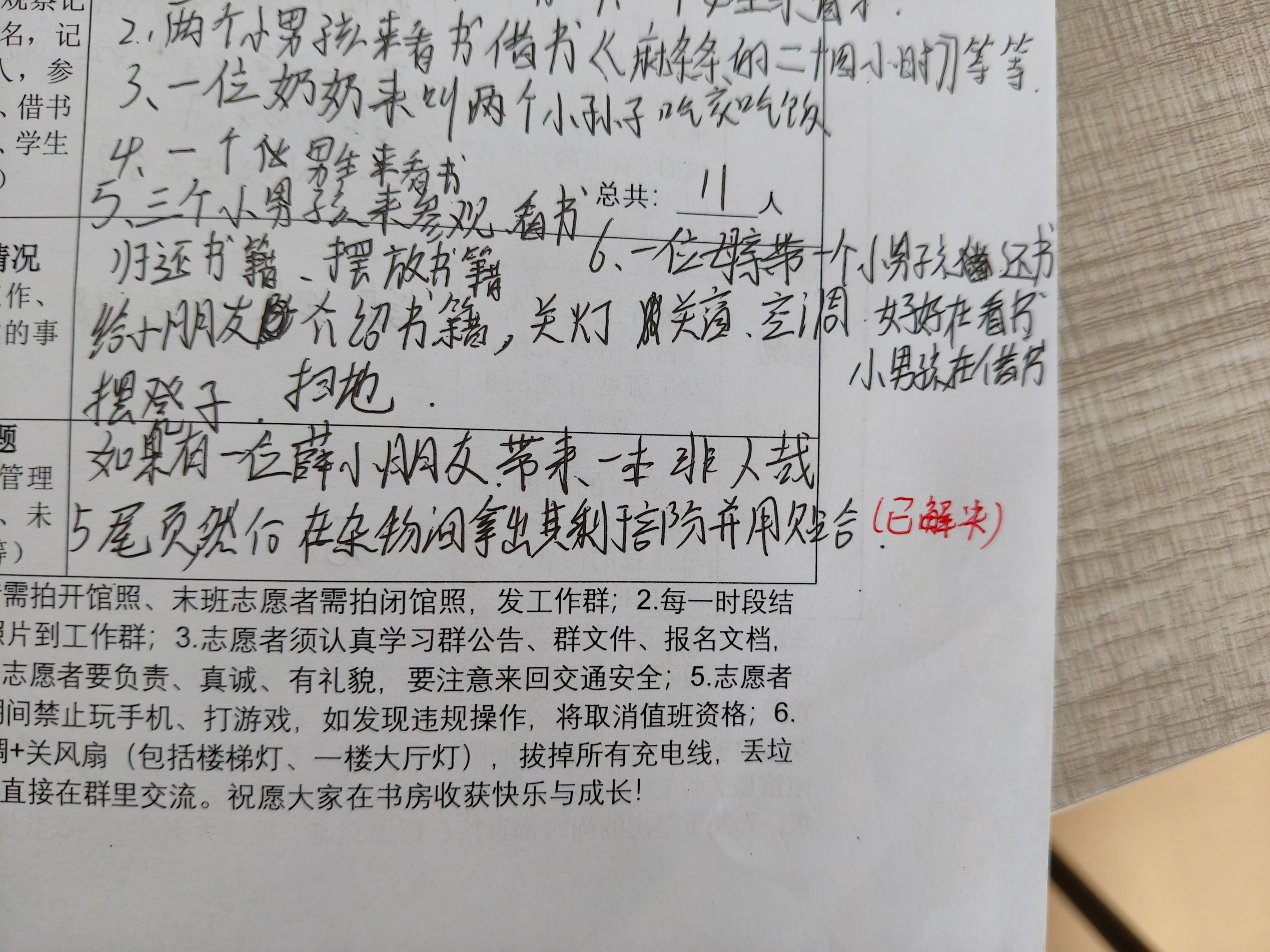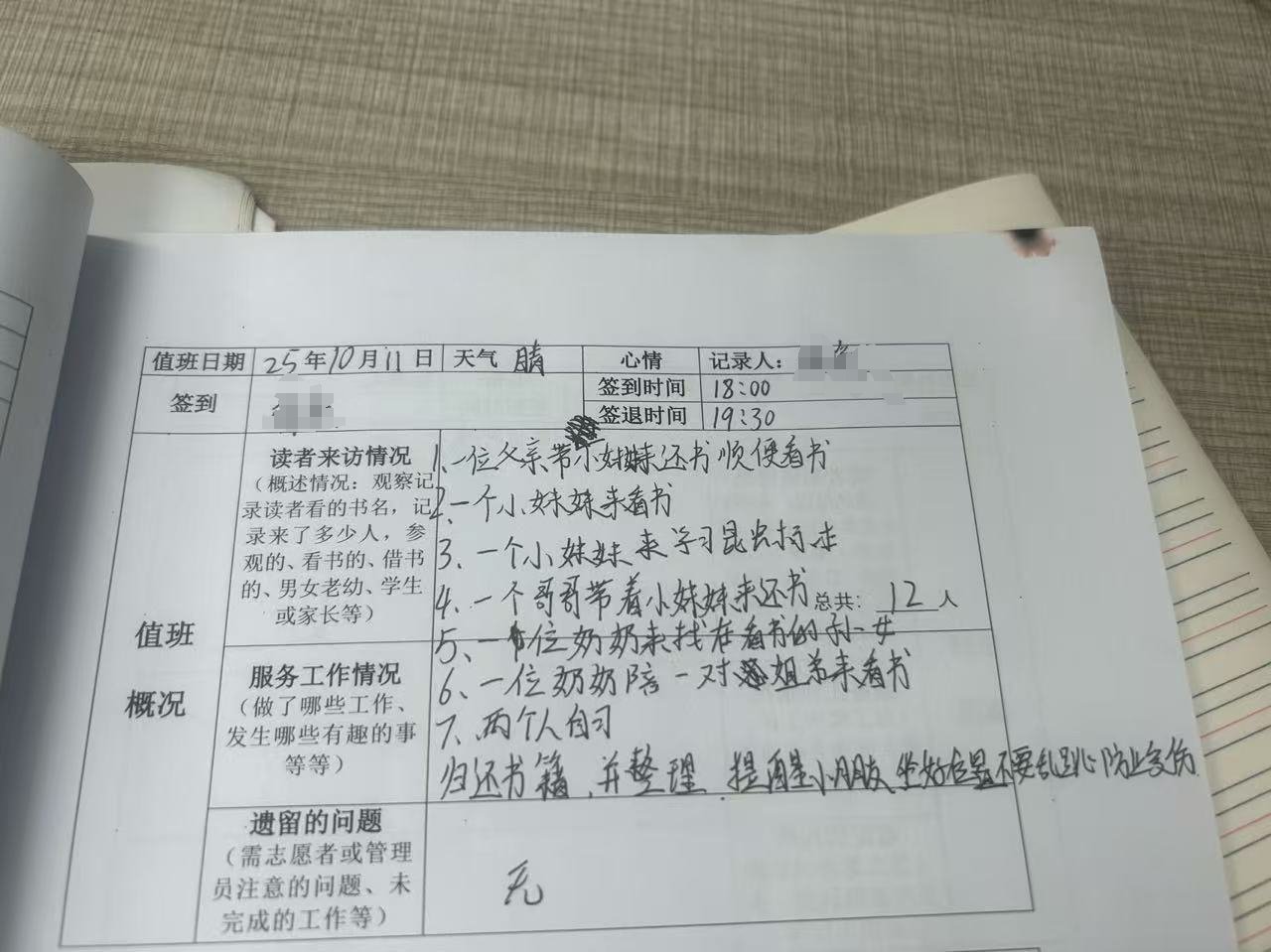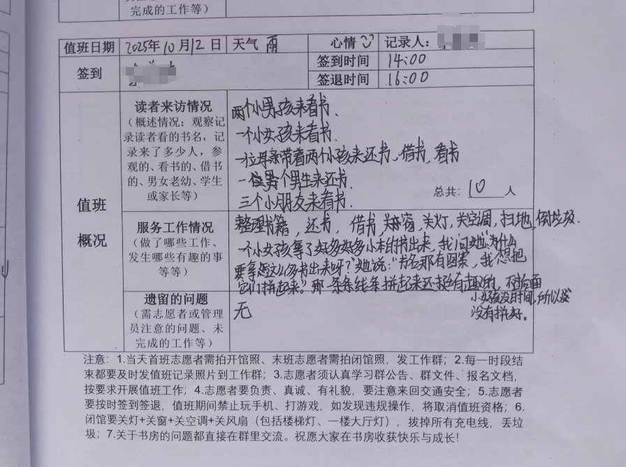 最近有位大学生志愿者林来值班,看到她会看前面志愿者的遗留问题的记录,解决了会写上已解决,并拍照发群里,这是多么理想的志愿者啊!!!通过监控看到有位小读者在书房里蹦蹦跳跳很开心的样子,问是什么事。她说,“小读者刚刚想玩手偶,我说还有人在看书还不能玩,他在等人走,让他先看书了”,我说不吵闹也没关系吧,结果这位小朋友“他玩手偶喜欢喊口号,偷袭抓住之类的”哈哈哈哈,优点是她听劝哈哈哈,志愿者姐姐不让玩、让看书,他也听话了。这位林志愿者还观察小读者看书的情况,了解到小读者玩书的过程,说了什么话,和小读者共同经历着欢喜。值班登记表也是写得密密麻麻的,在她的影响下,周日的值班登记都是密密麻麻的哈哈哈哈,这算不算“近朱者赤”。