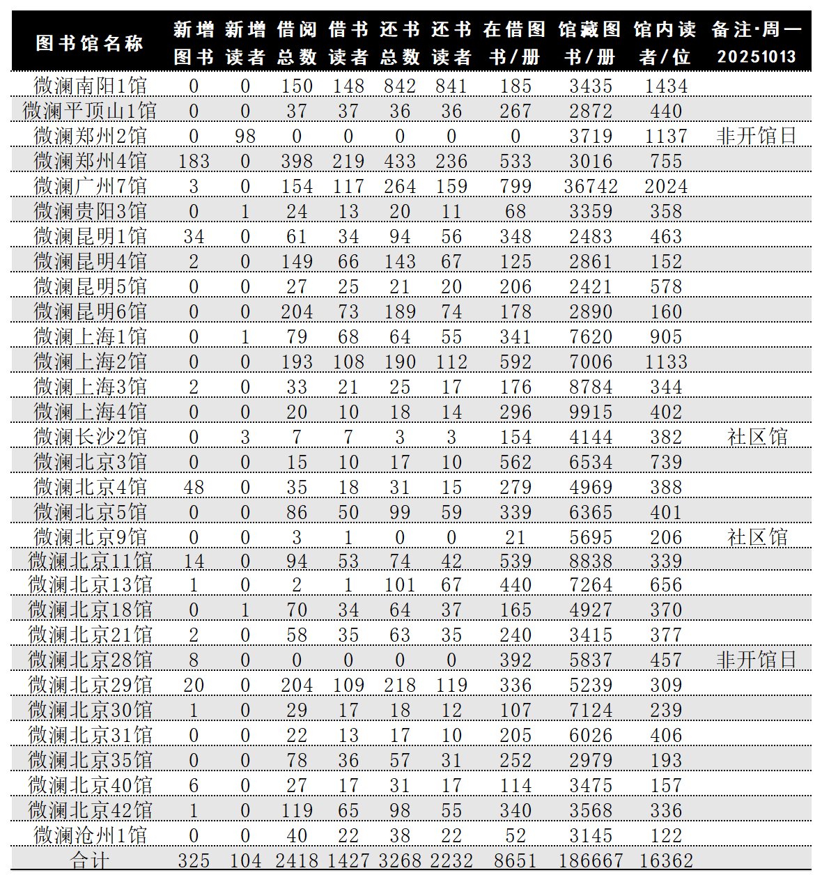 各馆数据日报20251013/周一: