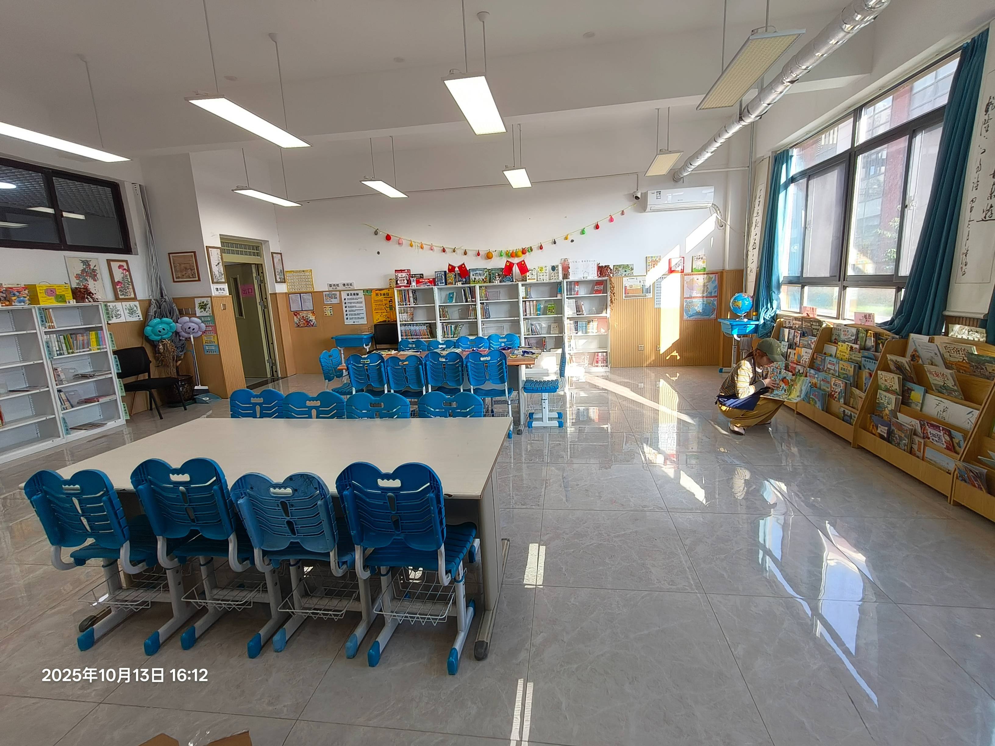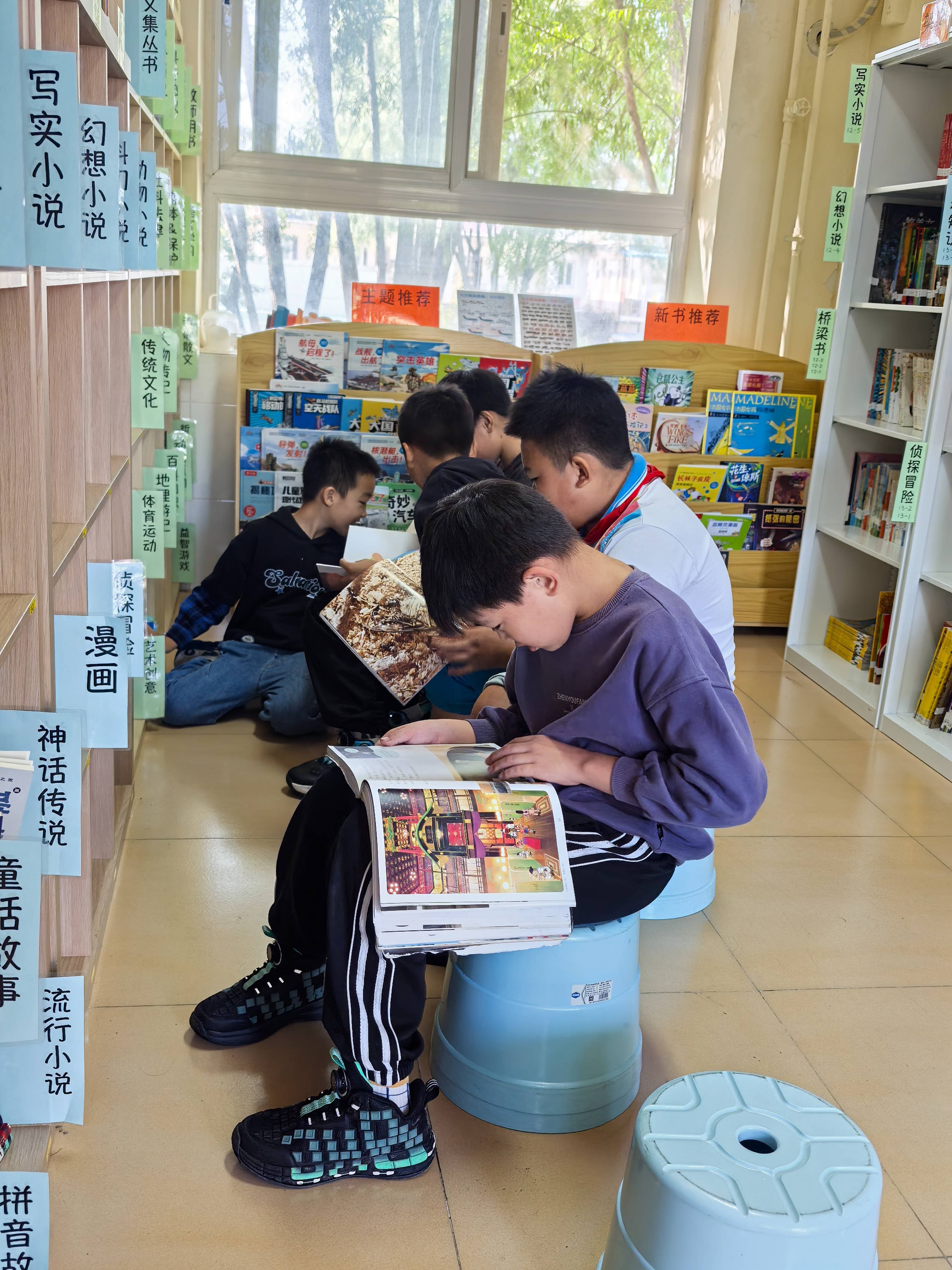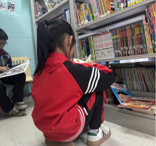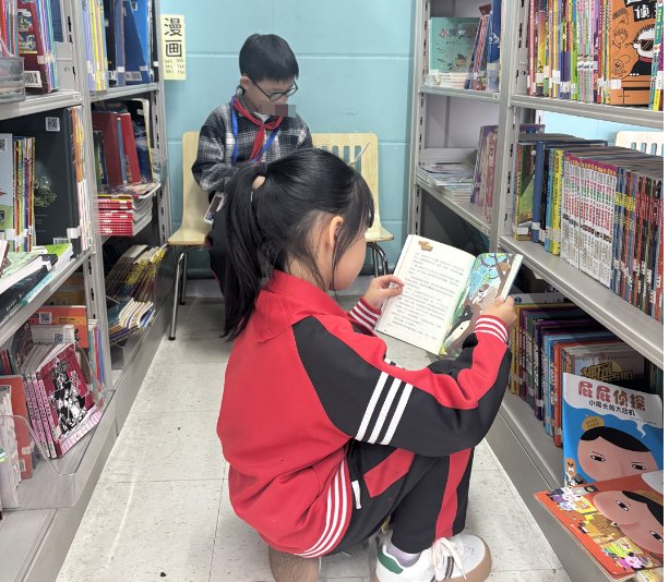 中午吃完饭迎来了高峰,和其他馆不同的是,学校似乎对午休时间没什么硬性要求,孩子们活动比较自由,来看书的也不少。虽然有些读者进来打打闹闹的,加以引导后还是能静下心来翻一翻书,阅读氛围很好,反而是走廊里的打闹比较吵。