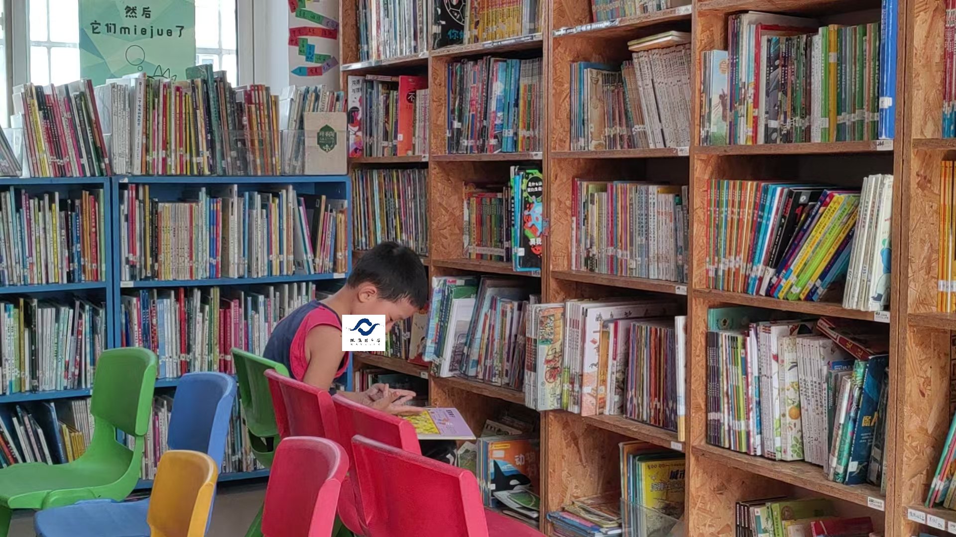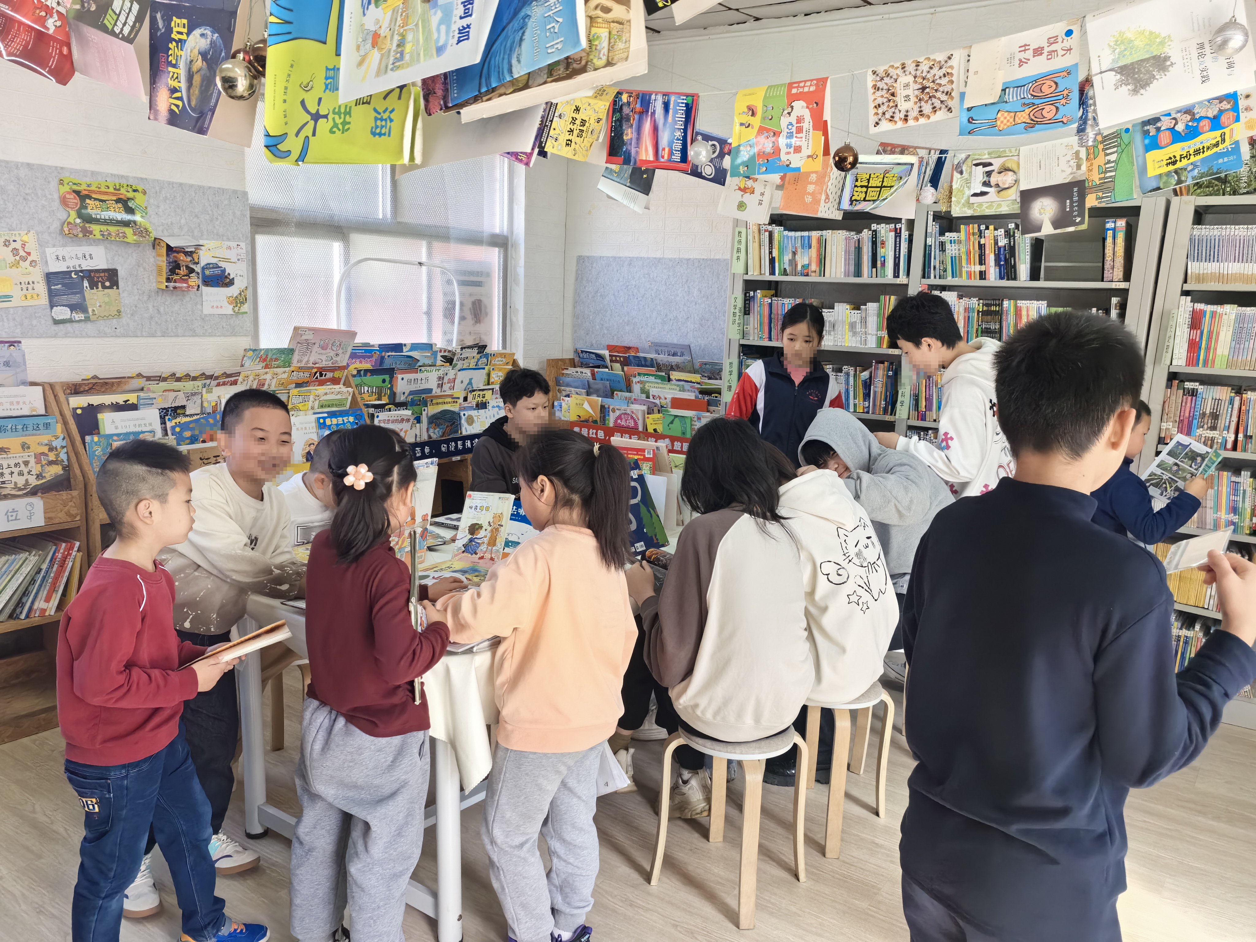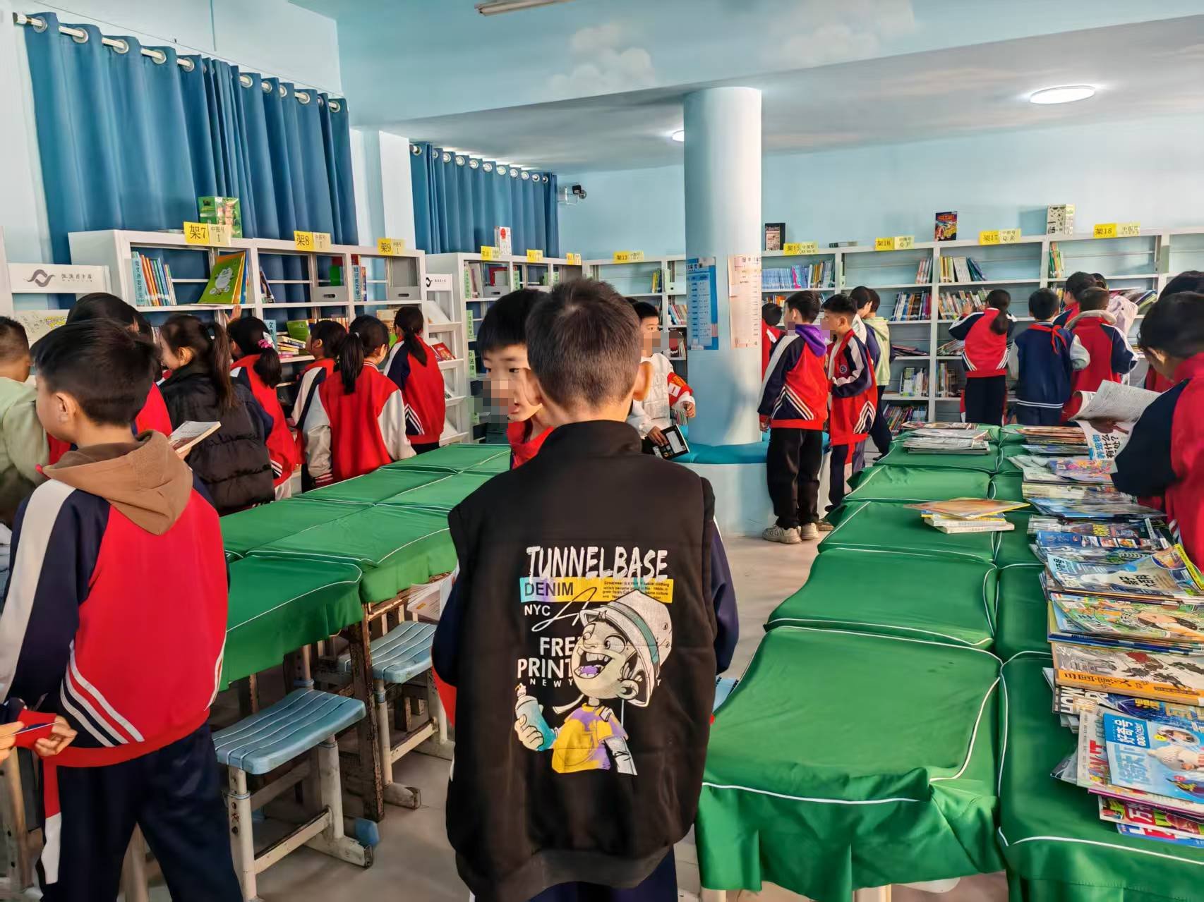 中午吃完饭迎来了高峰,和其他馆不同的是,学校似乎对午休时间没什么硬性要求,孩子们活动比较自由,来看书的也不少。虽然有些读者进来打打闹闹的,加以引导后还是能静下心来翻一翻书,阅读氛围很好,反而是走廊里的打闹比较吵。