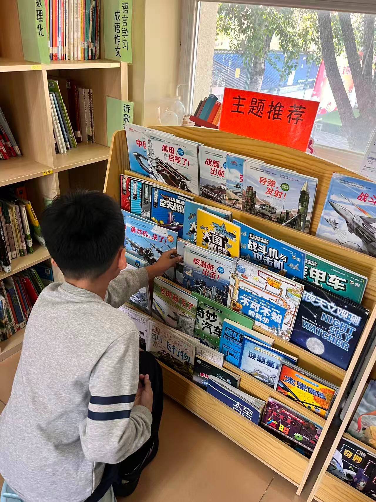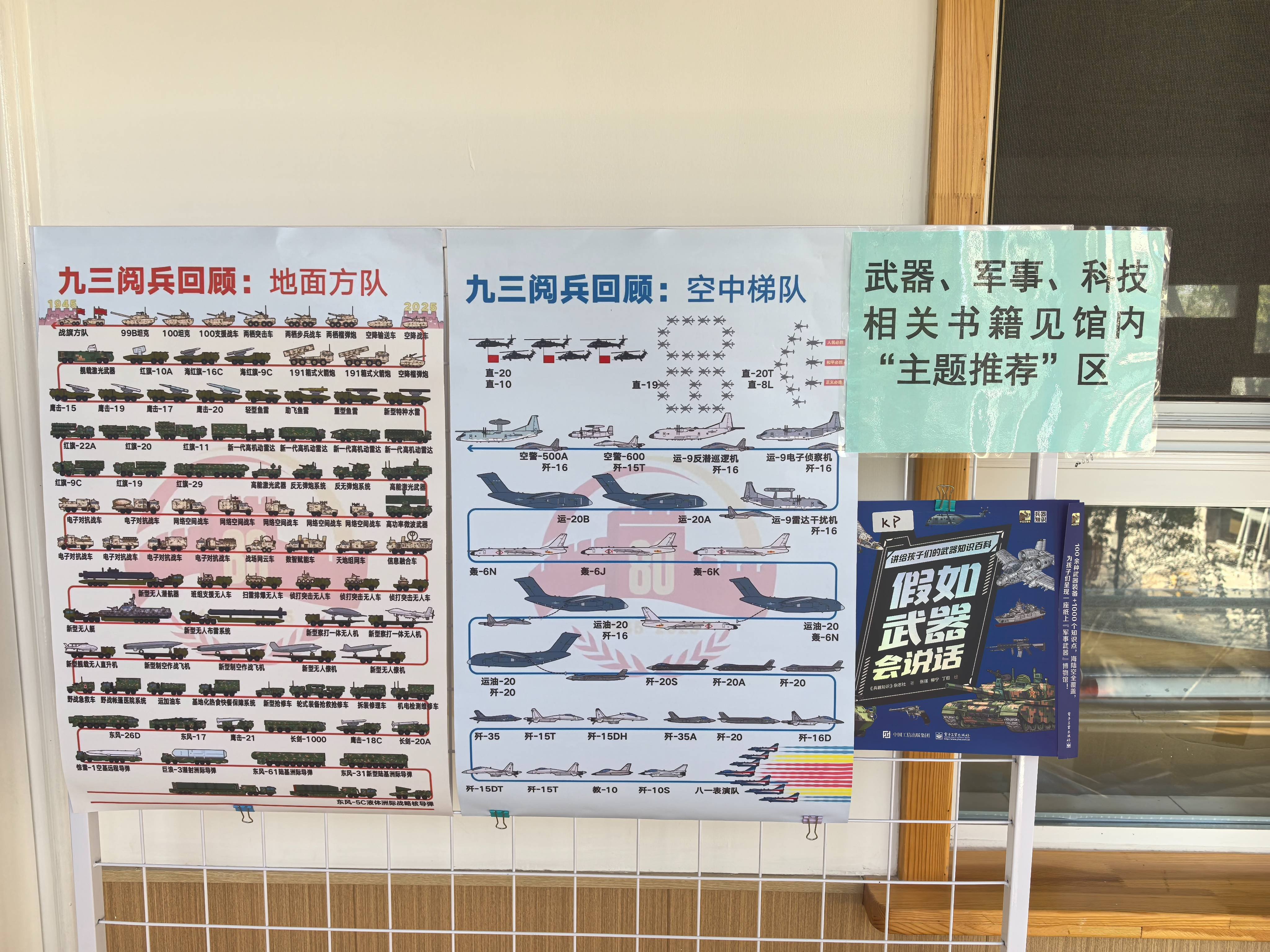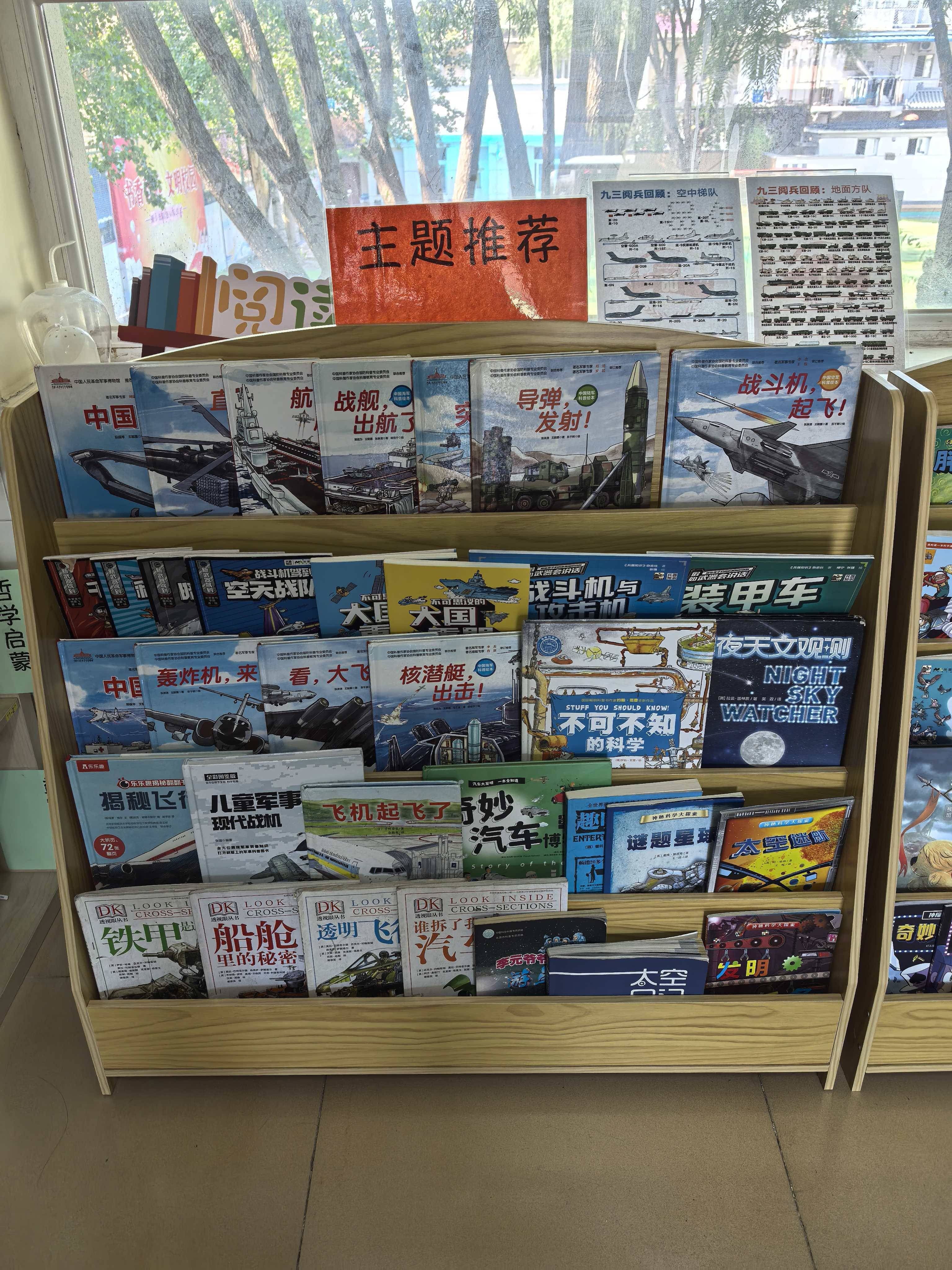 今天,和颖一起值班。跟34馆学习后,趁着国庆节和九三阅兵的热度未减,在35馆也搞了个九三阅兵主题图书推荐。我在馆外布置好了九三阅兵主题图书推荐的展板,颖在馆内的主题推荐区摆放相关书籍。孩子们看到馆外展板上九三阅兵主题的推荐海报后,一股脑冲进馆里,把正在主题推荐区摆放相关图书的颖团团围住,争抢和九三阅兵主题相关的图书。看到孩子们对这个主题这么感兴趣,还是蛮开心的。