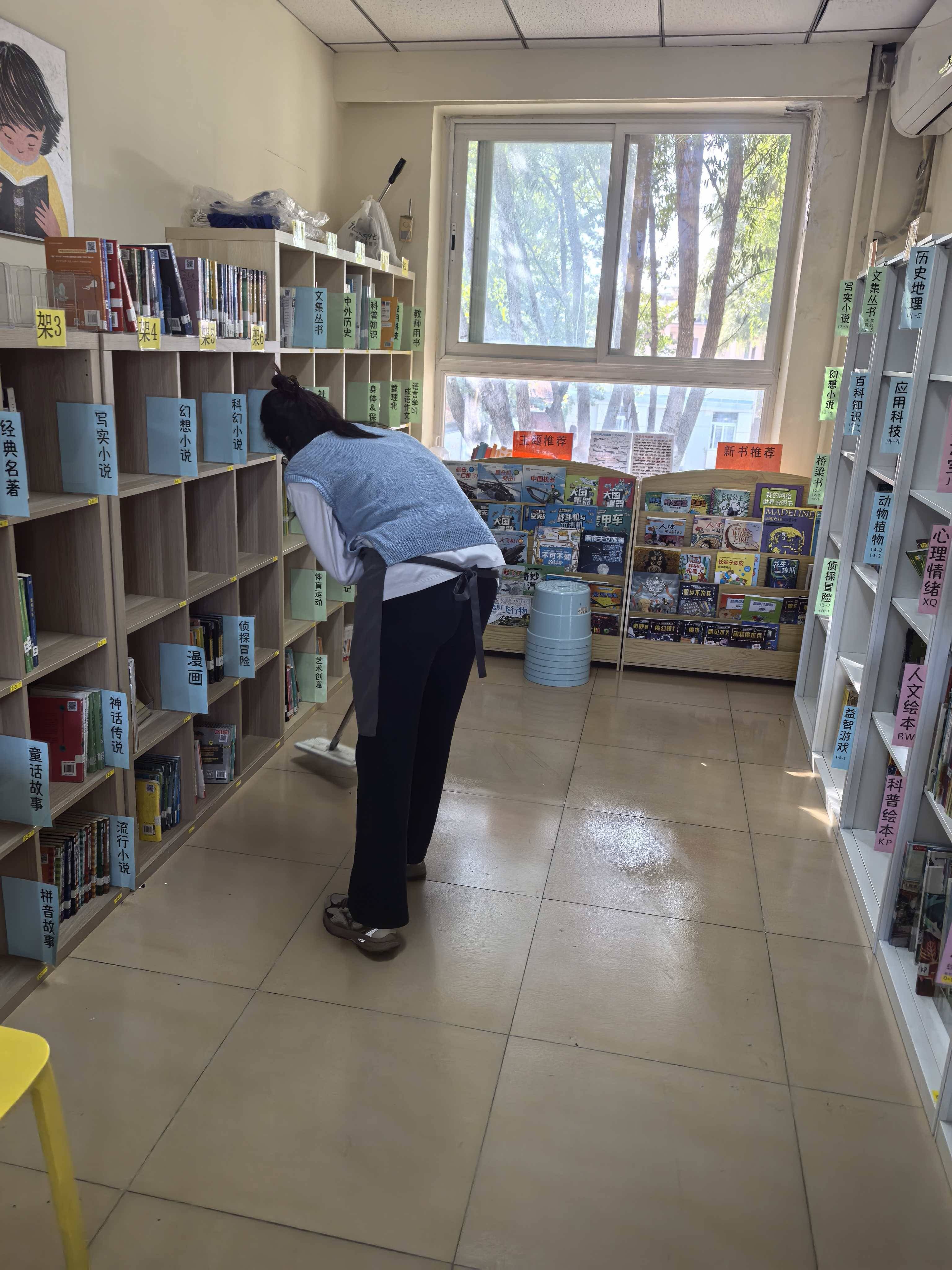 修补破损图书若干,整理书架,闭馆前清理了地面卫生。