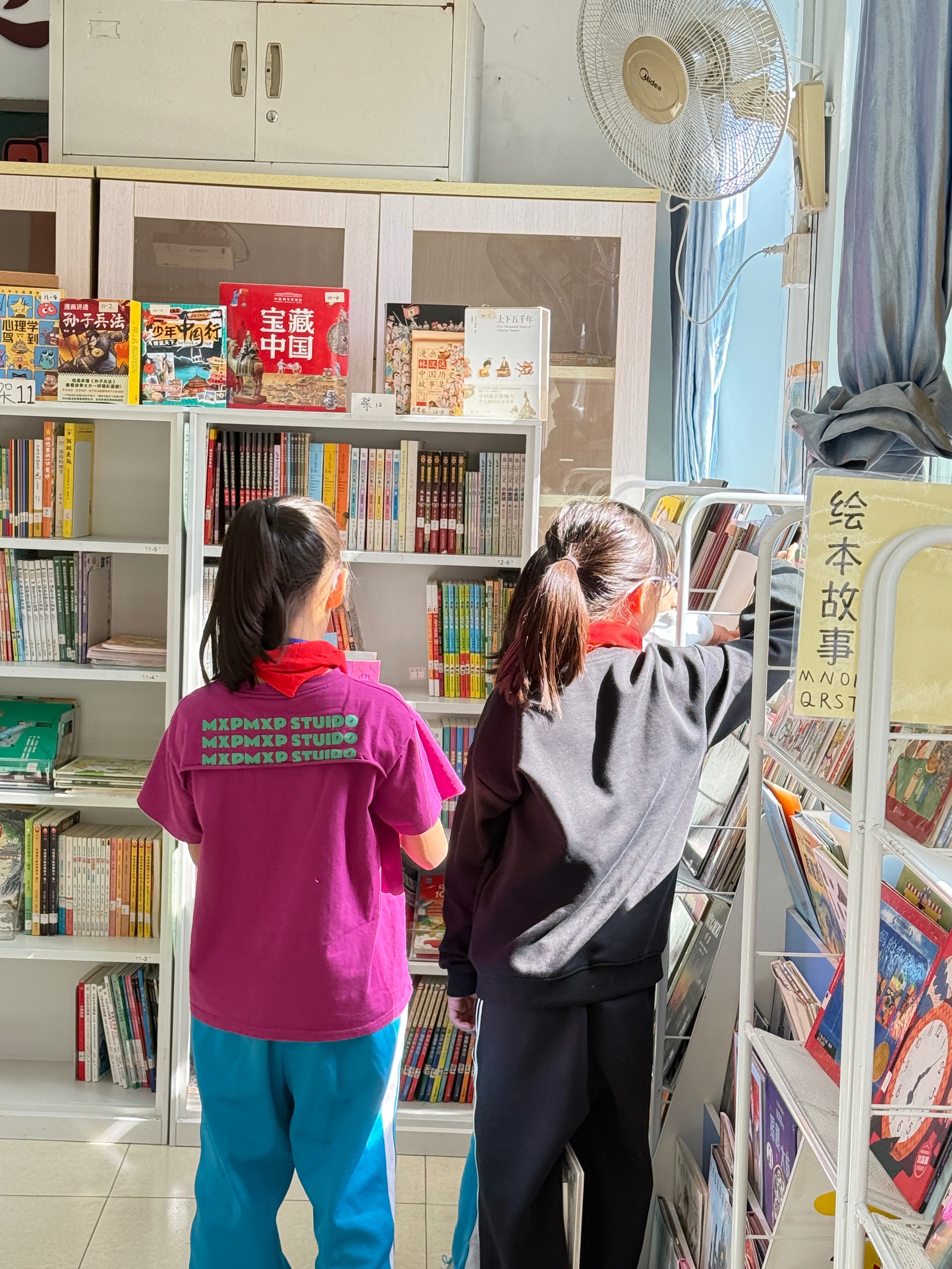 因为发校服,课间操好像取消了,五年级几位女生挤在书架边说她们都看过什么书,有位同学指着10-3、11-3的位置,说这排的书她基本都看过,大概明白了她的兴趣,就找出漫画版《安妮日记》问她是否看过,旁边的同学手快借了去。