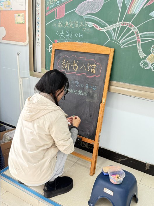 新到的书封边儿、贴签儿、录入,一气呵成。搭档WYR写了新书讯息在黑板上,方便同学们查阅。