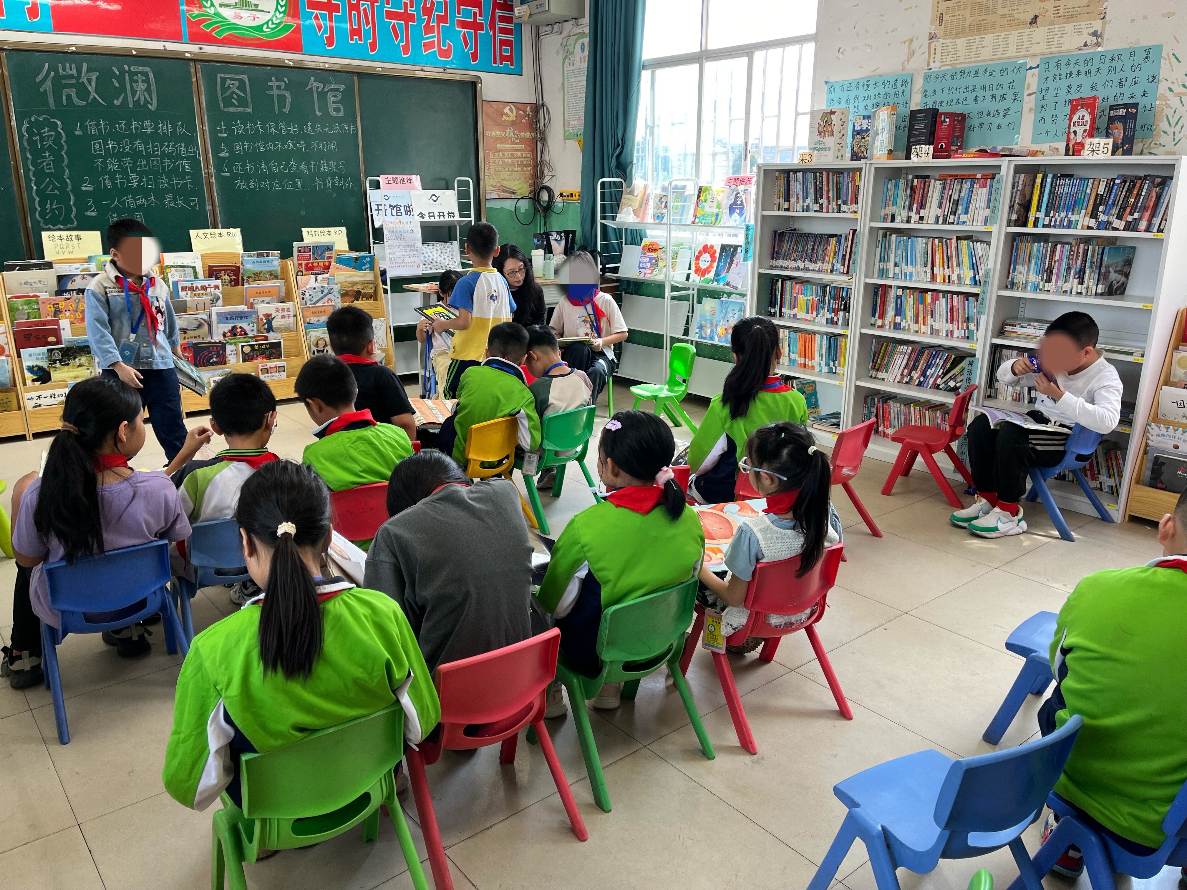午饭后一年级2班部分同学进馆读书,秩序还好,需要控制说话音量。