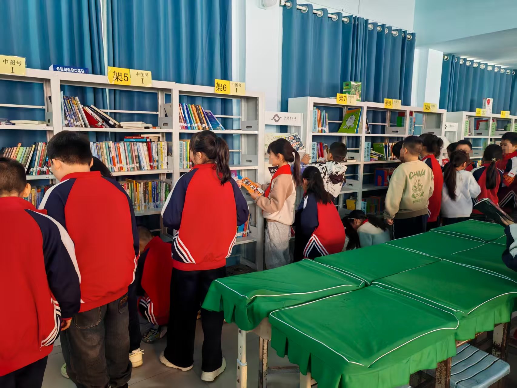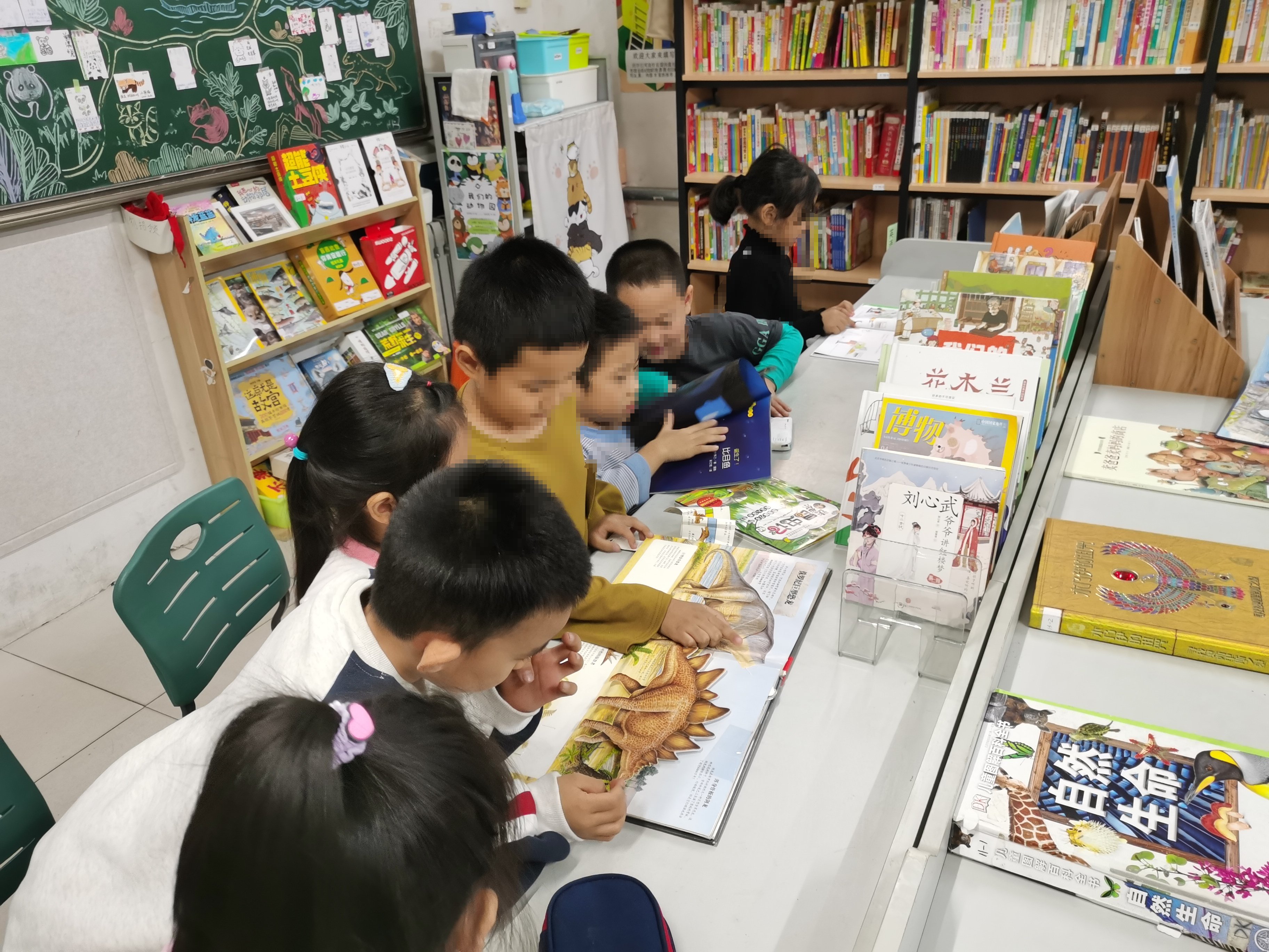 今天和立军老师、方老师一起搭班。早上一开馆,一年级的孩子们就冲了进来,迅速占满两排桌子,相当热闹。