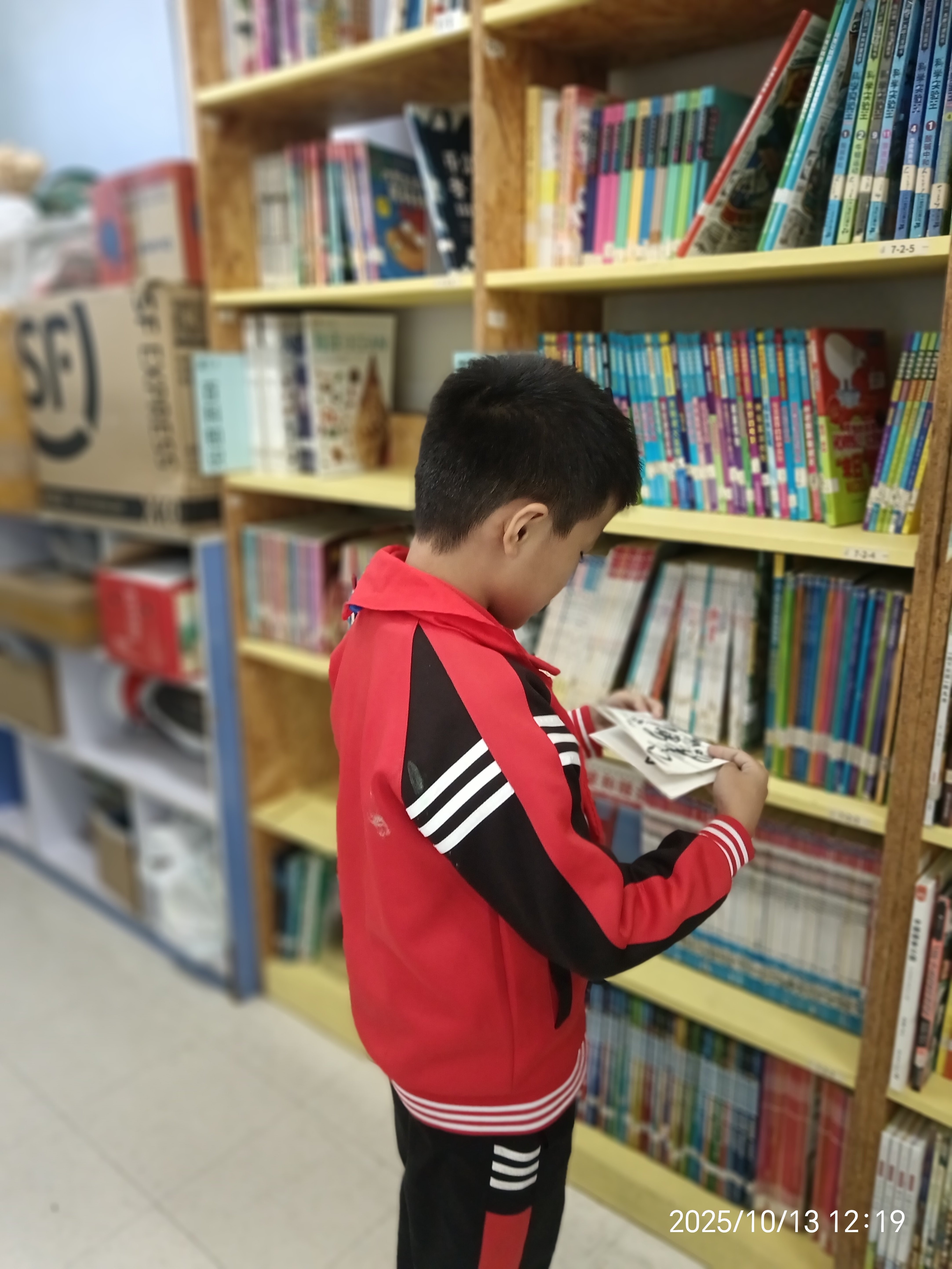 今天第一次服务,北京18馆的两位张蕾老师和立军老师很热情,给我详细讲解了各种事宜。课间和中午,孩子们来借书的很多,我也熟练了借还的操作。有些同学在书架前转来转去,我也去询问孩子的需求,尽量给他们推荐一些适合的书籍。整理了一层书架,科学类的几套绘本,按照序号排列。