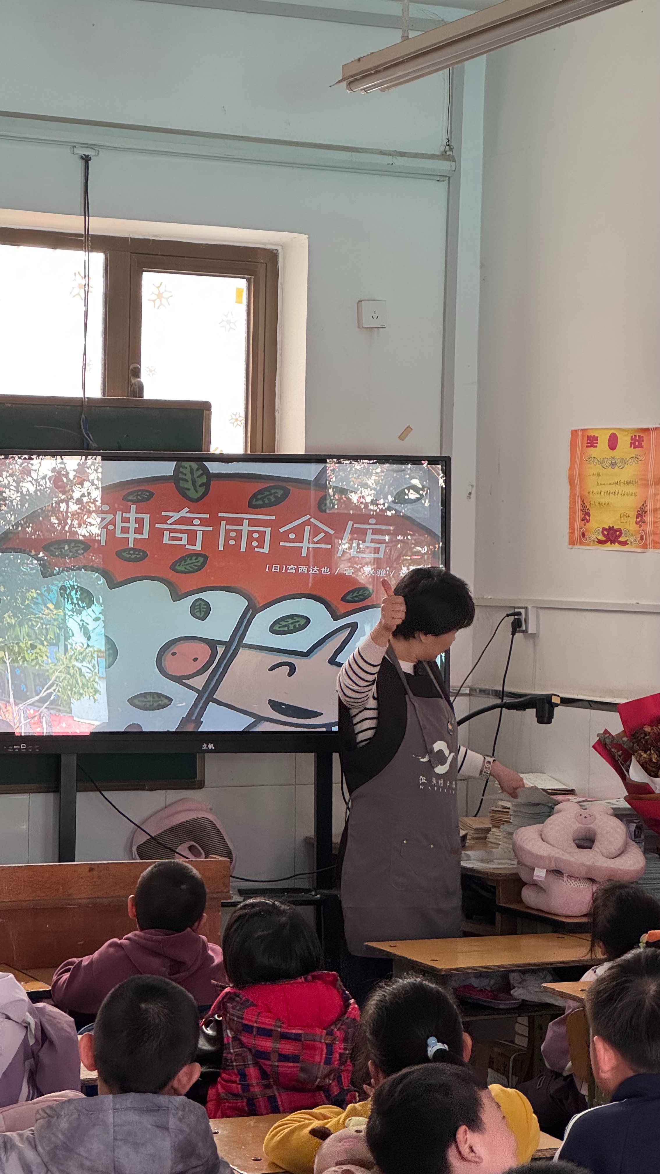 LJ到一年级4班宣讲图书馆注意事项,读了绘本《神奇雨伞店》。班级秩序非常好,小同学们对绘本的接受度很高,并有互动。