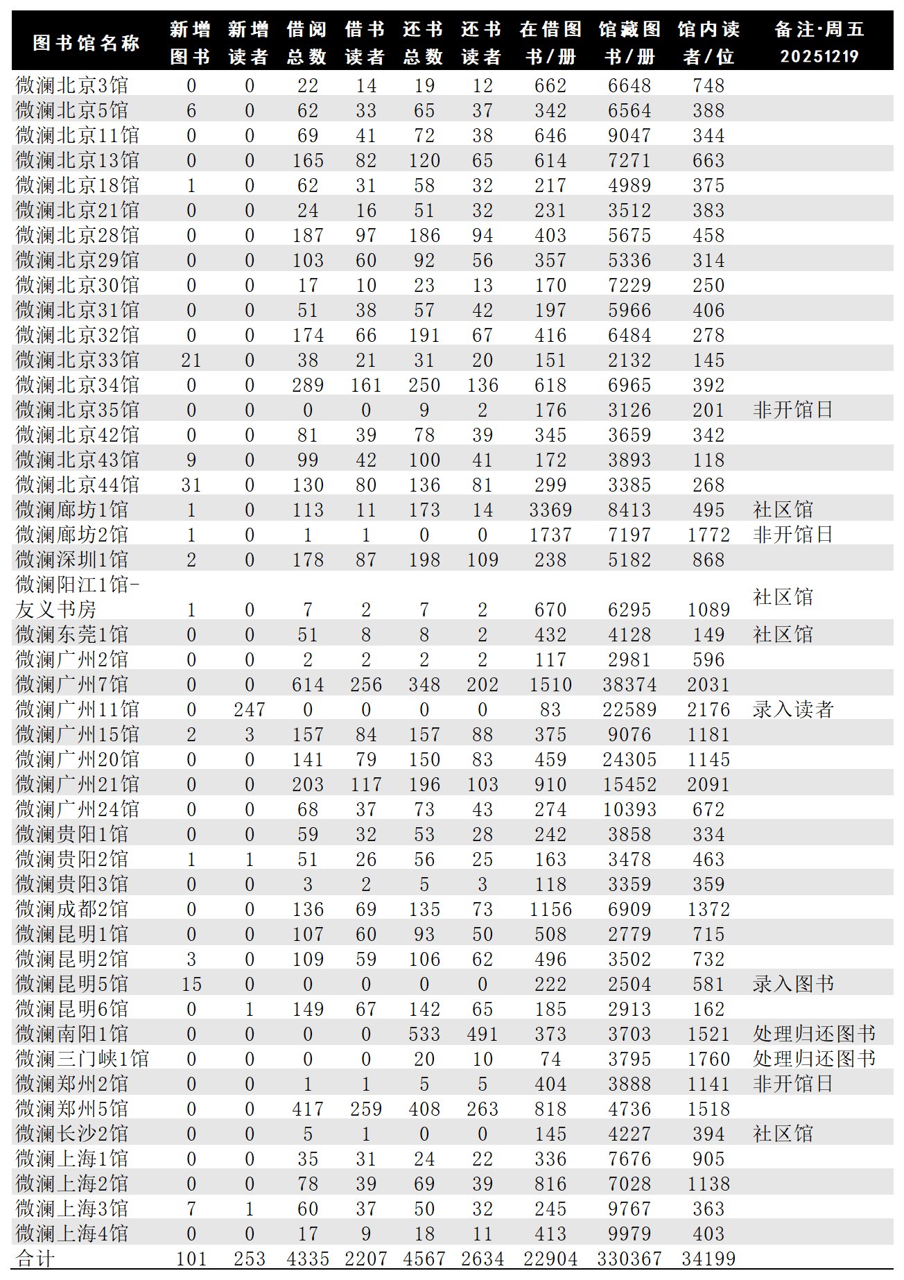 41家馆日常开放借阅,为2207位读者借阅图书4335册次,处理归还图4567册(2634人);13家馆购买/受捐/学校馆藏等录入上架图书101册,5家馆录入新读者253位。
