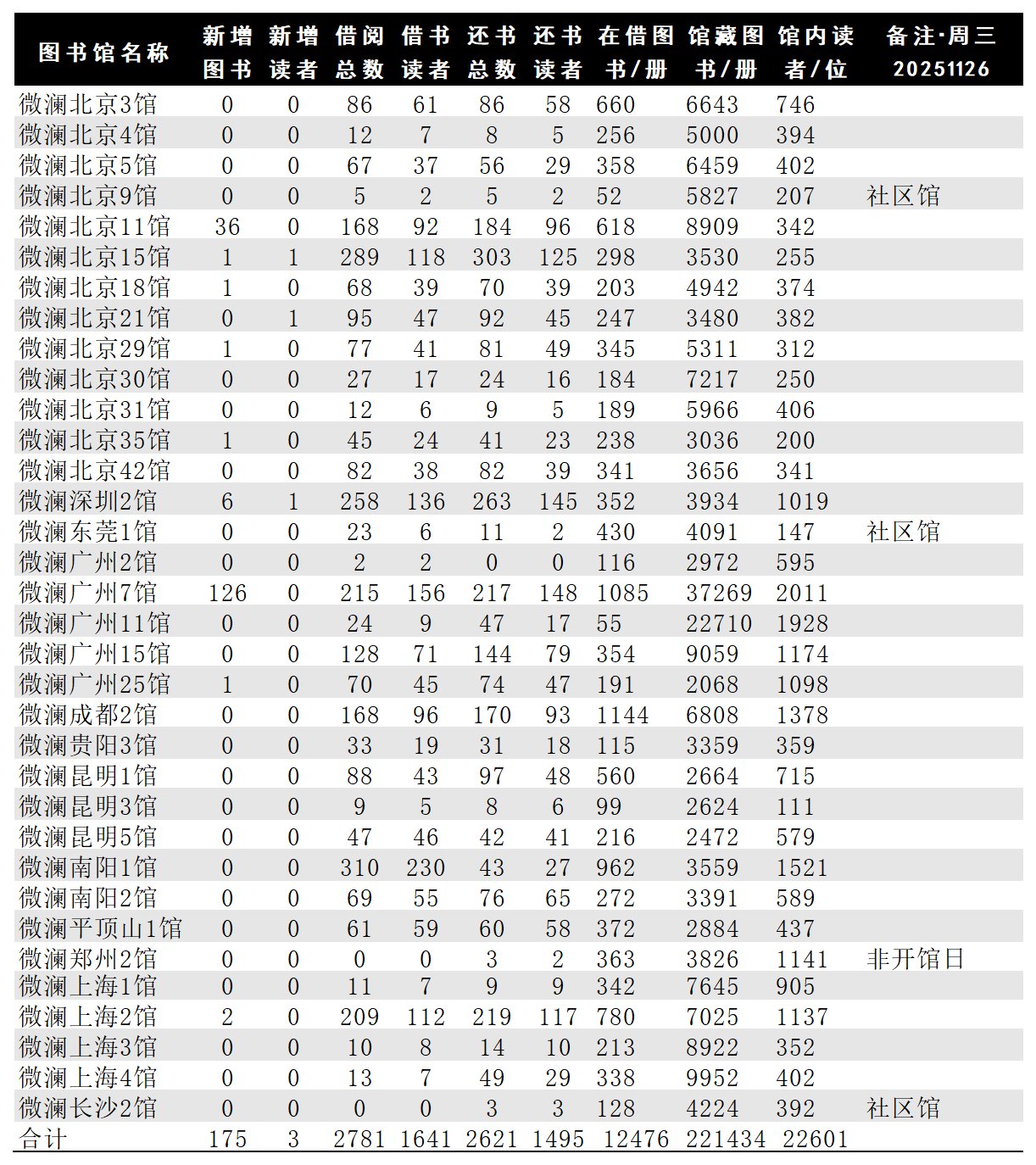 33家馆日常开放借阅,为1641位读者借阅图书2781册次,处理归还图2621册(1495人);8家馆购买/受捐/学校馆藏等录入上架图书175册,3家馆录入新读者3位。