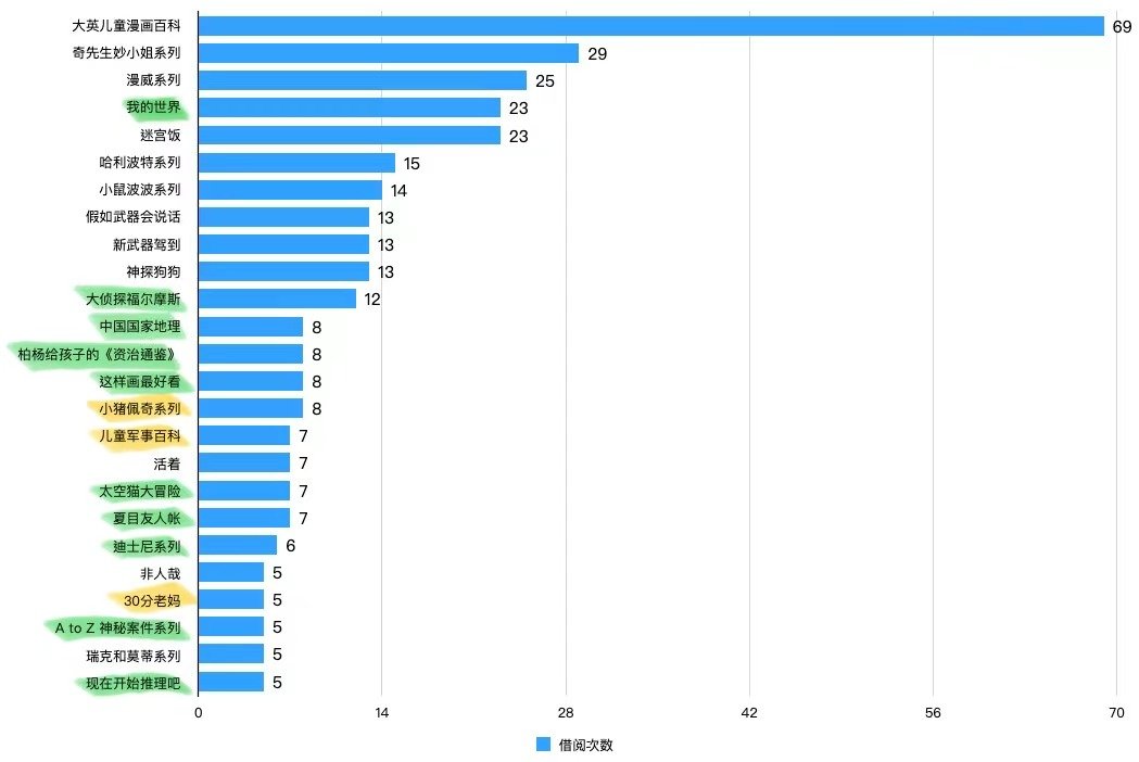 借阅较多的图书系列如下,其中本月新上架图书系列4个(黄色底标出),以往馆藏图书系列较上月新入借阅榜7个(绿色底标出)【值得注意的是,不同书的入库时间不同,展示时间也不同;同时部分书籍受欢迎且较厚,容易“一借很久还”;而系列书则因为册书多,能够同时被多人借阅,因此借阅少不代表不受欢迎】: