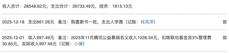11月,扣除平台管理费后,广州24馆月捐收入997.49元,新书支出661.26元,详情可见馆内账目。
