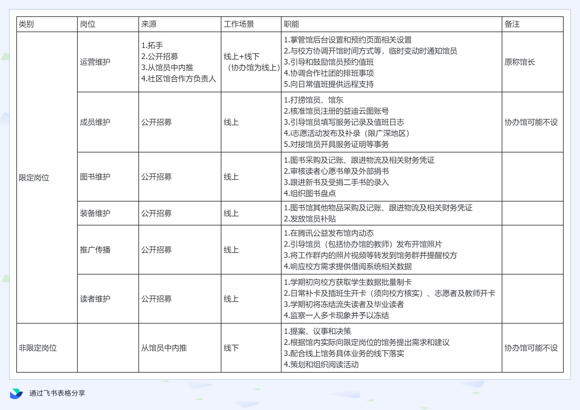 (2)老馆遵循自愿原则,有需求的的馆,可提出申请 ,大本营支持重新梳理分工,优先从现有馆务、馆员中确认/招募伙伴承担限定岗位,如仍然有岗位空缺,由岗位小组招募支援