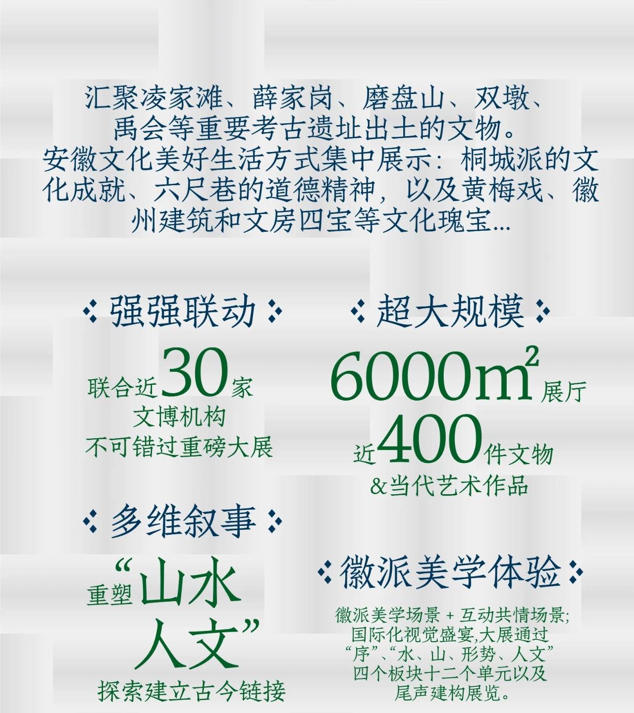本次展览以6000平方米的宏大空间,汇聚近400余件跨越古今的珍贵文物与艺术精品,以文物和历史视角展现了徽州文化、长江文化、淮河文化、大运河文化及黄梅戏文化,阐释安徽独特的历史底蕴与文化多样性。