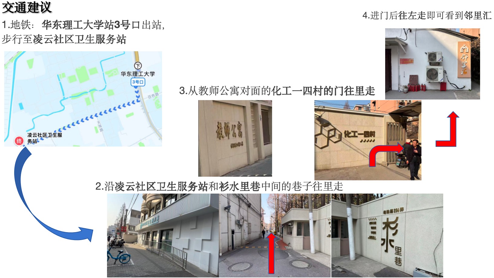 2、(1)地铁15号线:华东理工大学站3号口出站;(2)导航步行至凌云社区卫生服务站;(3)沿凌云社区卫生服务站和衫水里巷中间的巷子往里走;(4)看到教师公寓和化工一四村,从化工一四村的小门进入;(5)往左走即可到达邻里汇