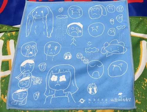 在微澜图书馆的绘本课上,会有认识、表达与拥抱情绪的专题;手帕上的插画,来自微澜成都2馆二年级小读者们在绘本课上画的哭脸(见上图)。