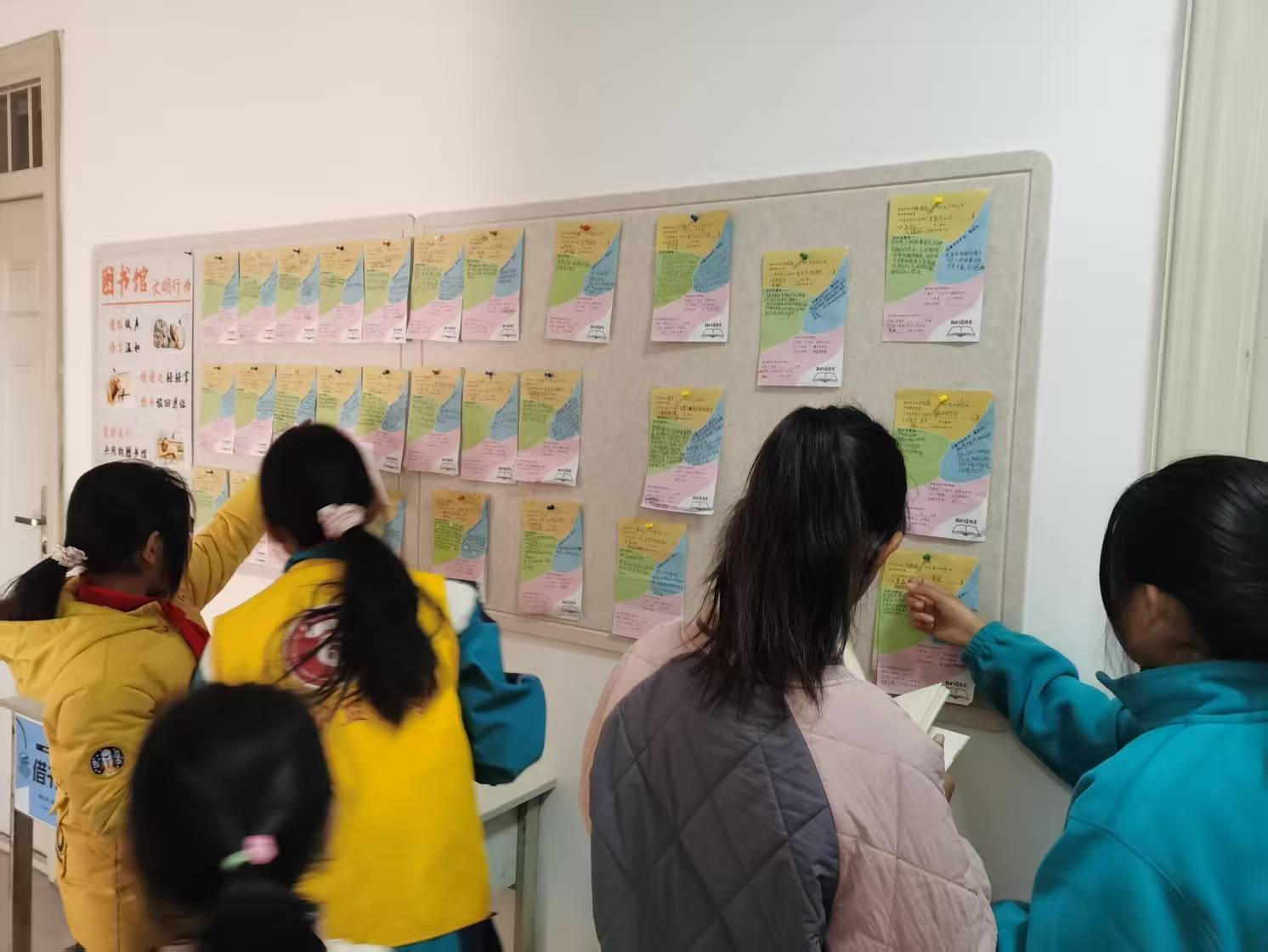 今天图书馆来了许多低年级的小同学,他们凑在一起,开心地翻阅着感兴趣的图画书,你一言我一语的讨论着。高年级的同学则兴奋不已的和同学一起讨论推荐的书单,大家对这个活动都非常的感兴趣。