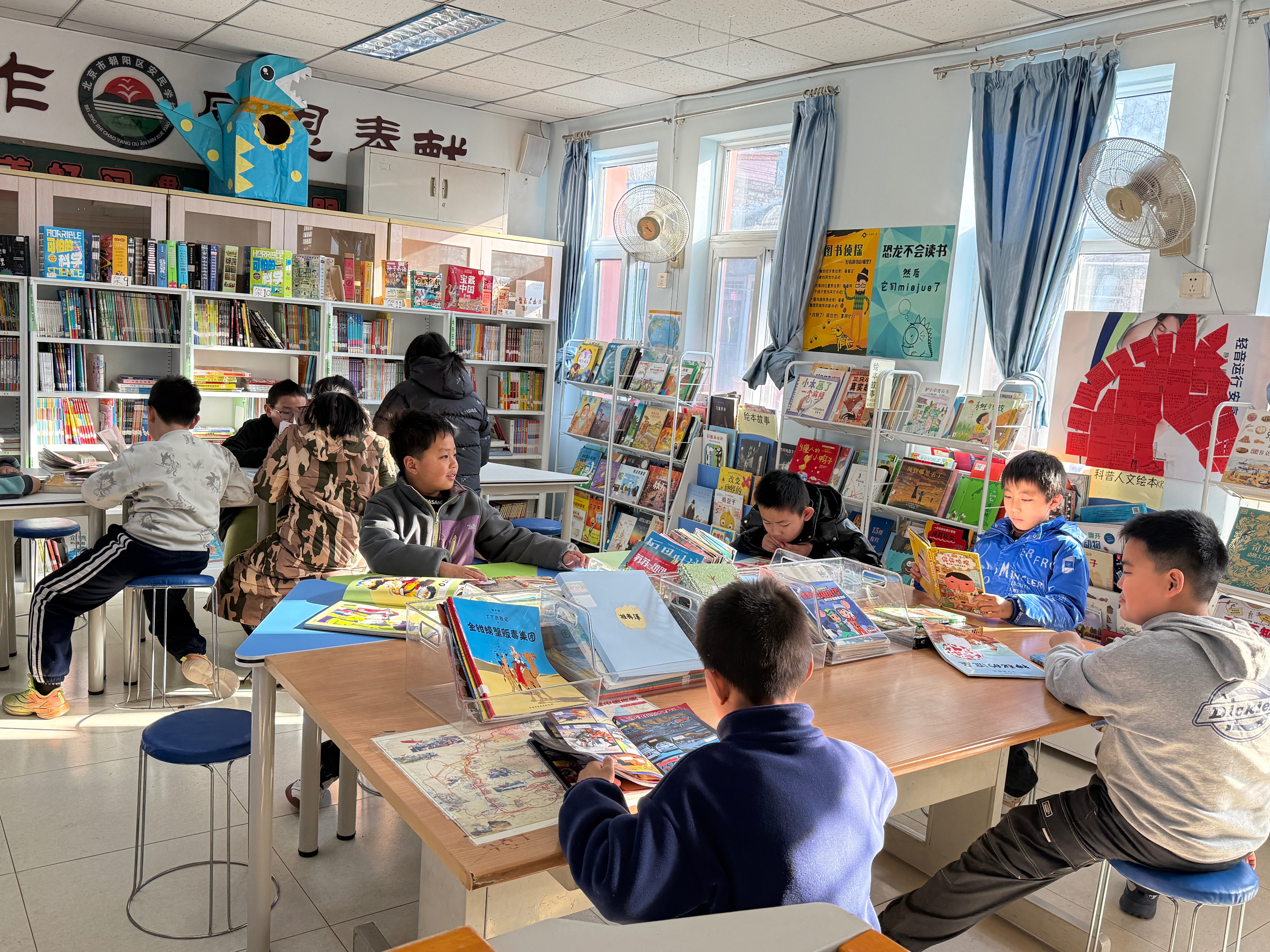 听说今天是这个学期最后一次借书了,课间也零星有孩子来借书看书,有一位同学自发的来了两次,虽然每次看的时间有限,但每次都很专注,真的是喜欢看书。有的老师对于阅读很重视,会抓紧上课前的几分钟带班里的孩子们来借书。虽然有暖气,现在图书馆里还是有点冷,志愿者们来的时候需要穿厚实一些,尤其是脚底保暖