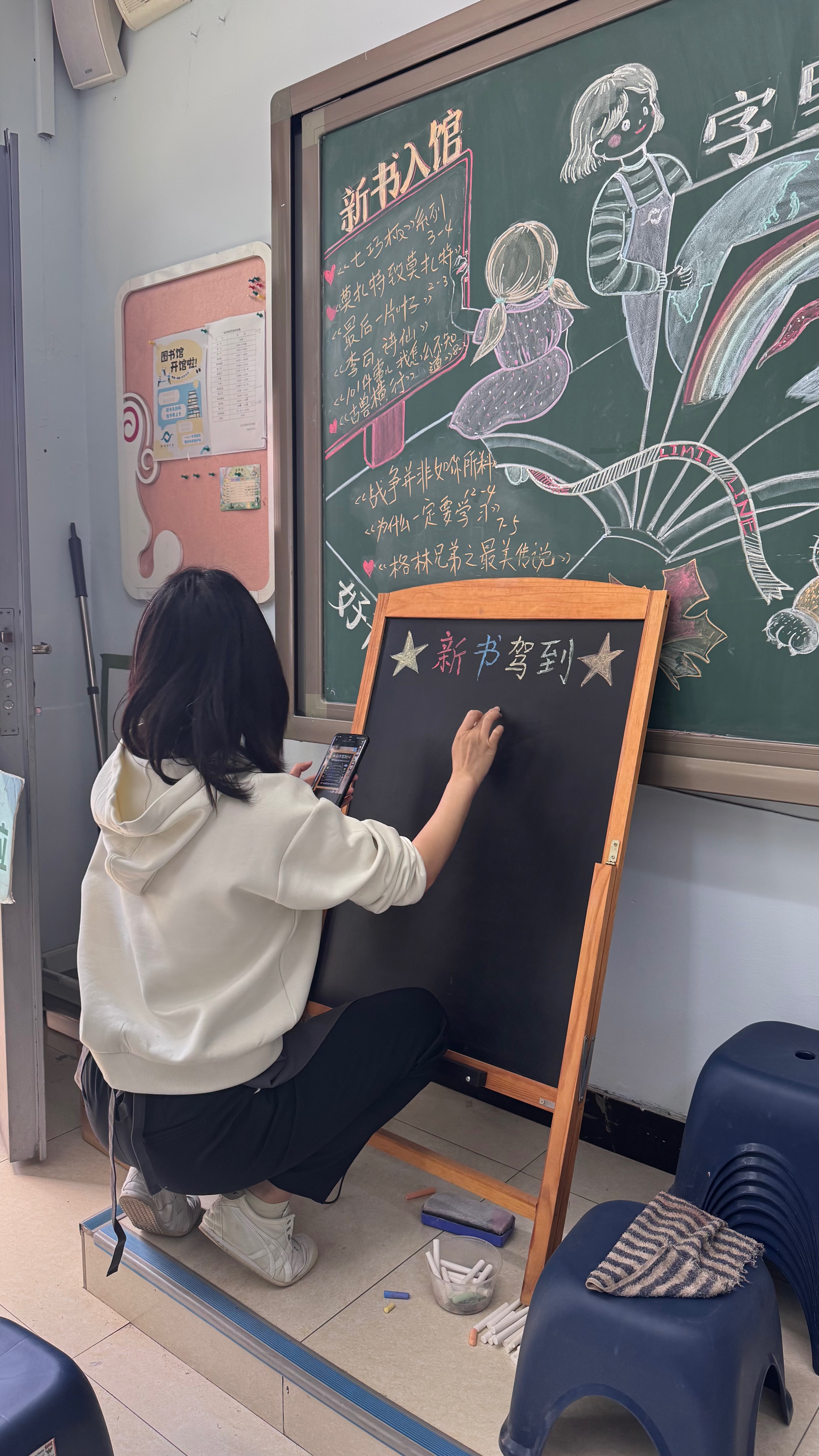 今天来到40馆服务,和新结识的刘老师搭伴,很开心,也很充实,收获满满。 先是整理了3个快递包裹,都是新书。完成拍照留存后,和刘老师一起对这批新书进行分类整理,准备上架。我们相互配合,高效完成了新书上架工作。 接下来先是低年级班级在老师的带领下,前来开展阅读、图书借还活动;下午又有五年级的同学们结伴前来读书。 因为有新书到馆,我还动手重新制作了新书推荐黑板报,虽然版面设计稍显稚嫩,不够精致完美,但也……查看更多