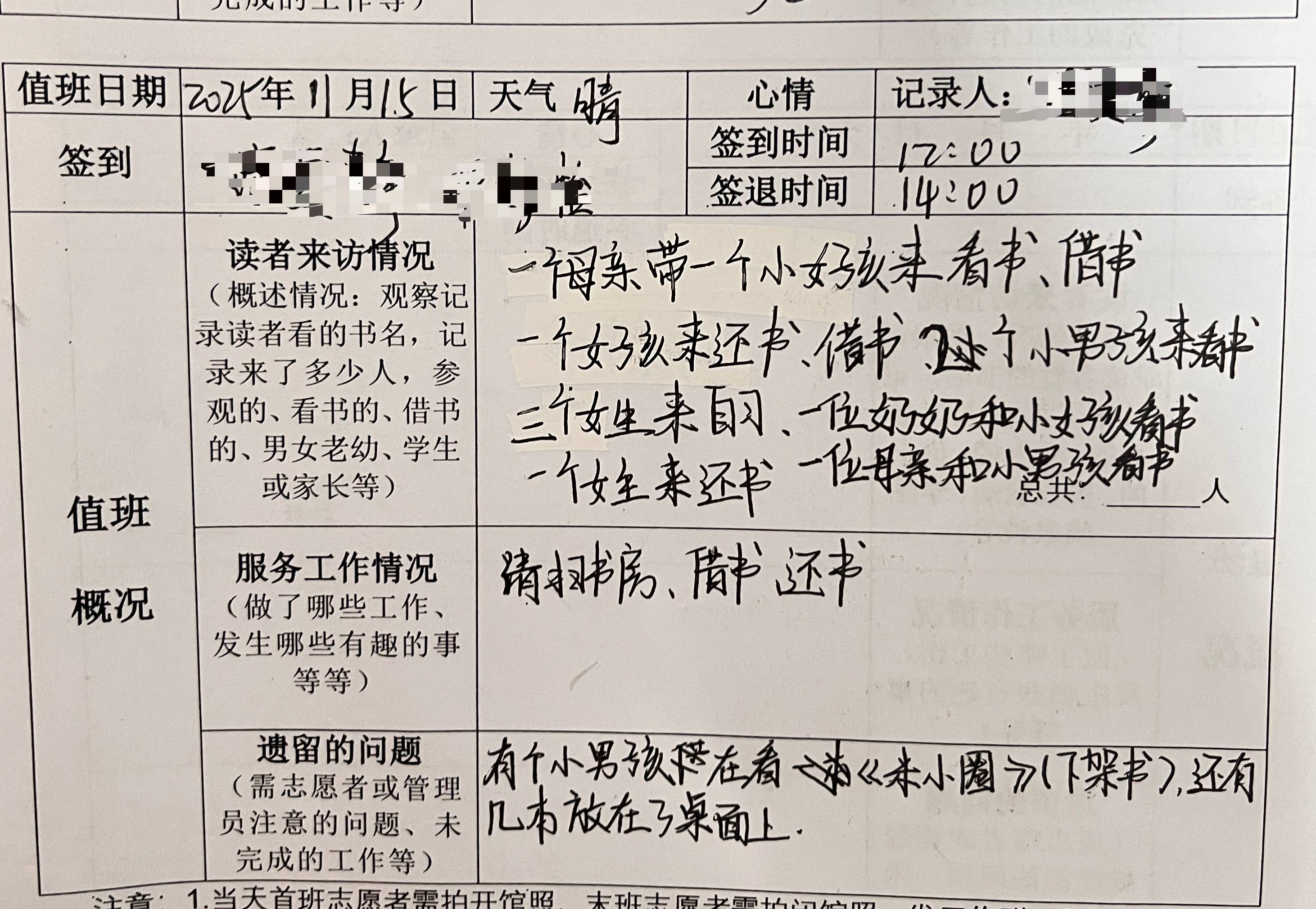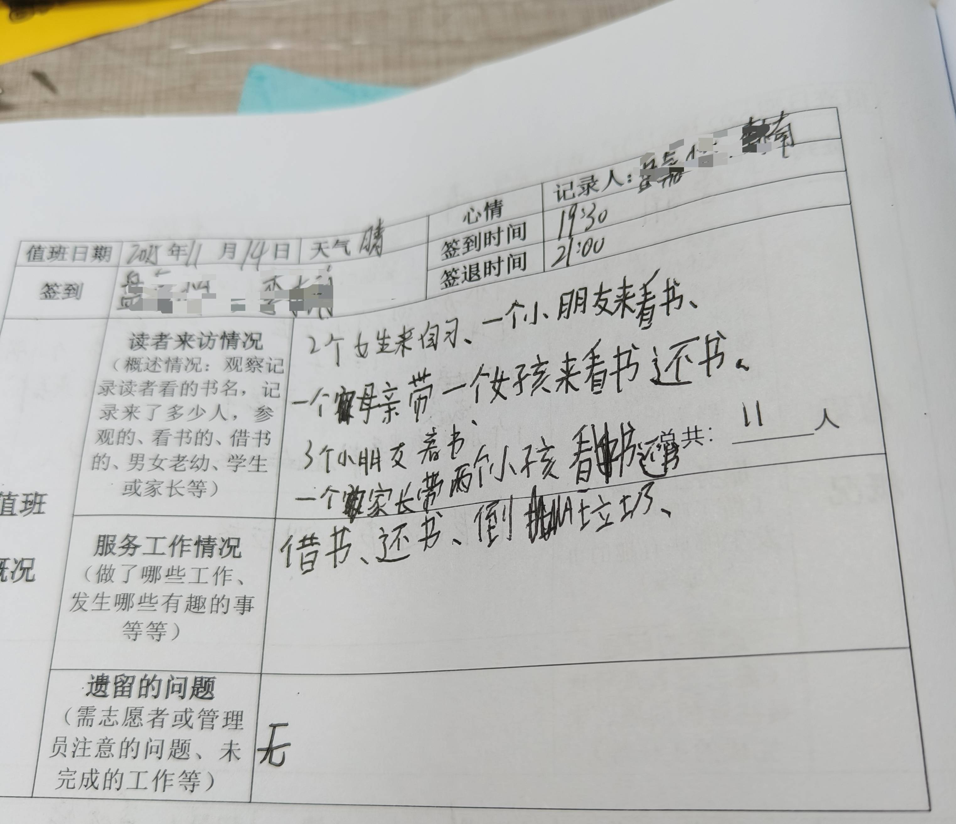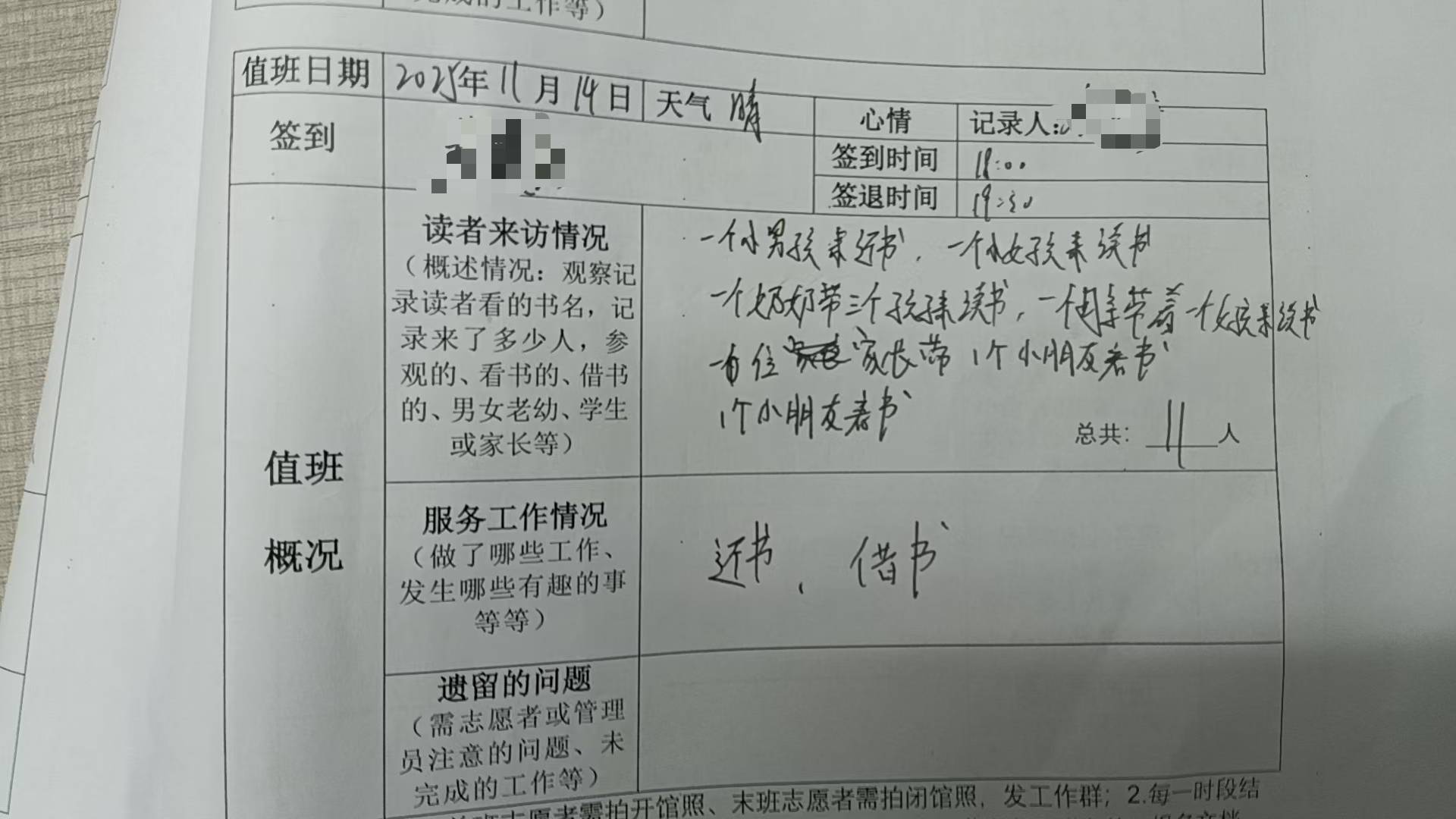 周五来得太快,有点没反应到晚上开馆,到五点多才记得发签到签退码,提醒开馆之类的。六点到七点半,还是咱们的“老”志愿者,这几周都这个时间来值班,一来二去之后感觉小朋友也成长了,从开始遇到图书问题留给下一班的姐姐志愿者到开始自己亲自处理。会主动问怎么处理问题,把益迪码丢失的书重新录入益迪码了。另外一位志愿者因为上周忘记签退多签了一个半小时时长,也在这周过来值班补回来了。七点半到九点的志愿者还是咱的最小……查看更多