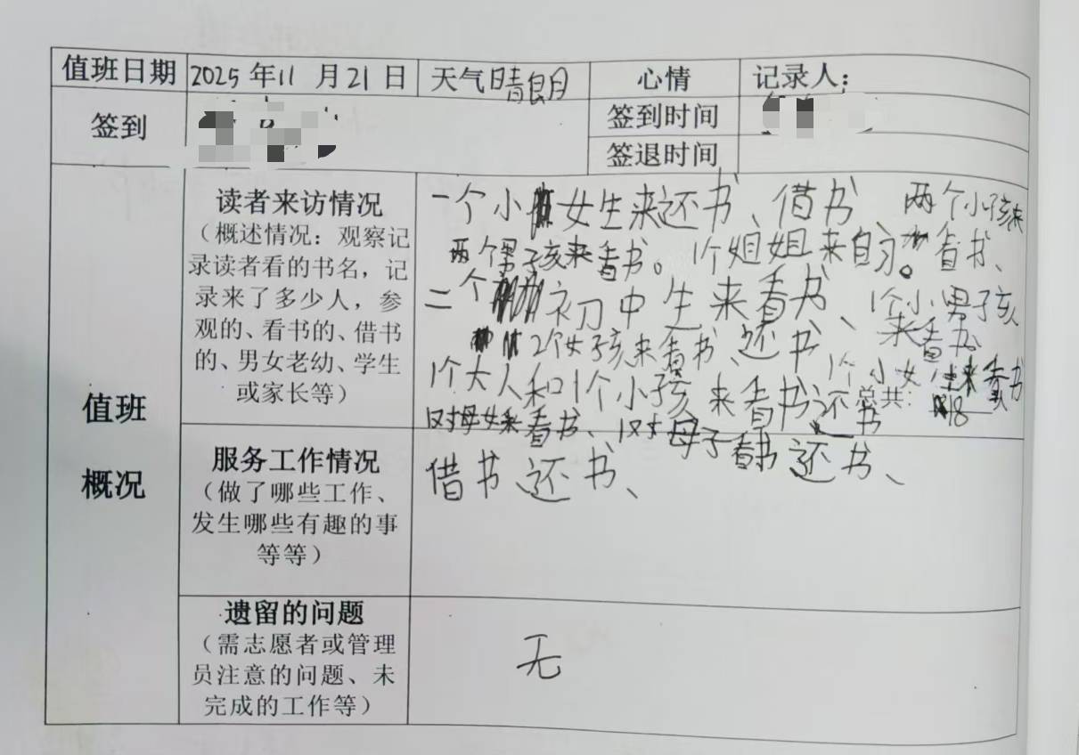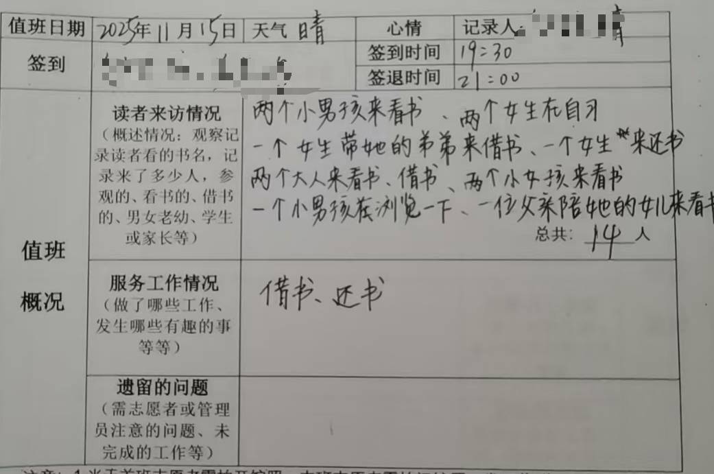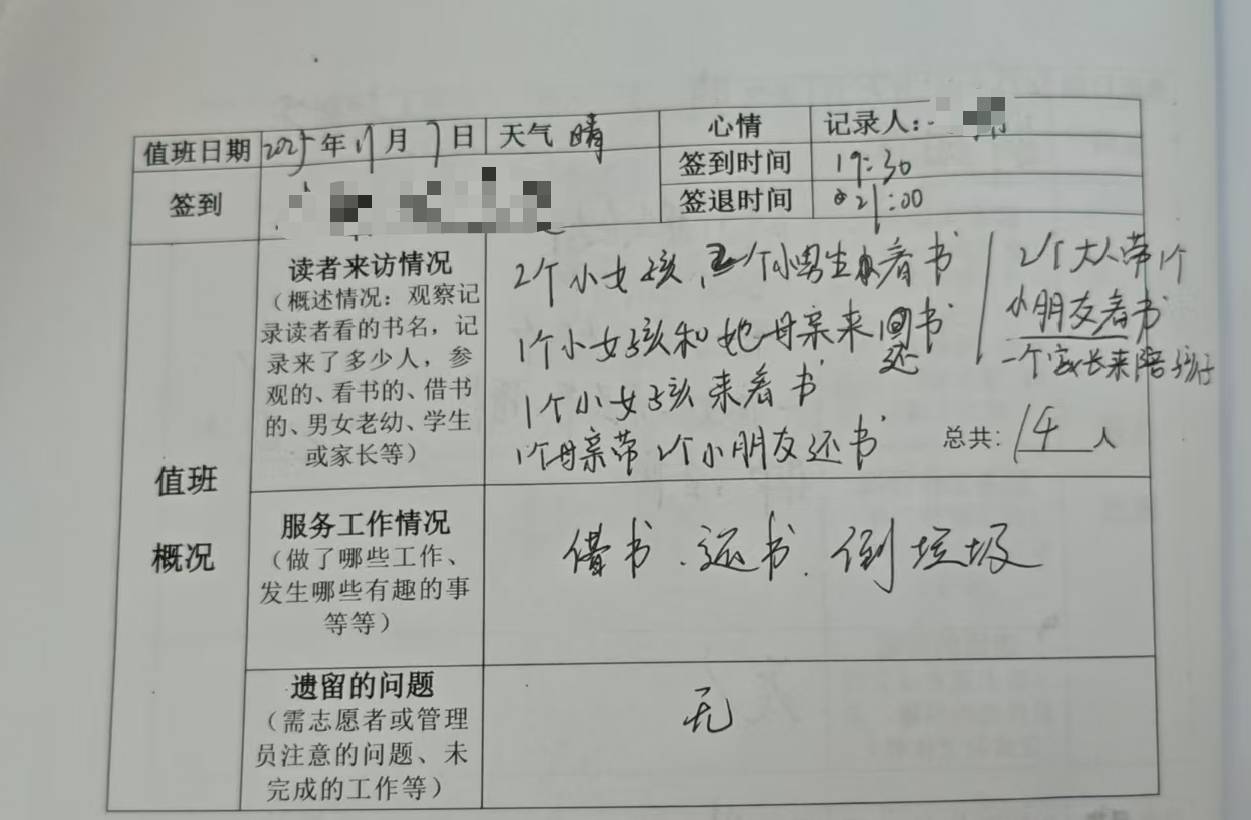 周五来得太快,有点没反应到晚上开馆,到五点多才记得发签到签退码,提醒开馆之类的。六点到七点半,还是咱们的“老”志愿者,这几周都这个时间来值班,一来二去之后感觉小朋友也成长了,从开始遇到图书问题留给下一班的姐姐志愿者到开始自己亲自处理。会主动问怎么处理问题,把益迪码丢失的书重新录入益迪码了。另外一位志愿者因为上周忘记签退多签了一个半小时时长,也在这周过来值班补回来了。七点半到九点的志愿者还是咱的最小……查看更多