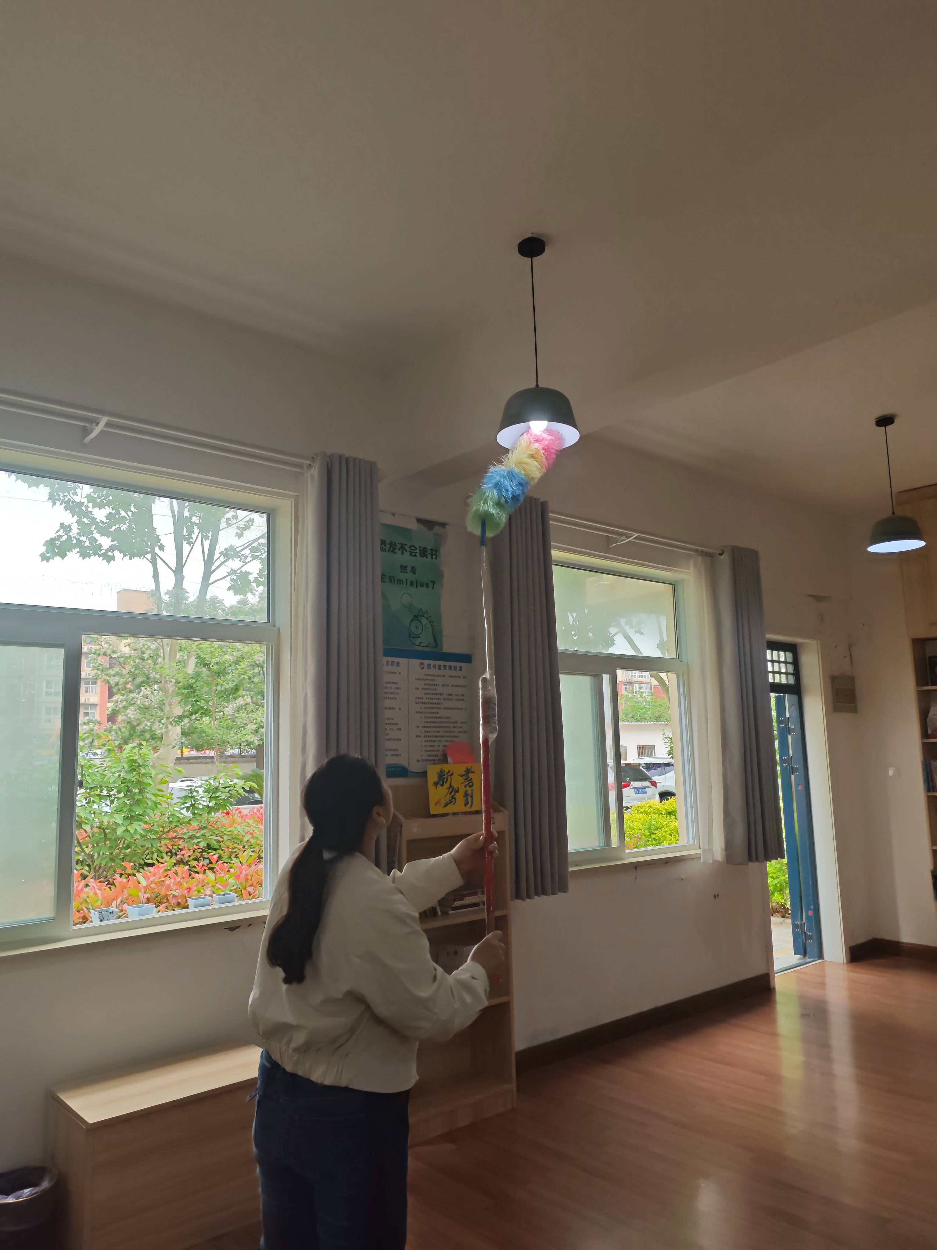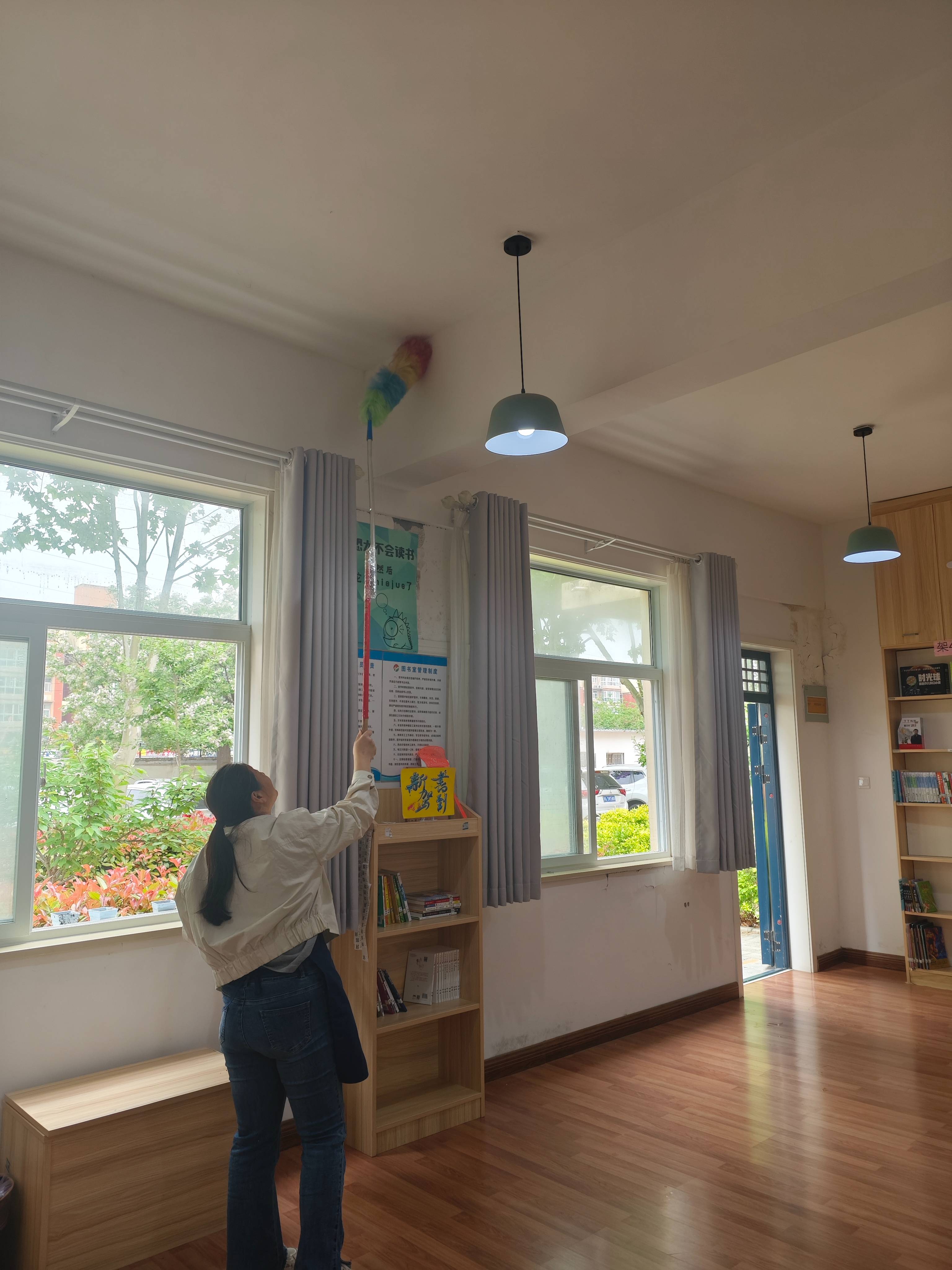 今天给图书馆换个模样,拉柜、推桌,擦窗,清网,去污,拖地!创造一个不一样的图书馆!一切安排妥当后,打开一本书,坐在窗前,感受着春风的惬意,享受着阳光的温暖,不热不冷,不急不躁!不光是我们自己喜欢,下课了的小朋友也喜欢坐那里,一切都那么美好!唯有遗憾的是 今天学校有活动安排,借书的小朋友没有那么多!