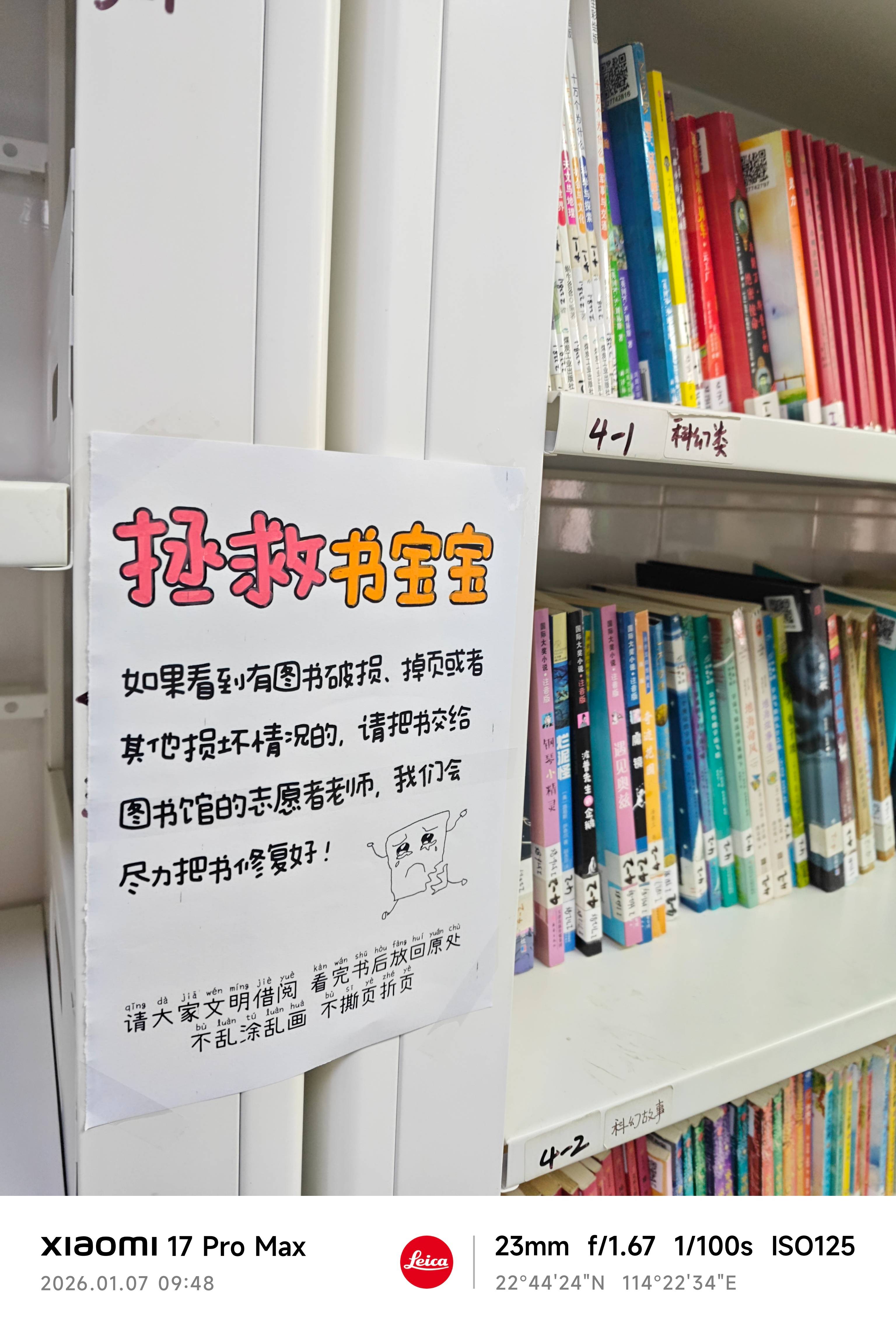 本学期最后一个开馆日,虽然已经不能借书了,每个课间还是有不少同学来看书,也有越来越多同学参加回顾我的2025、设计图书馆门牌活动,以及写下荐书卡。难得清静的课间,让我第一次听到了课前三分钟的预上课铃声,之前可是热闹得有时候连上课铃声我都听不到🤣也让我捕抓到不少可爱的瞬间,有帮同学扎头发的女孩,有站姿对称看书的伙伴,有一起找书的双胞胎兄弟,还有被对方可爱到互相捧脸拥抱的女孩们,更多是三俩成群看同一本……查看更多