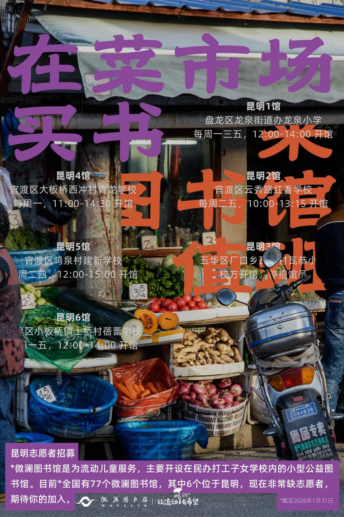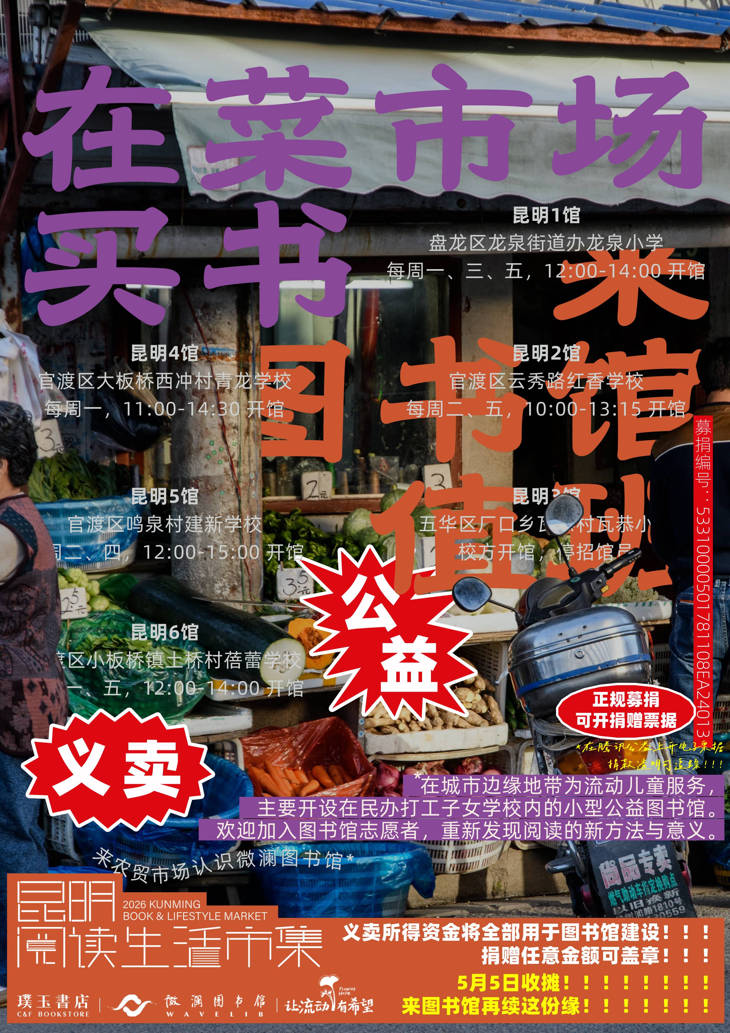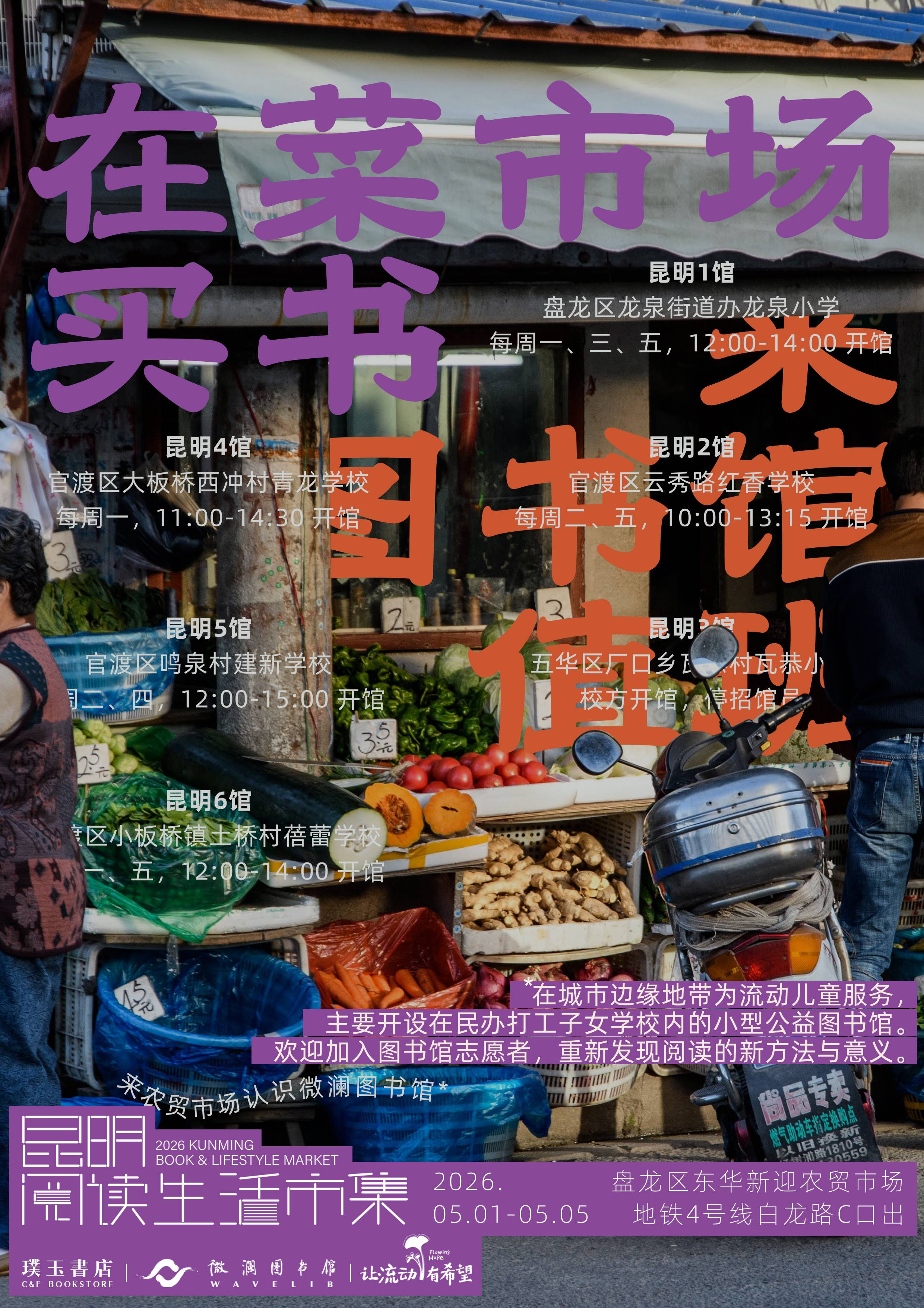 陆续完成五一假期“昆明阅读生活市集”的宣传海报(含现场张贴版、宣传卡片版),“在菜市场买书,来图书馆值班”。