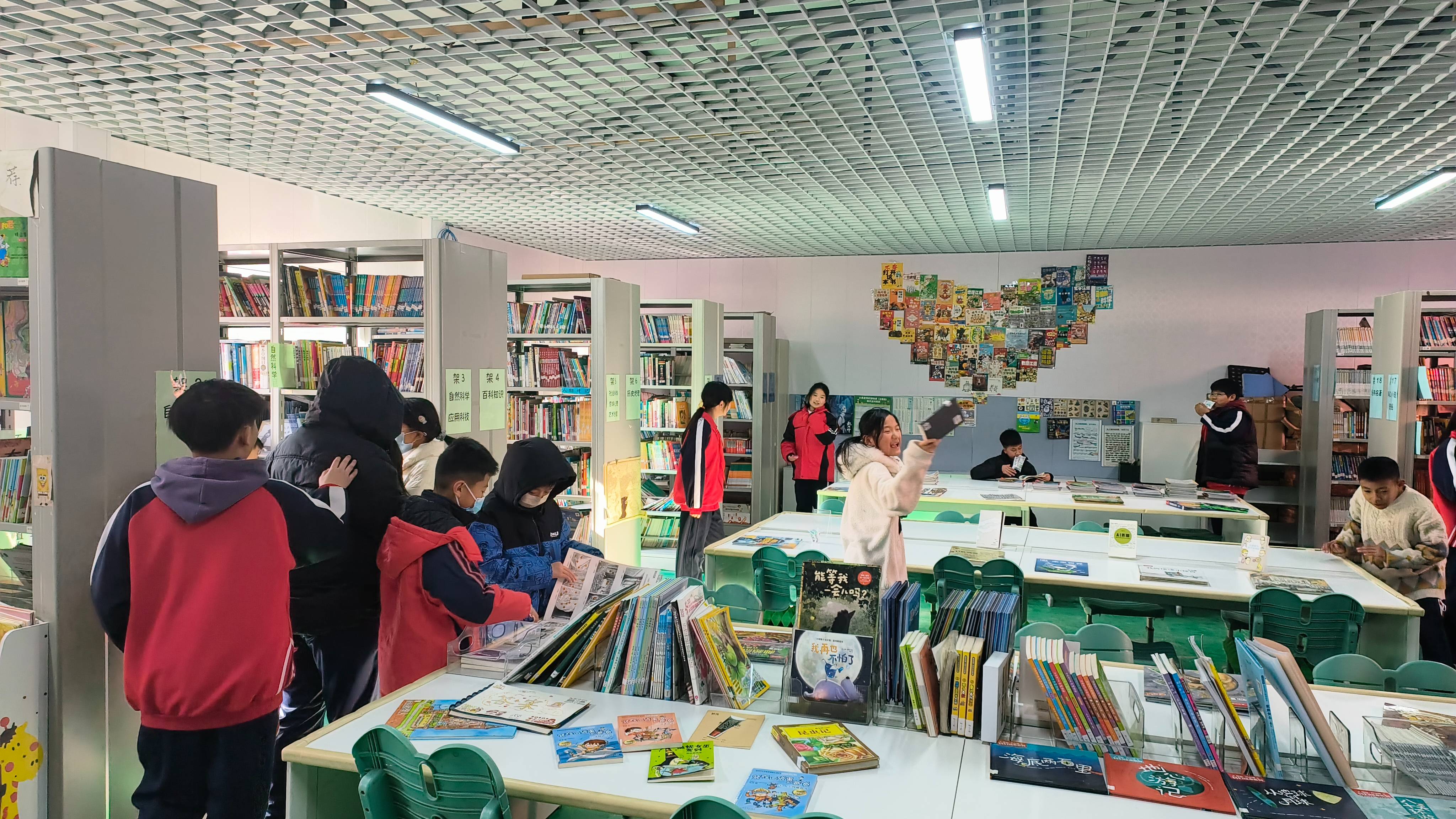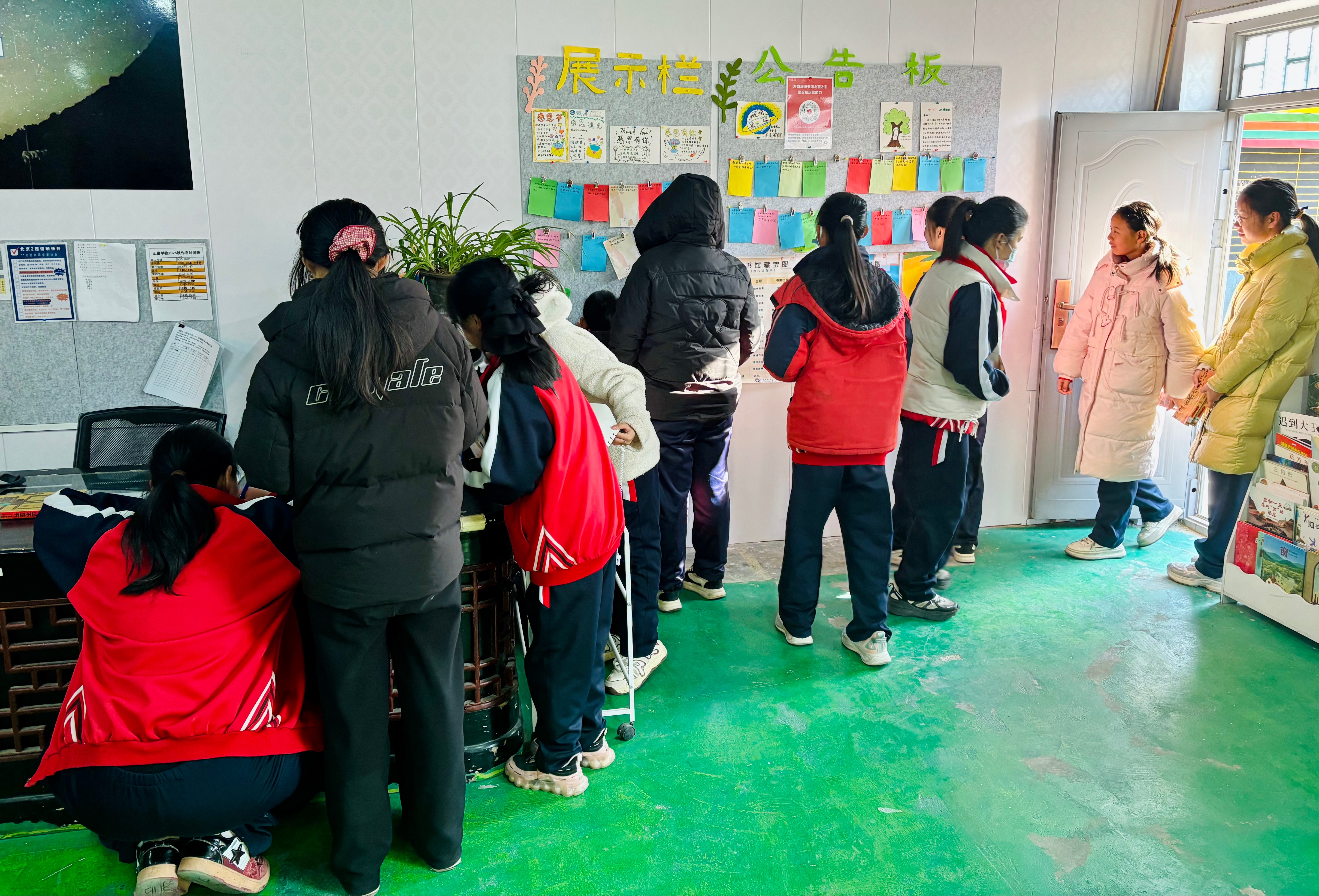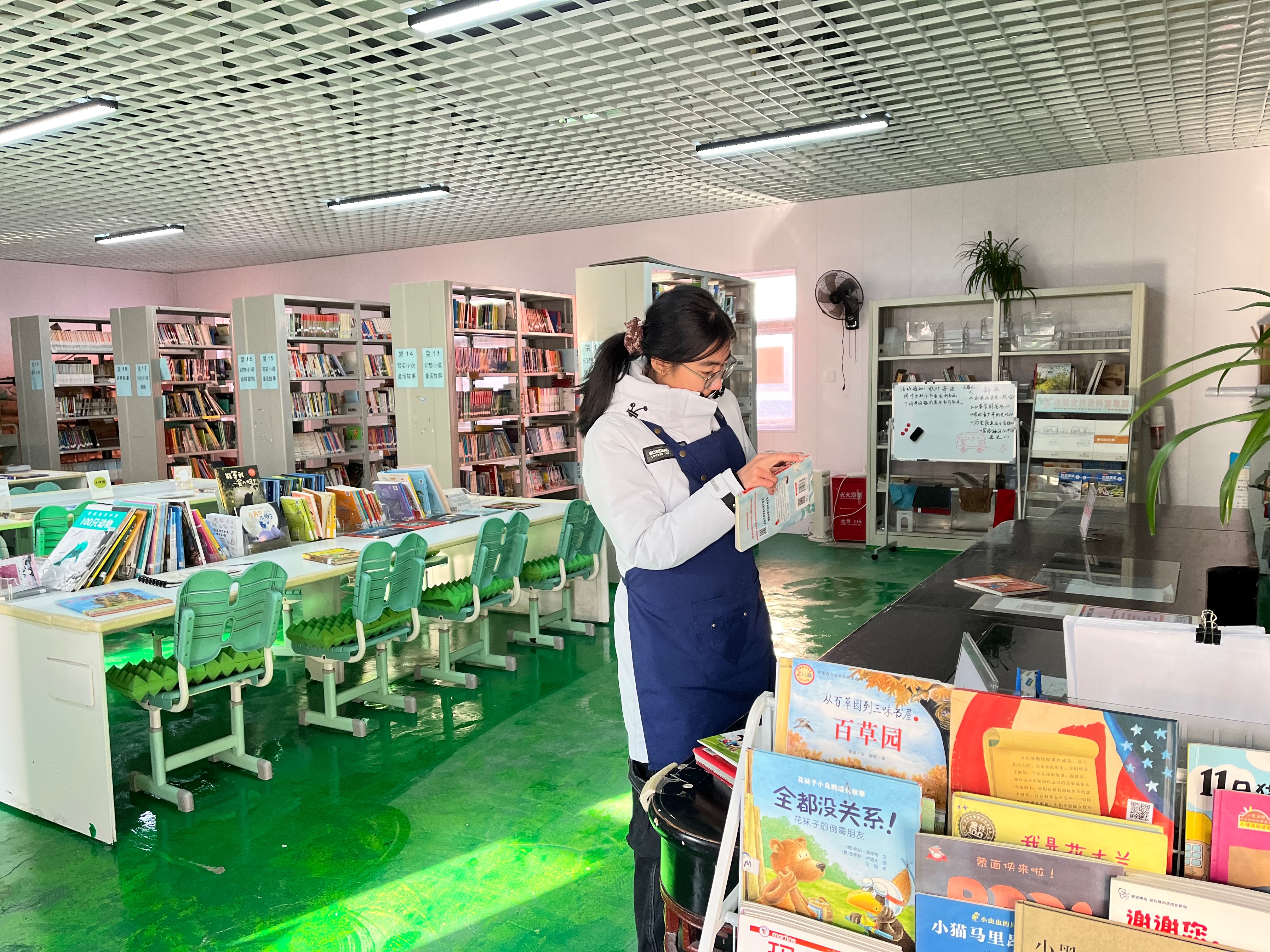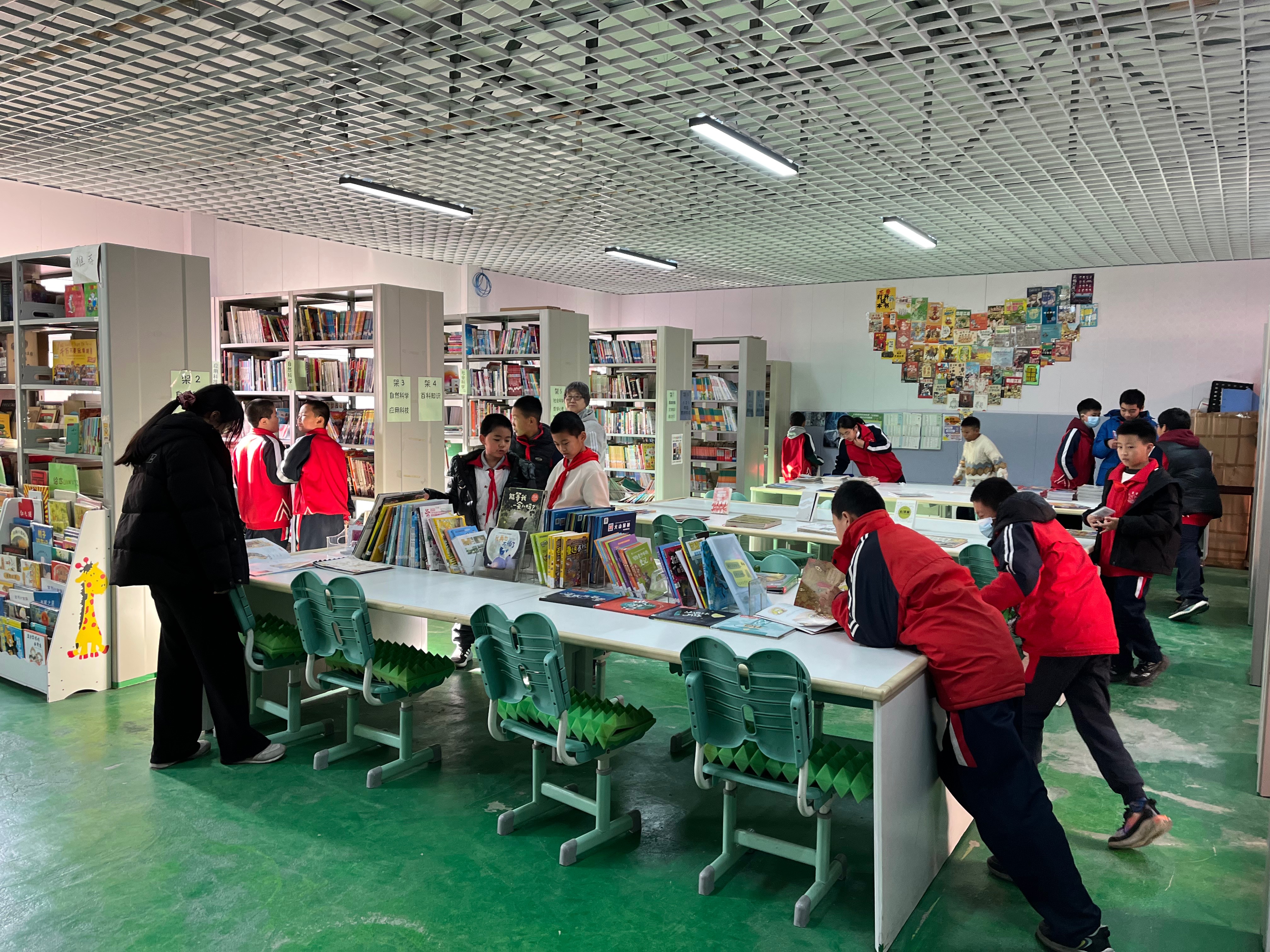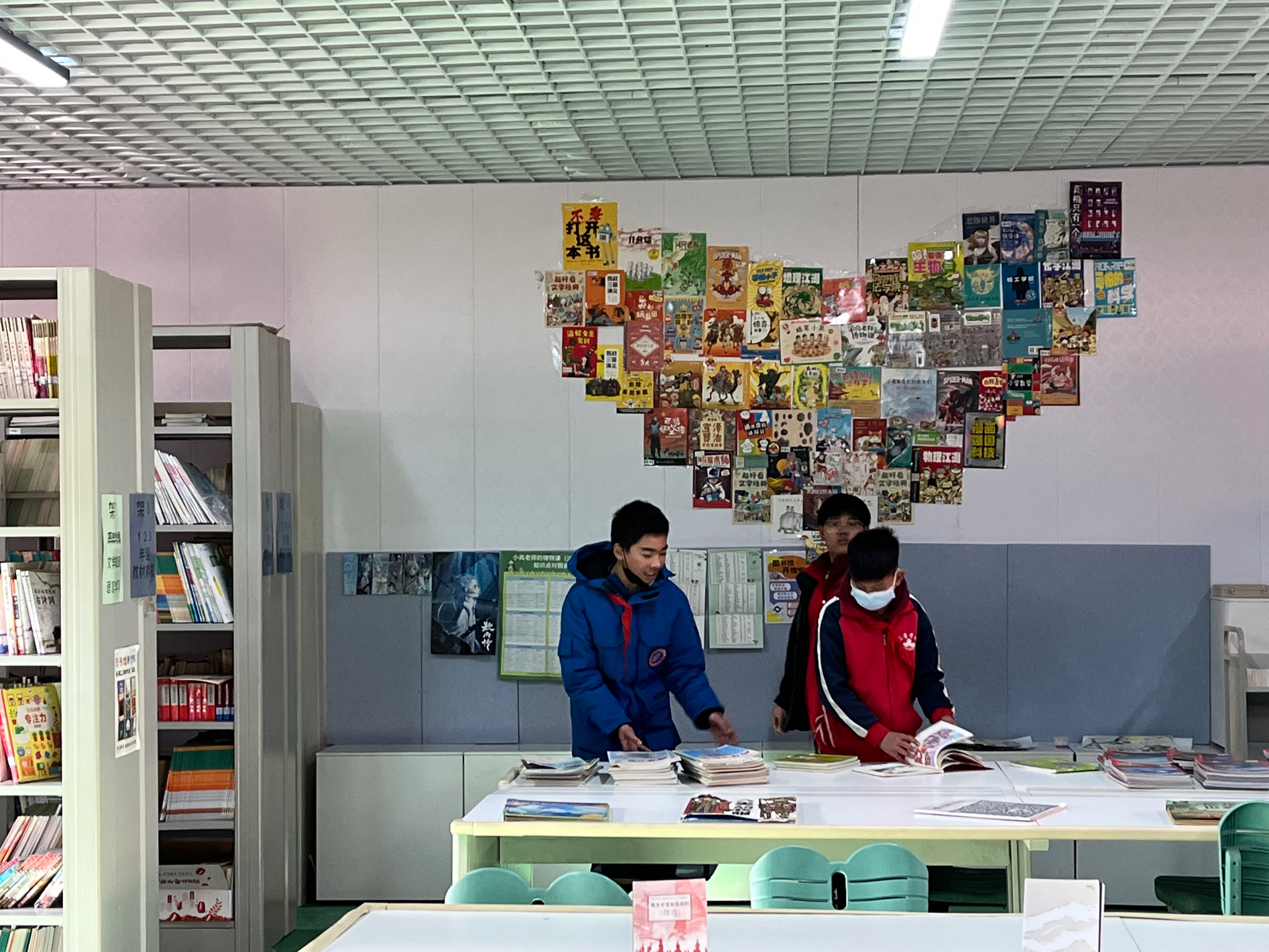 今天莉娟老师来啦!她和小孙一起把再次将后墙重新布置起来,还将工作台彻底清理一番,小孙修补了几本书。来馆借阅的学生比上周二少一些,及时阻止将后门打开进进出出打闹的行为。下午大课间来馆借阅的学生很少。