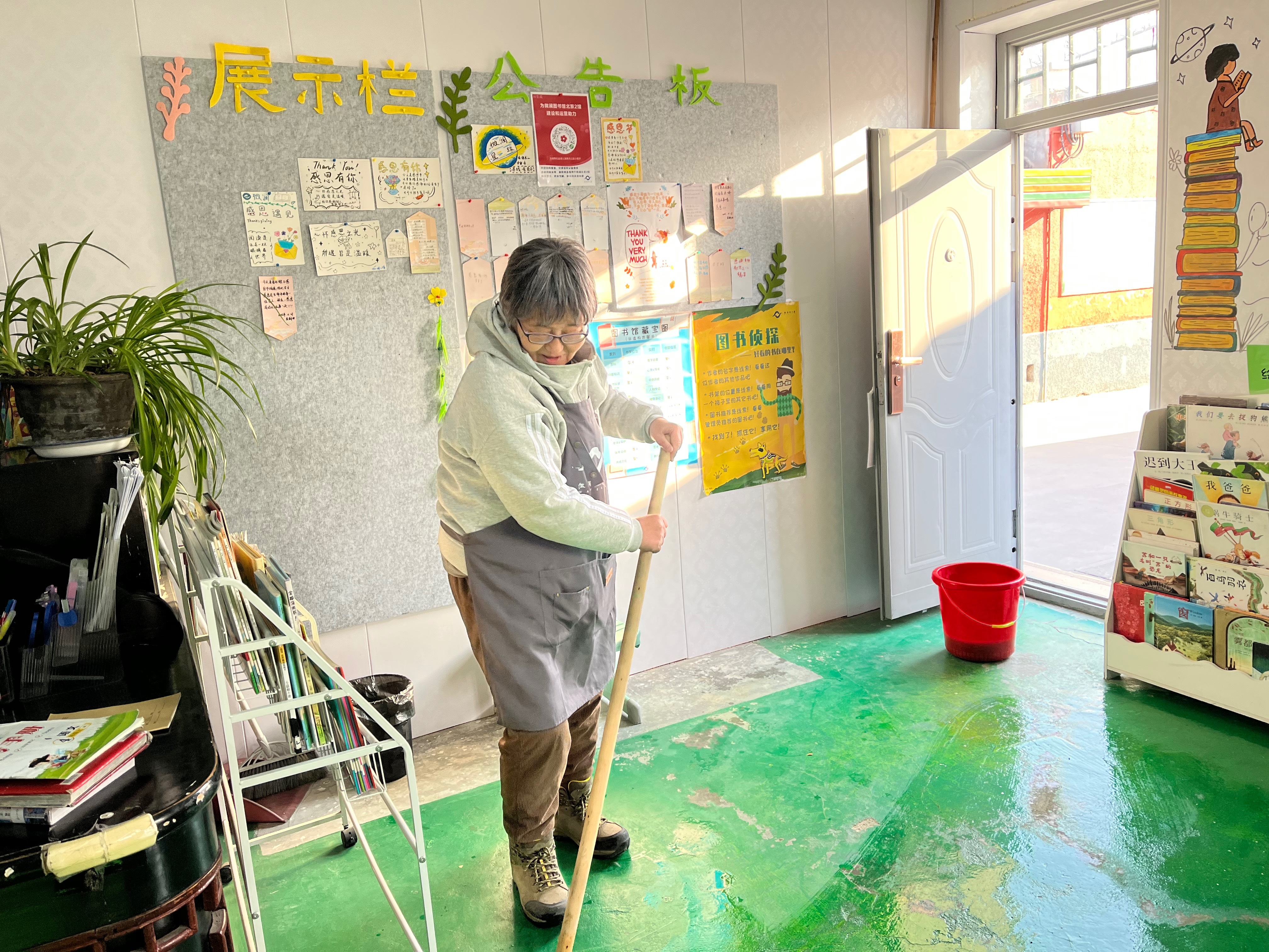 房间后面的展示墙被修补了图书馆新置了毛毡板