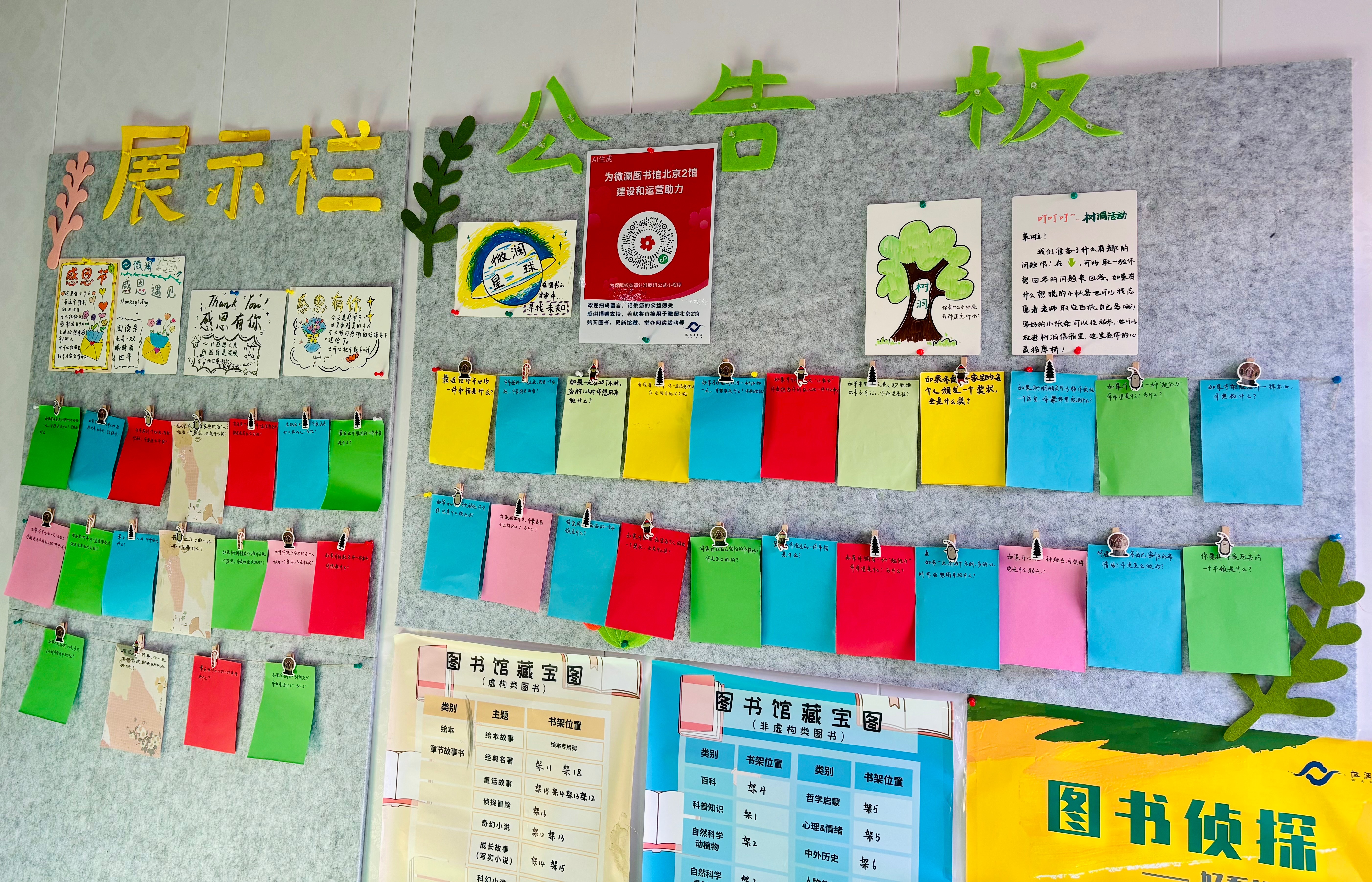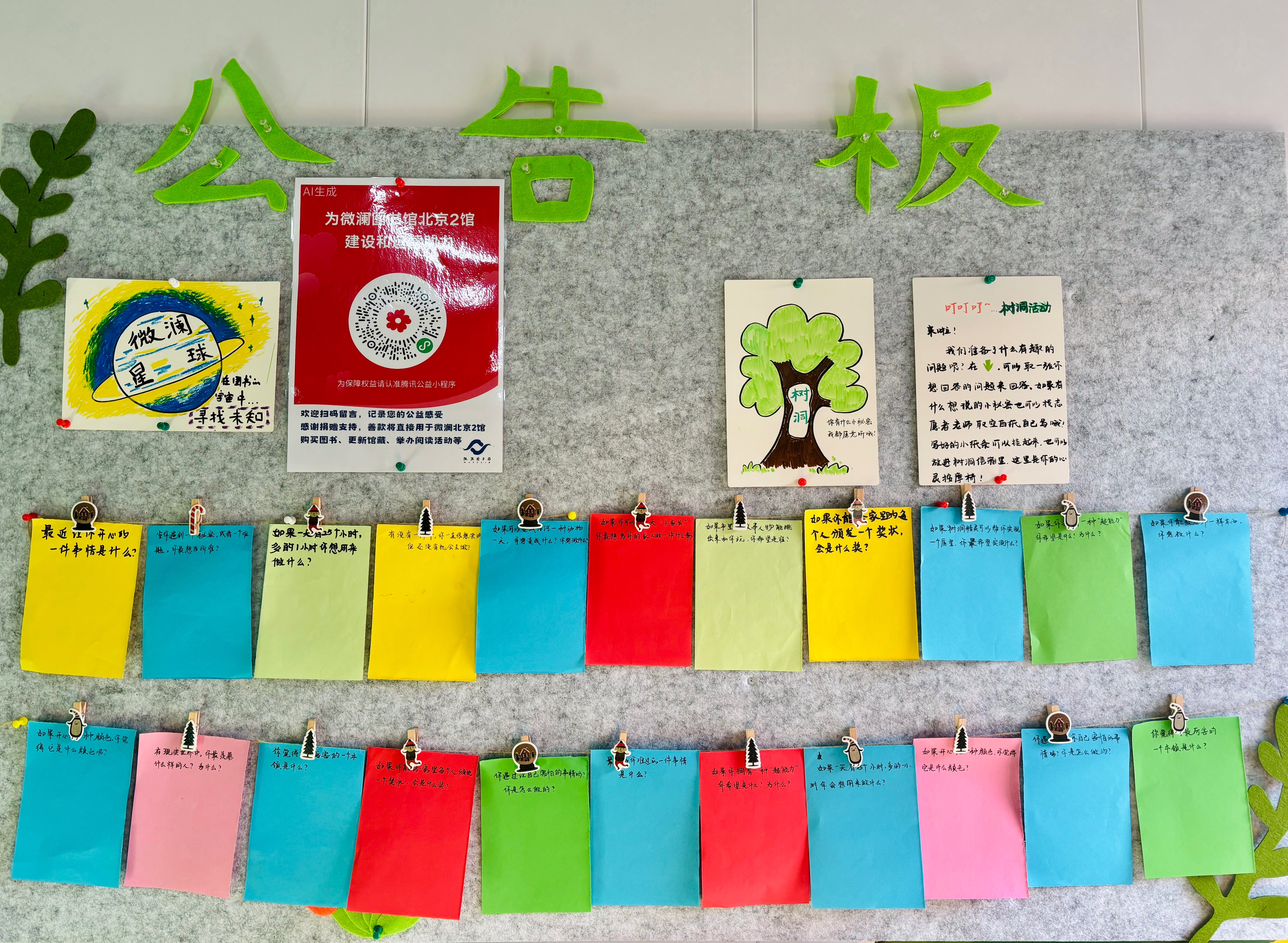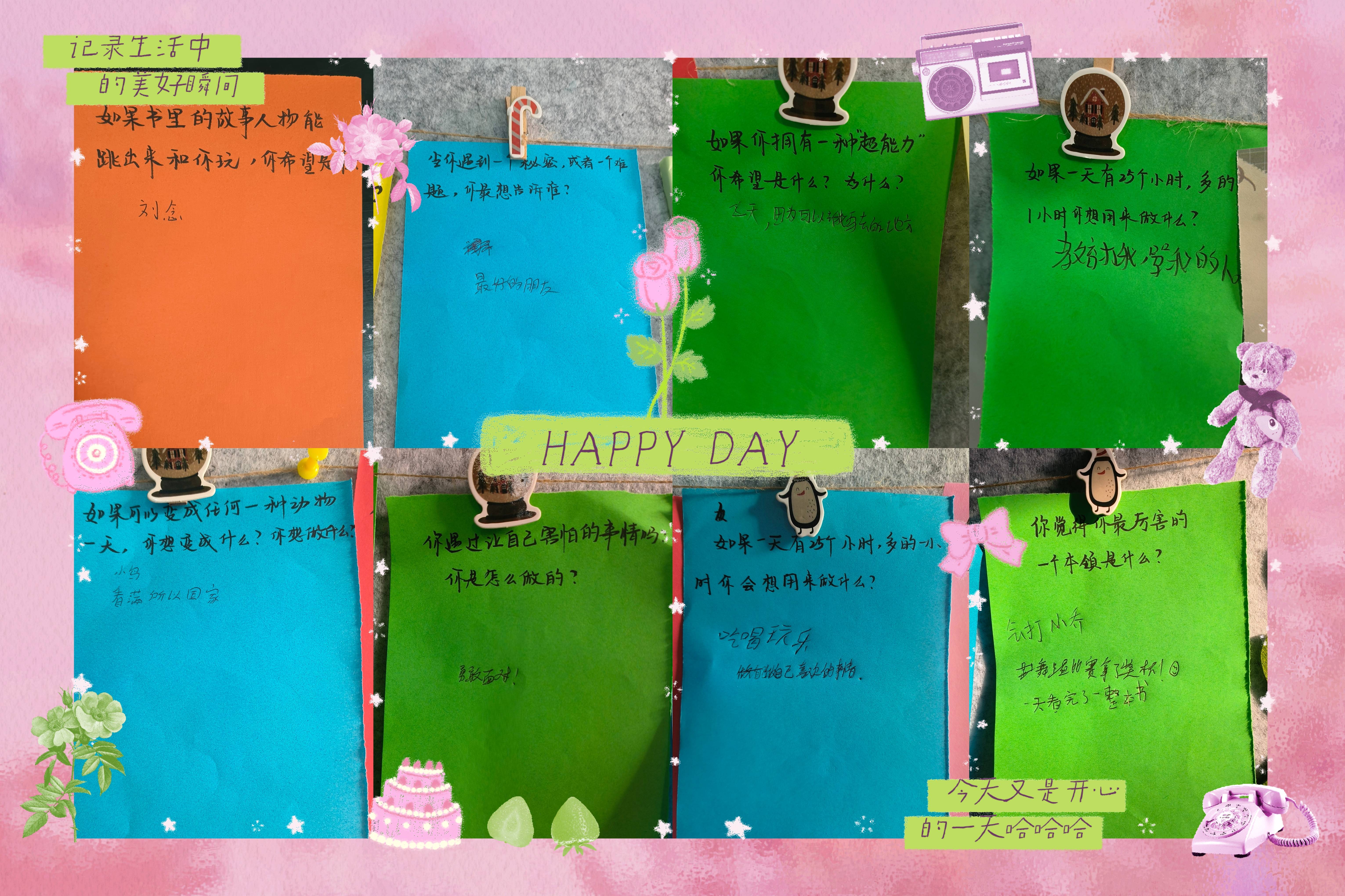 日常值班!趁着午休课间前,把远手写好的“树洞”小问题挂在了毛毡板上,今天因为学校月考,课间来馆里的同学并不太多,但是看到毛毡板上彩色的小卡纸同学们倒是都很有兴趣,虽然有的回答实在是让人“大跌眼镜”😂,但是“天马行空”的语言才应是他们这个年龄的体现吧🤭