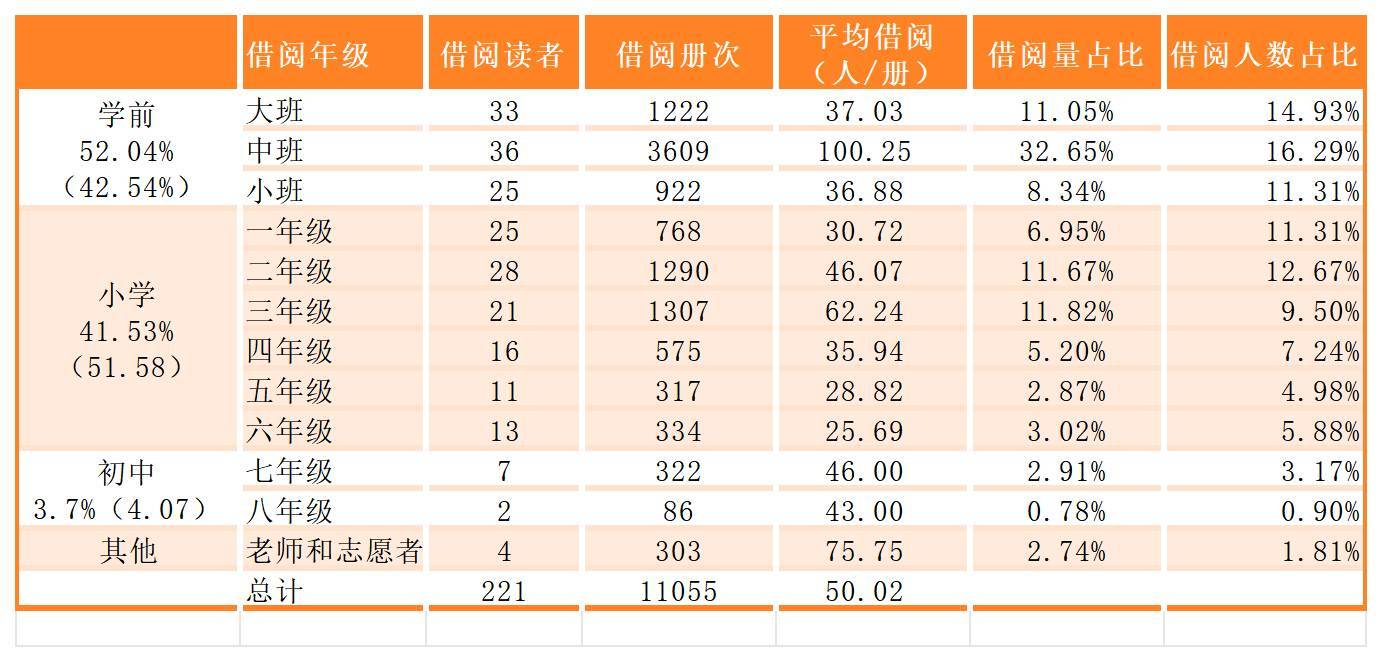 廊坊2馆上半年借阅读者分布如上,实际上,因为以家庭为借阅单位,比如大班的孩子可能有个四年级的哥哥姐姐,同样,初一的孩子可能有一年级的弟弟妹妹。所以实际读者还会多。