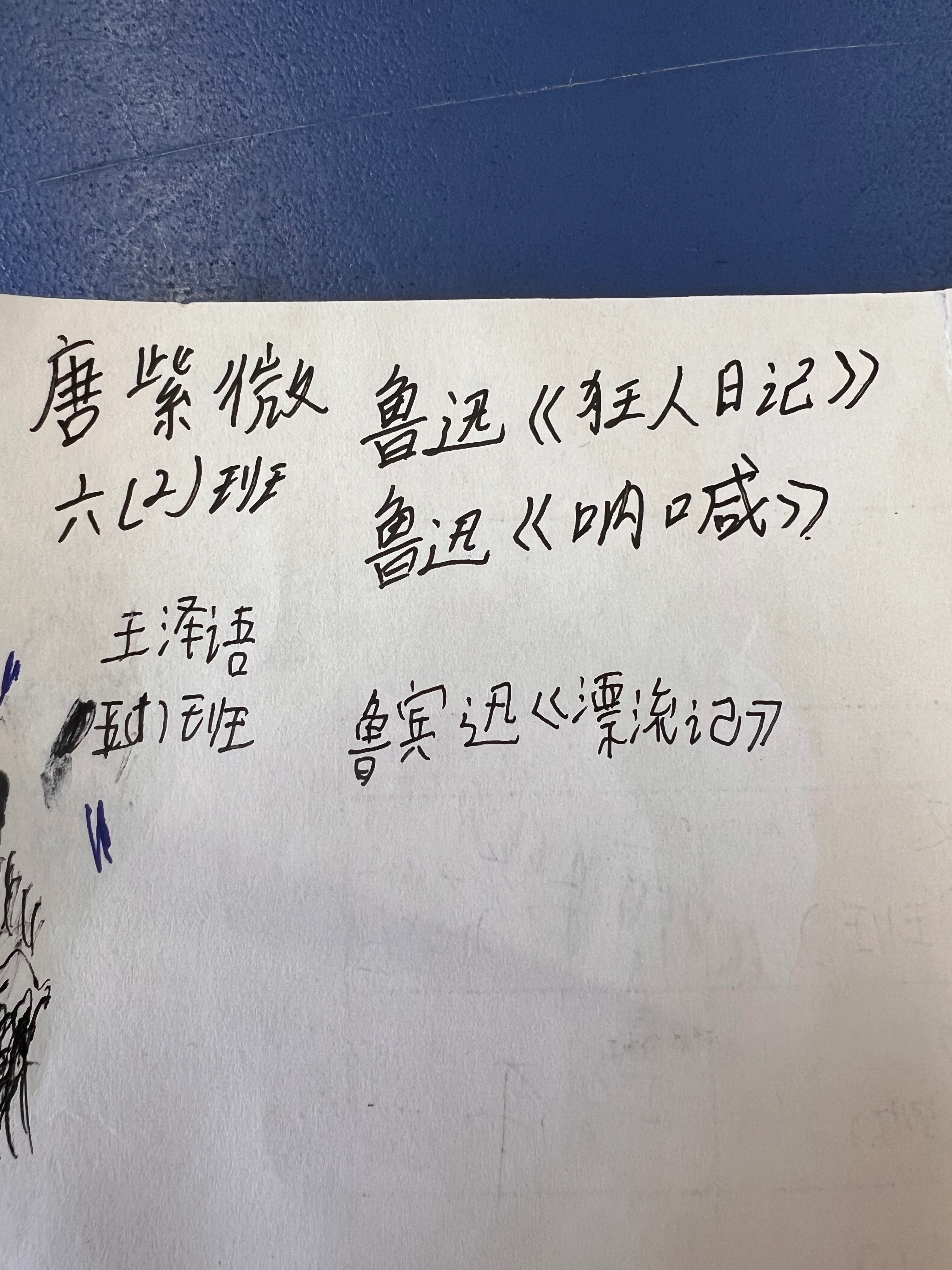 一位六年级的小朋友在心愿单上写下了鲁迅先生的《呐喊》这本书。