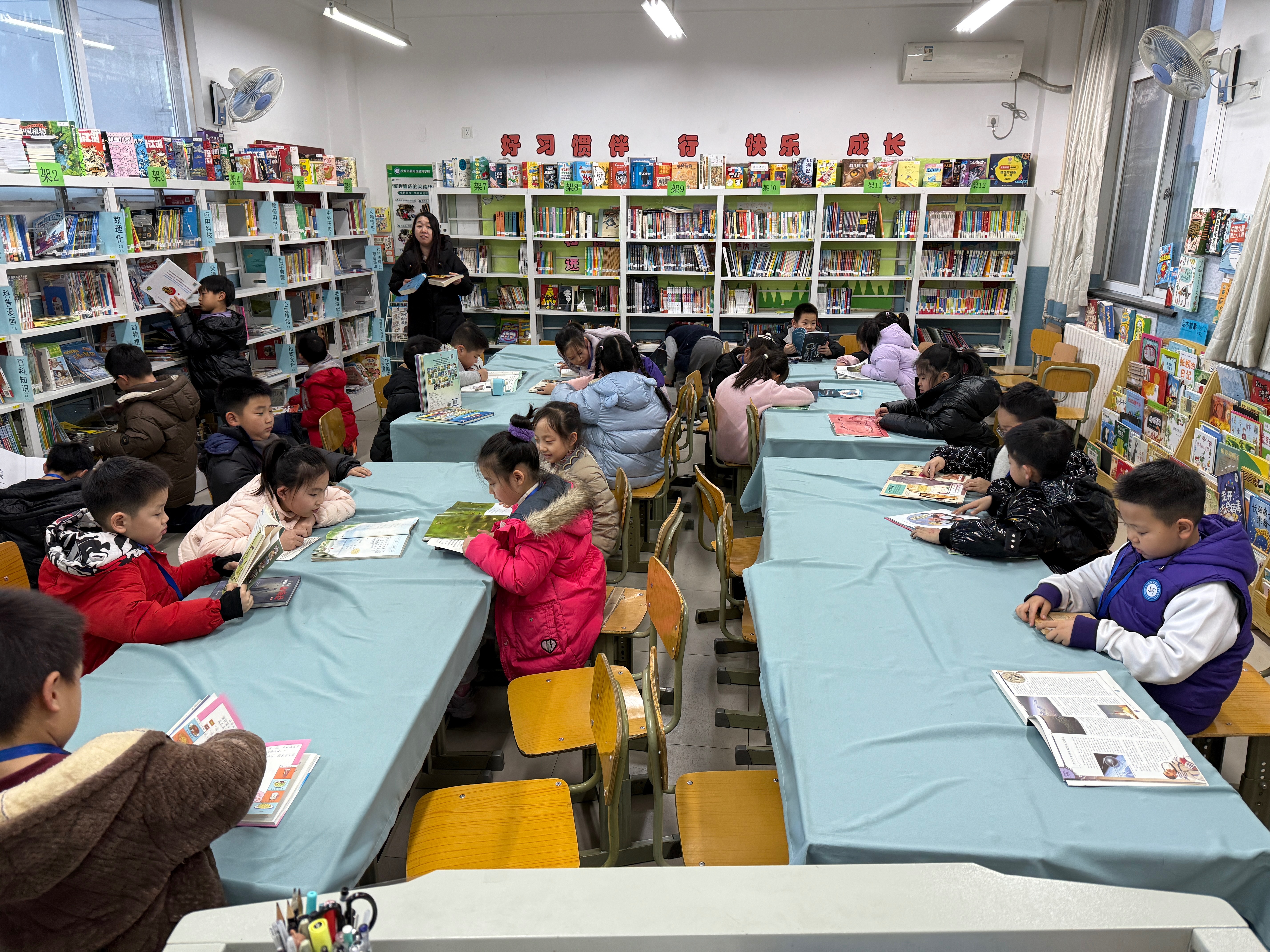 34家馆日常开放借阅,为2195位读者借阅图书3422册次,处理归还图3210册(1980人);9家馆购买/受捐/学校馆藏等录入上架图书78册,3家馆录入新读者......