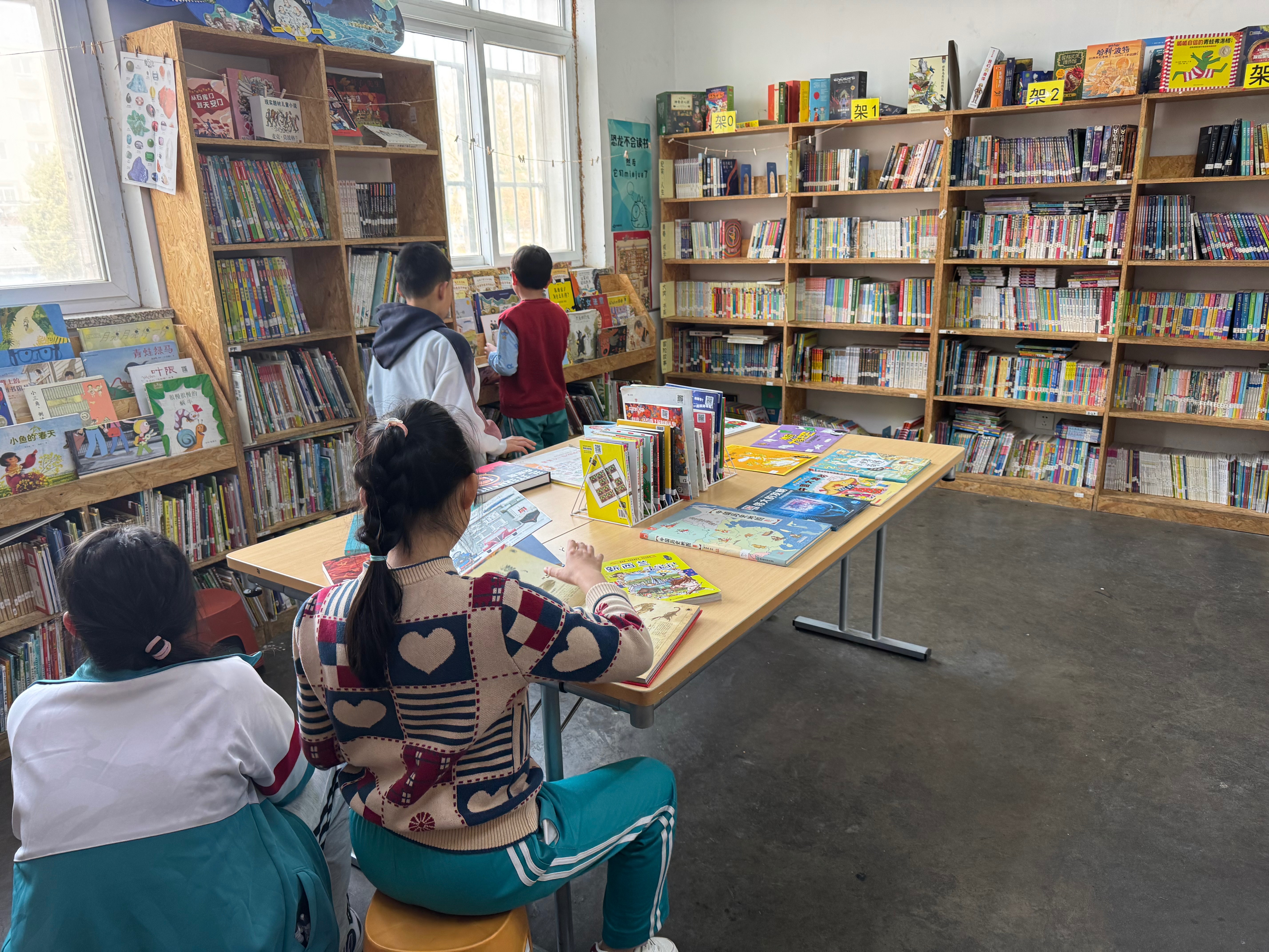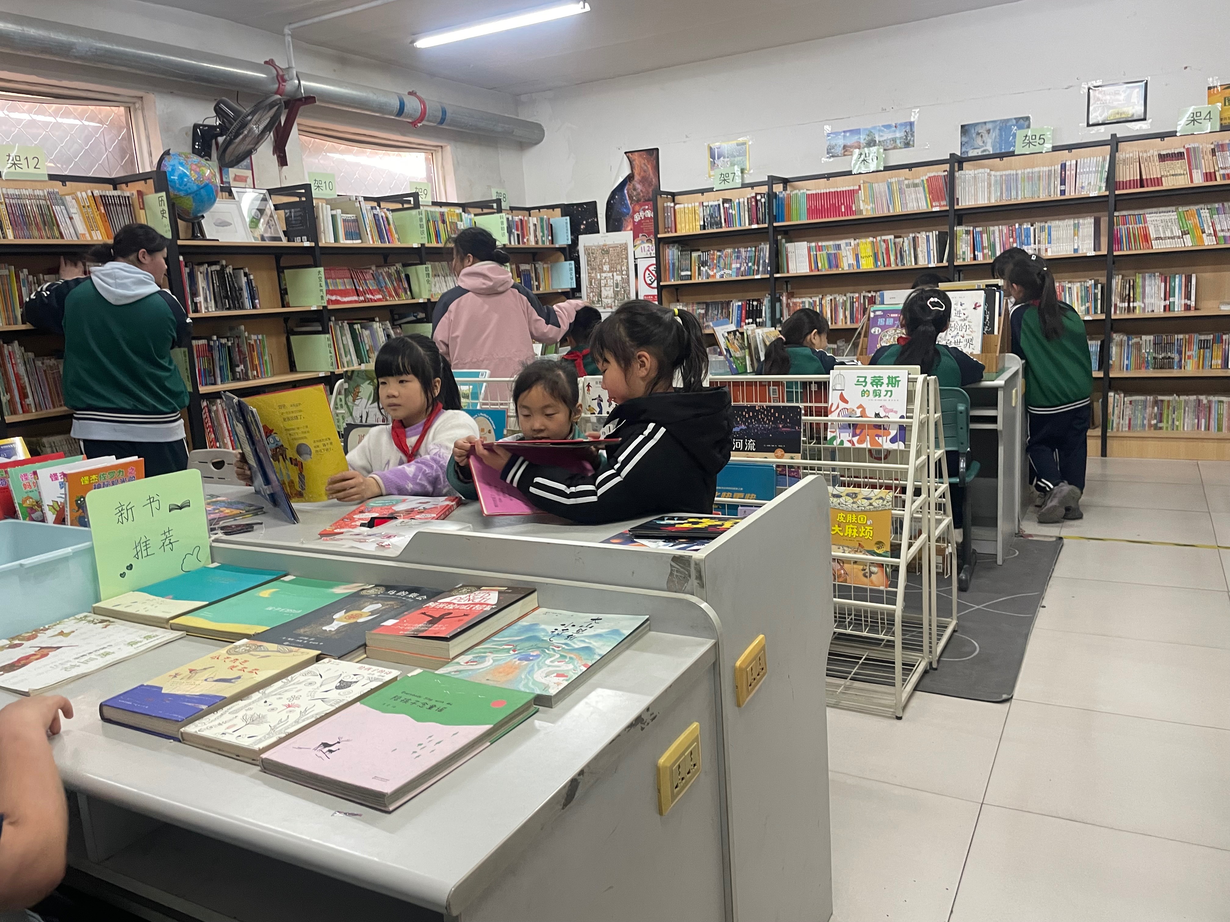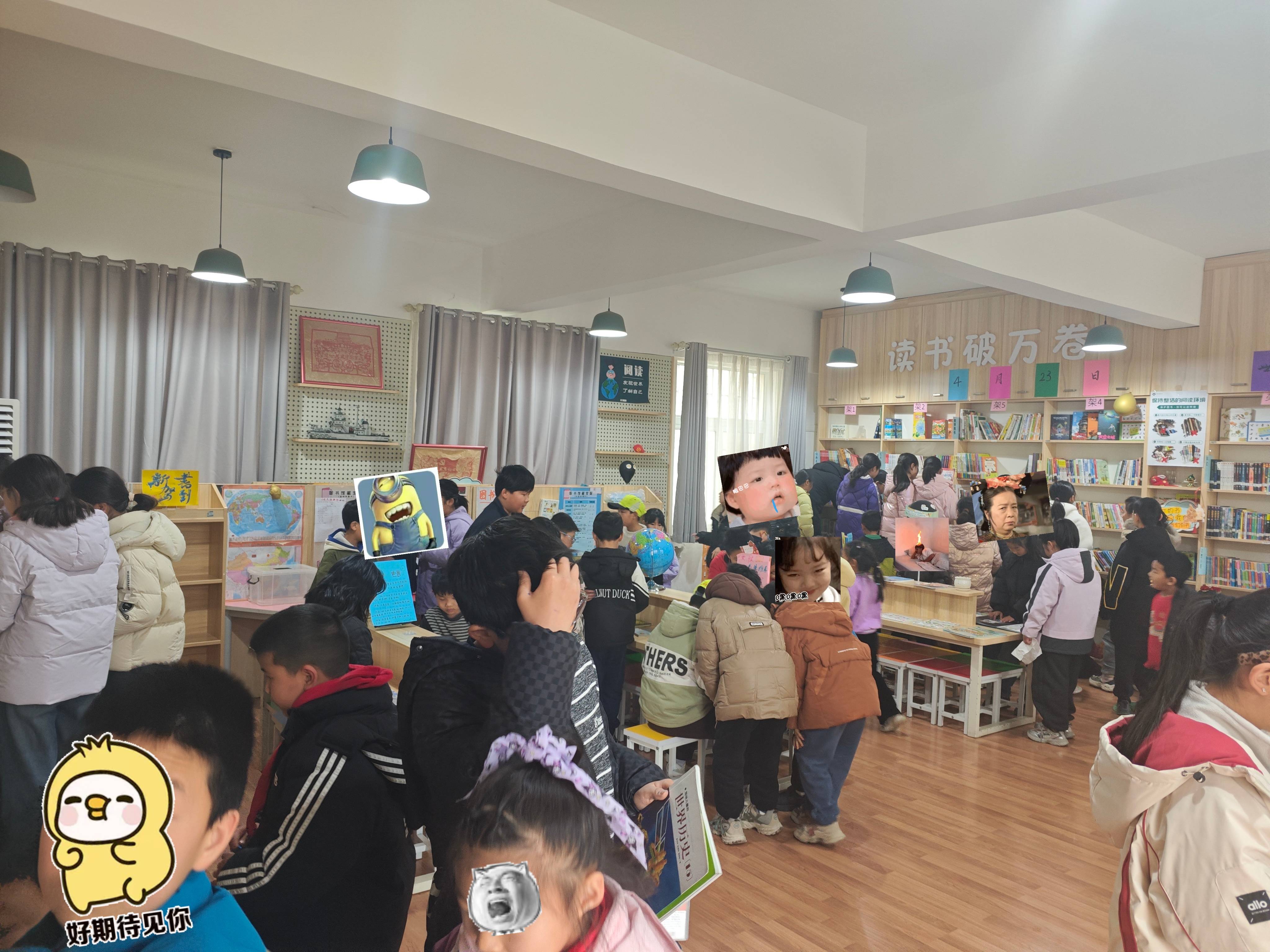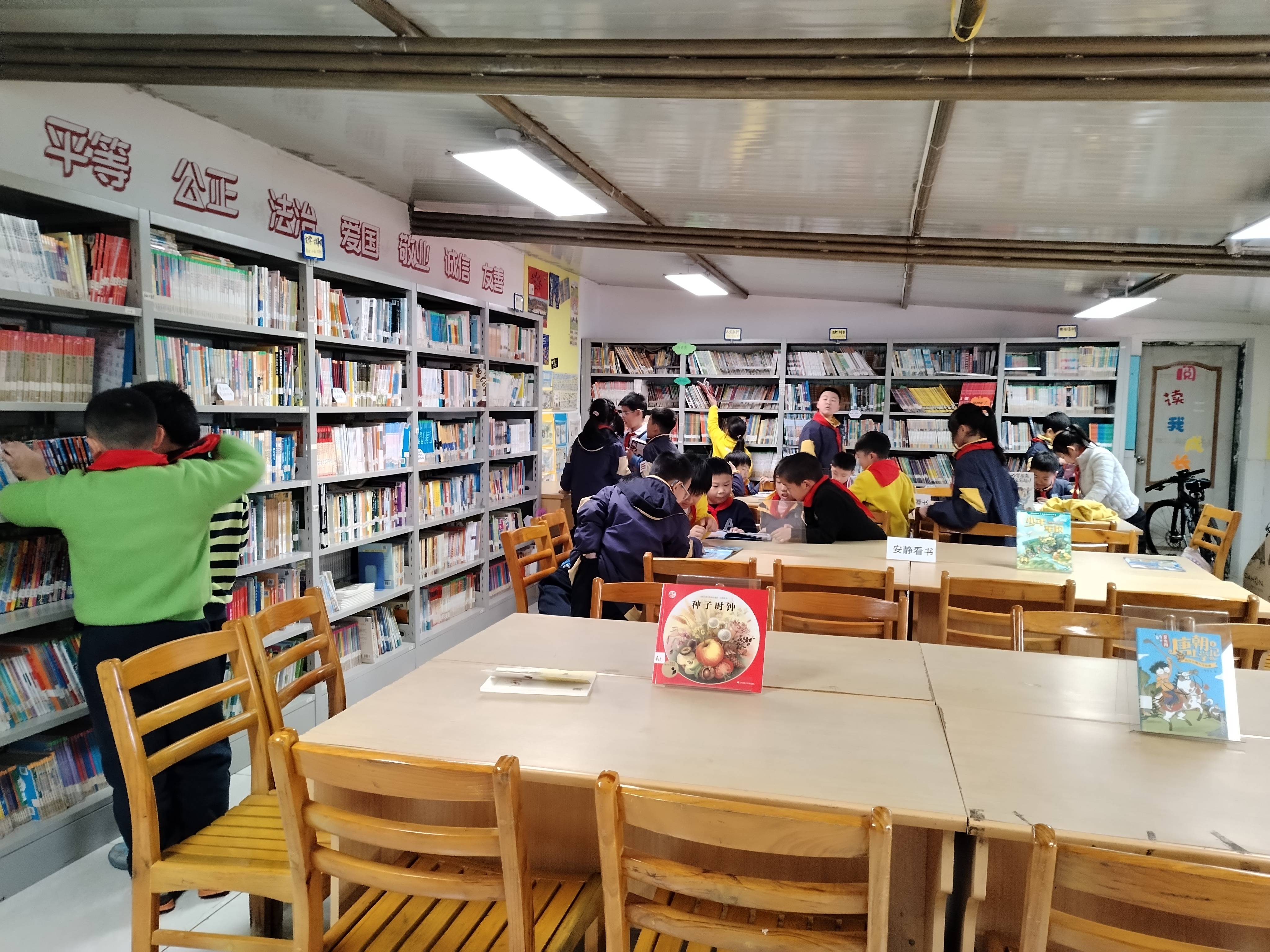 整理书架将过期杂志和堆积的图书下架并打包,录入几本新书,LJ进一年级二班讲......