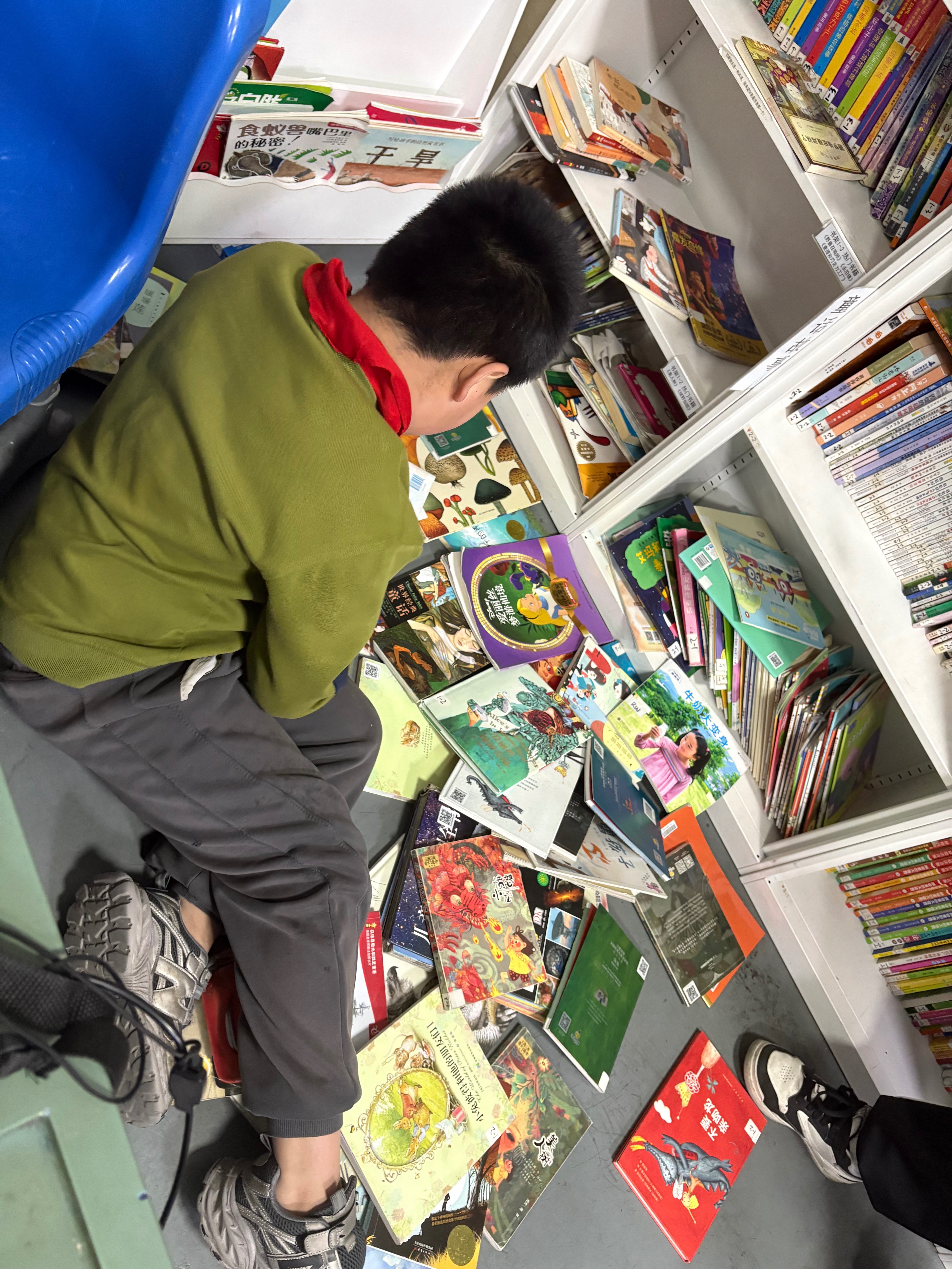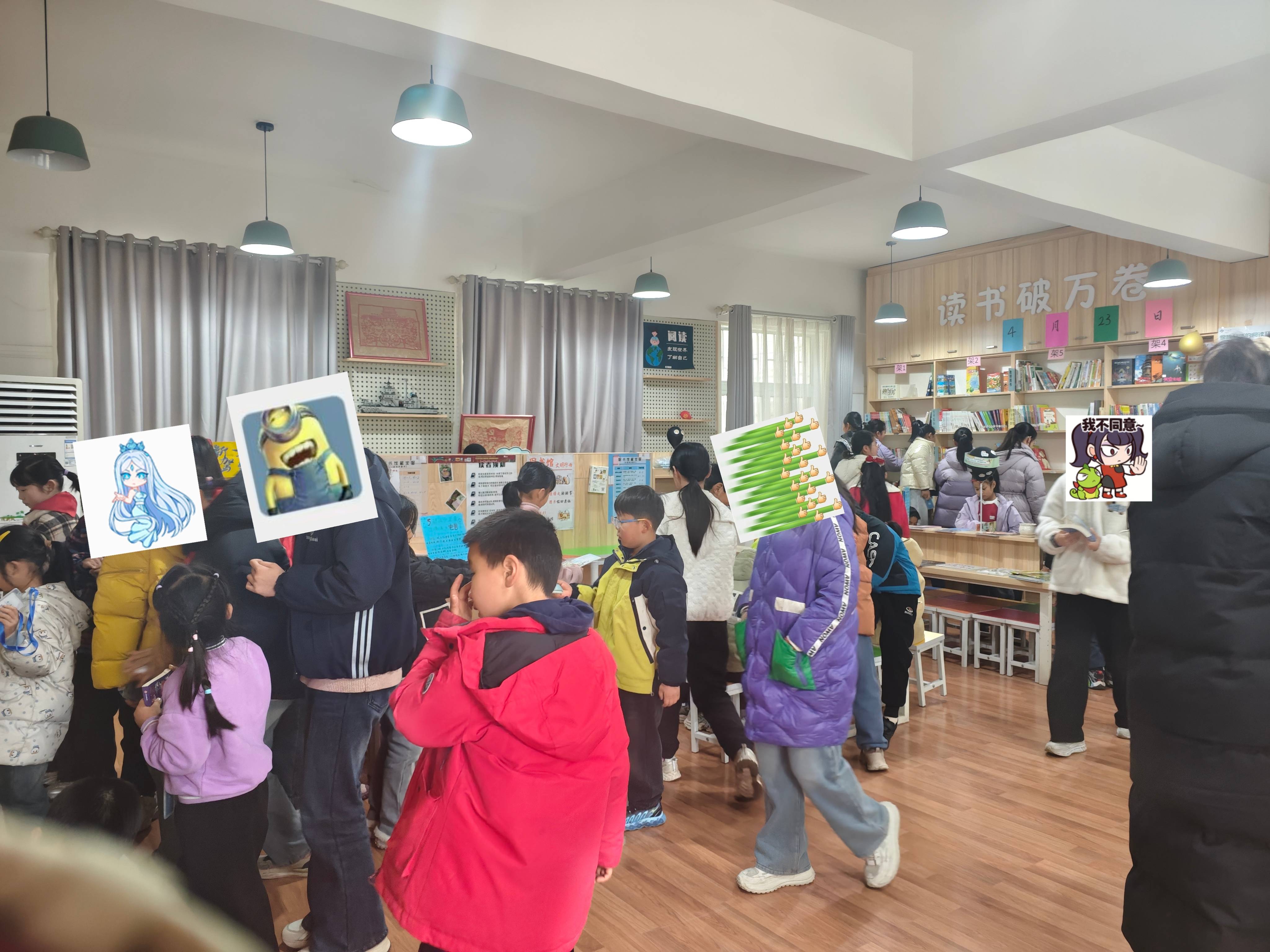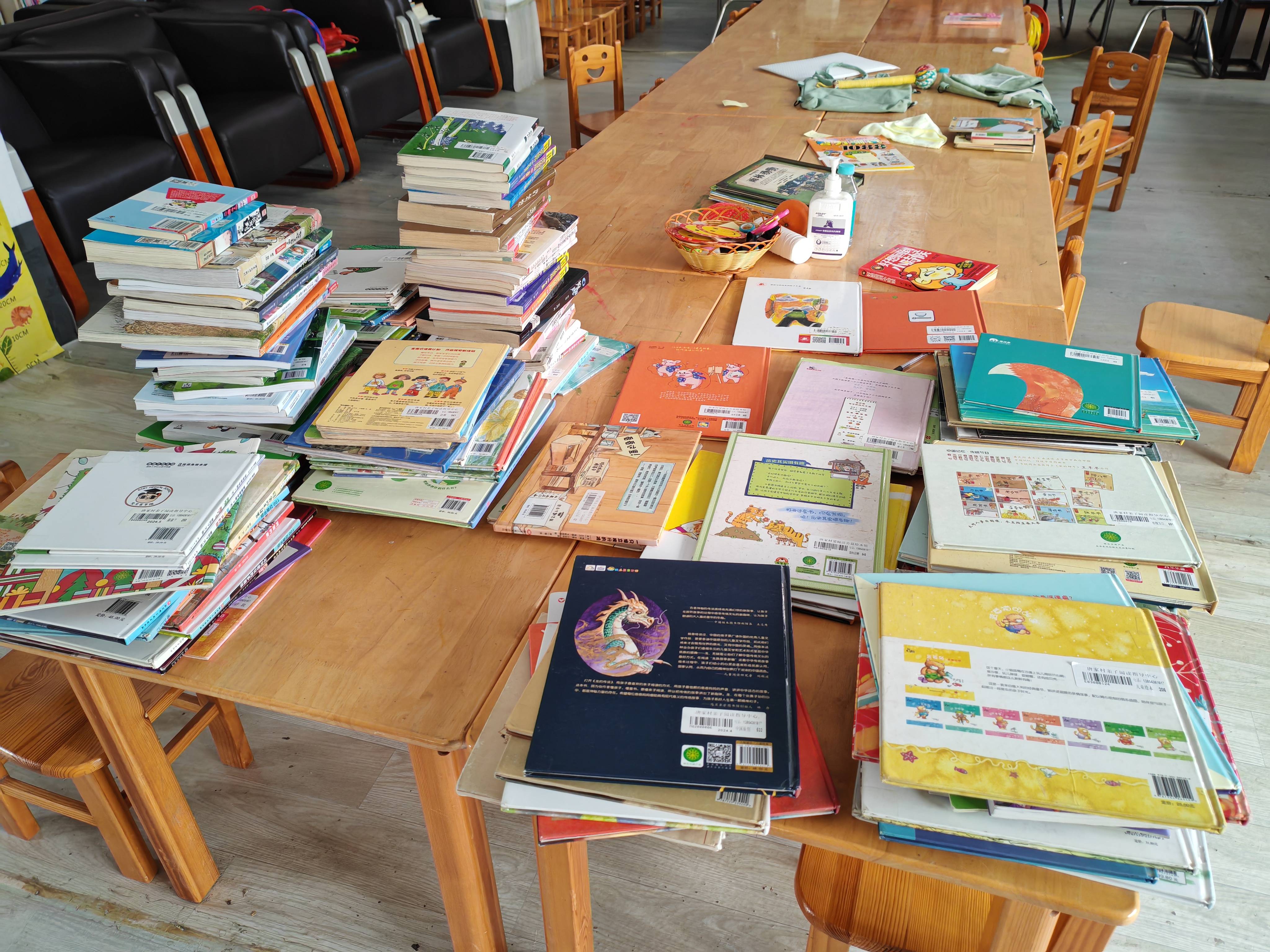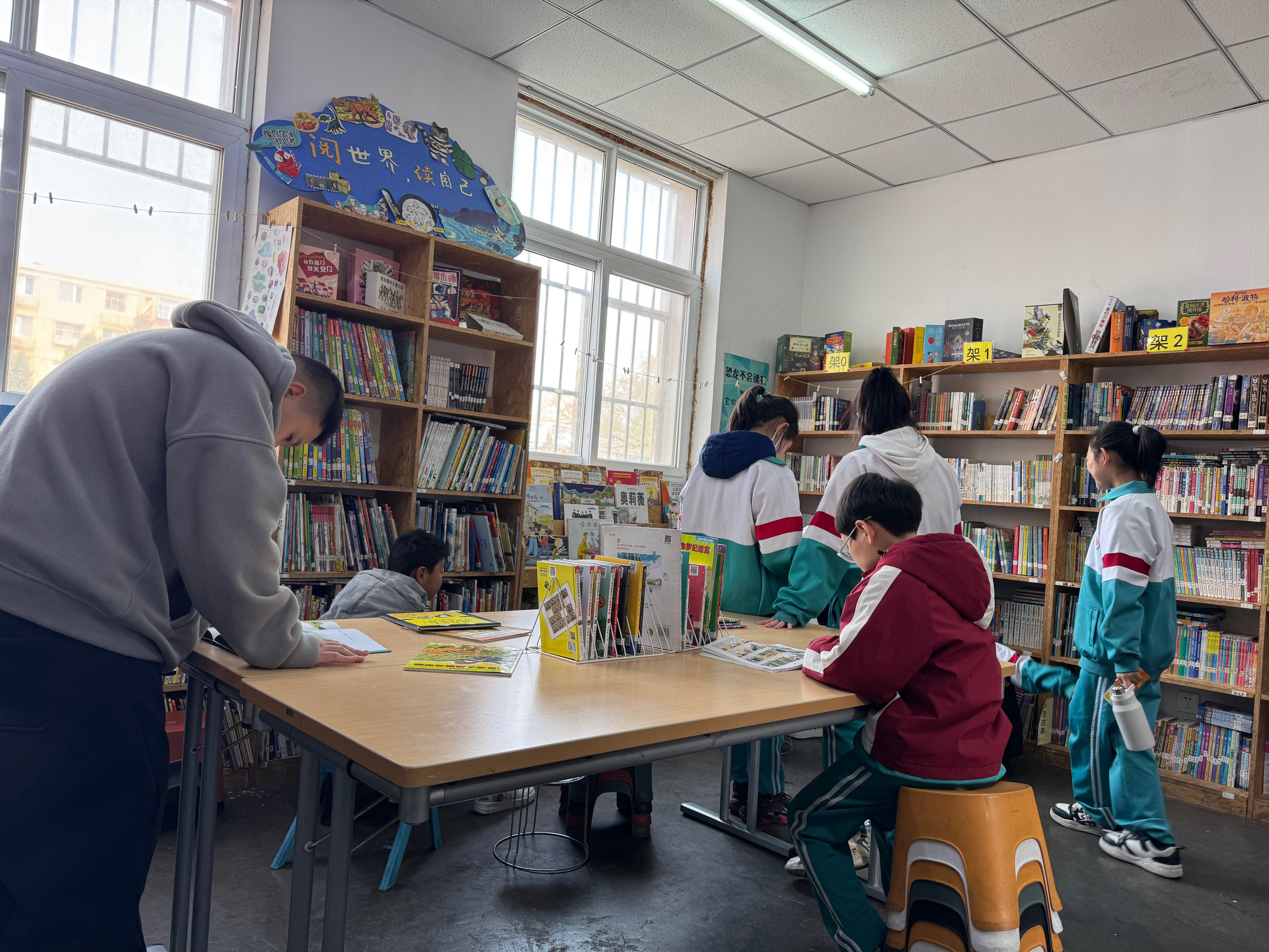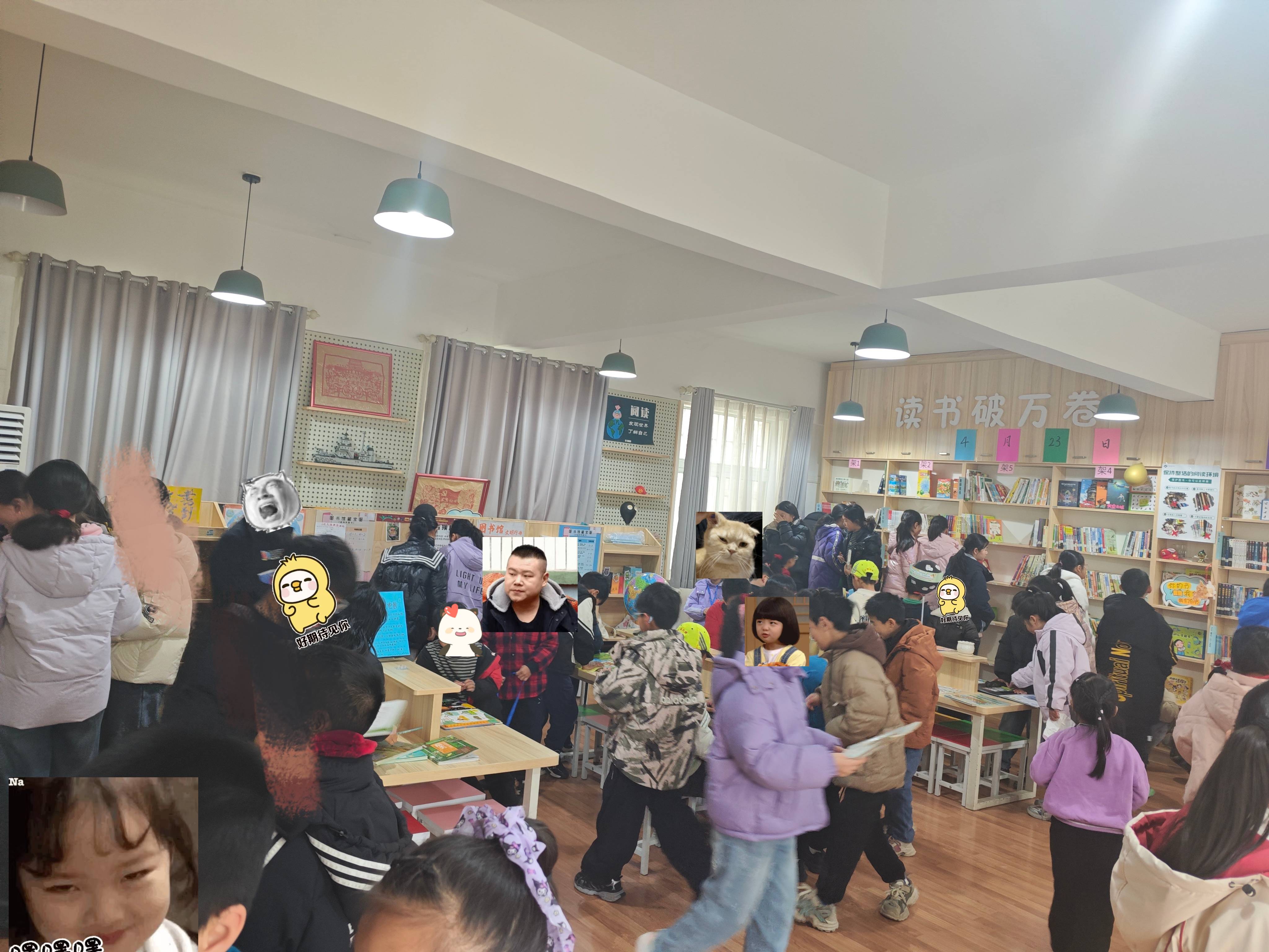 整理书架将过期杂志和堆积的图书下架并打包,录入几本新书,LJ进一年级二班讲......
