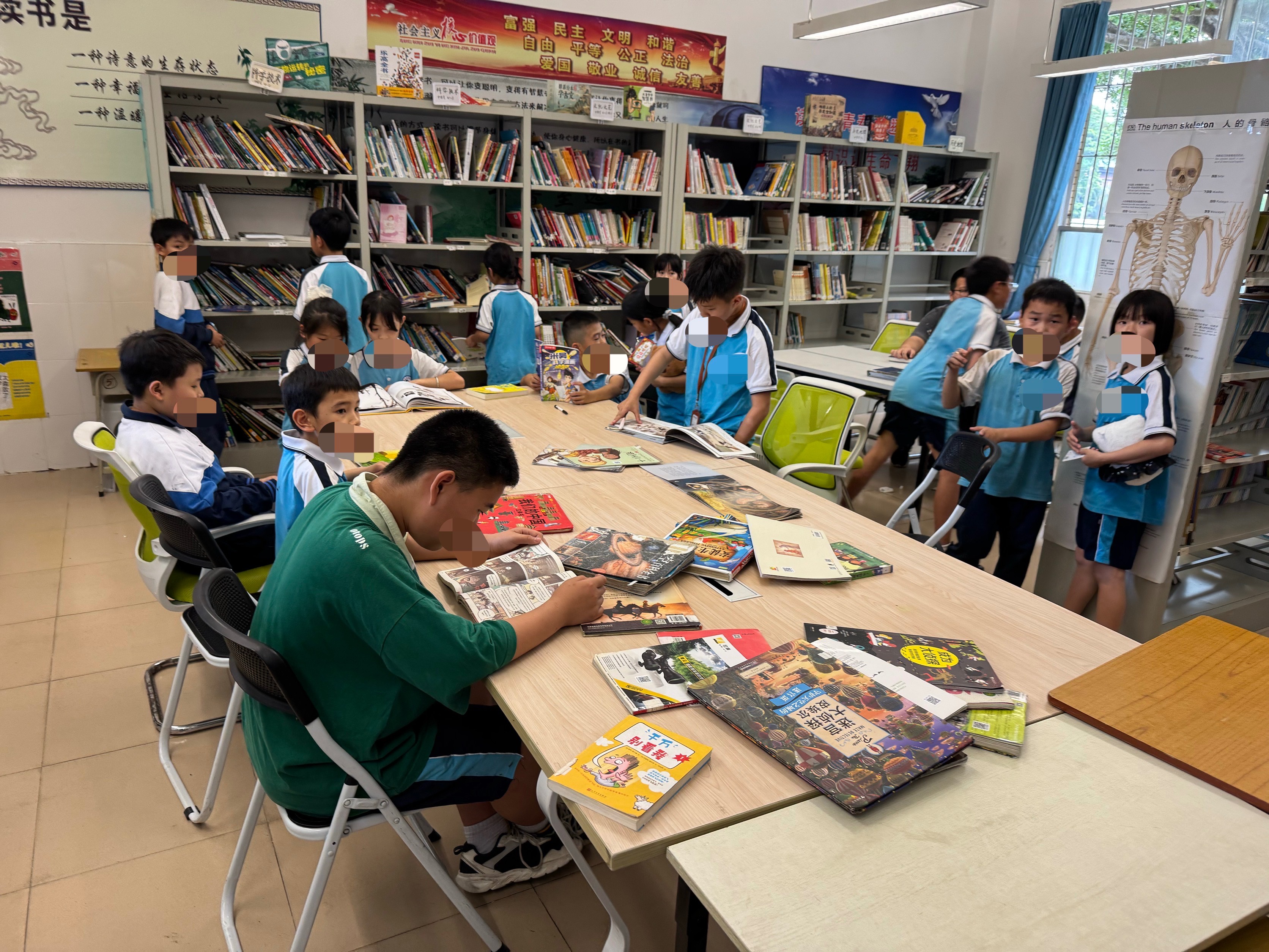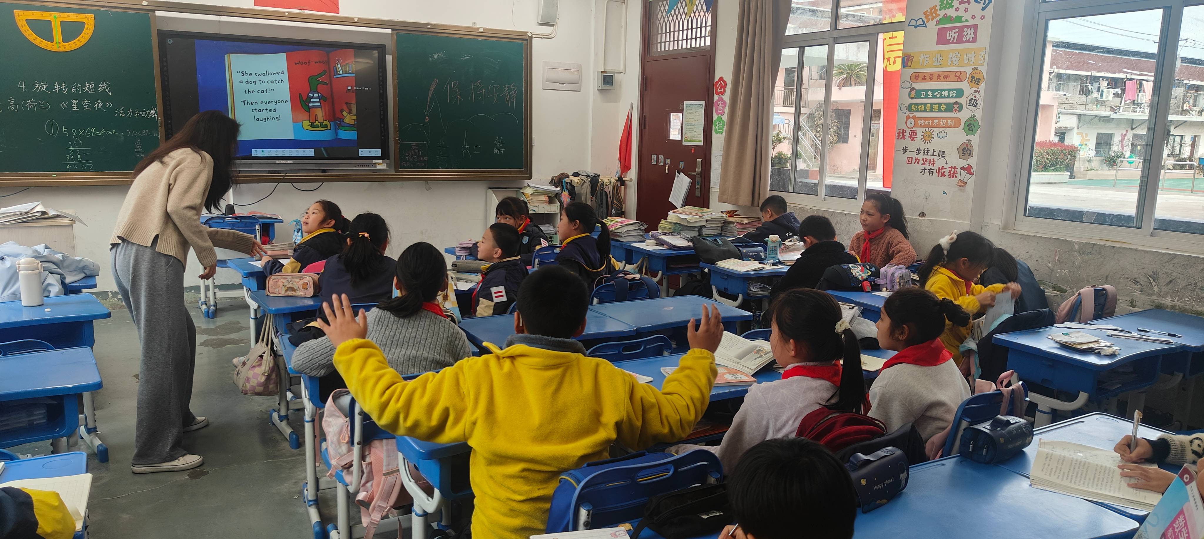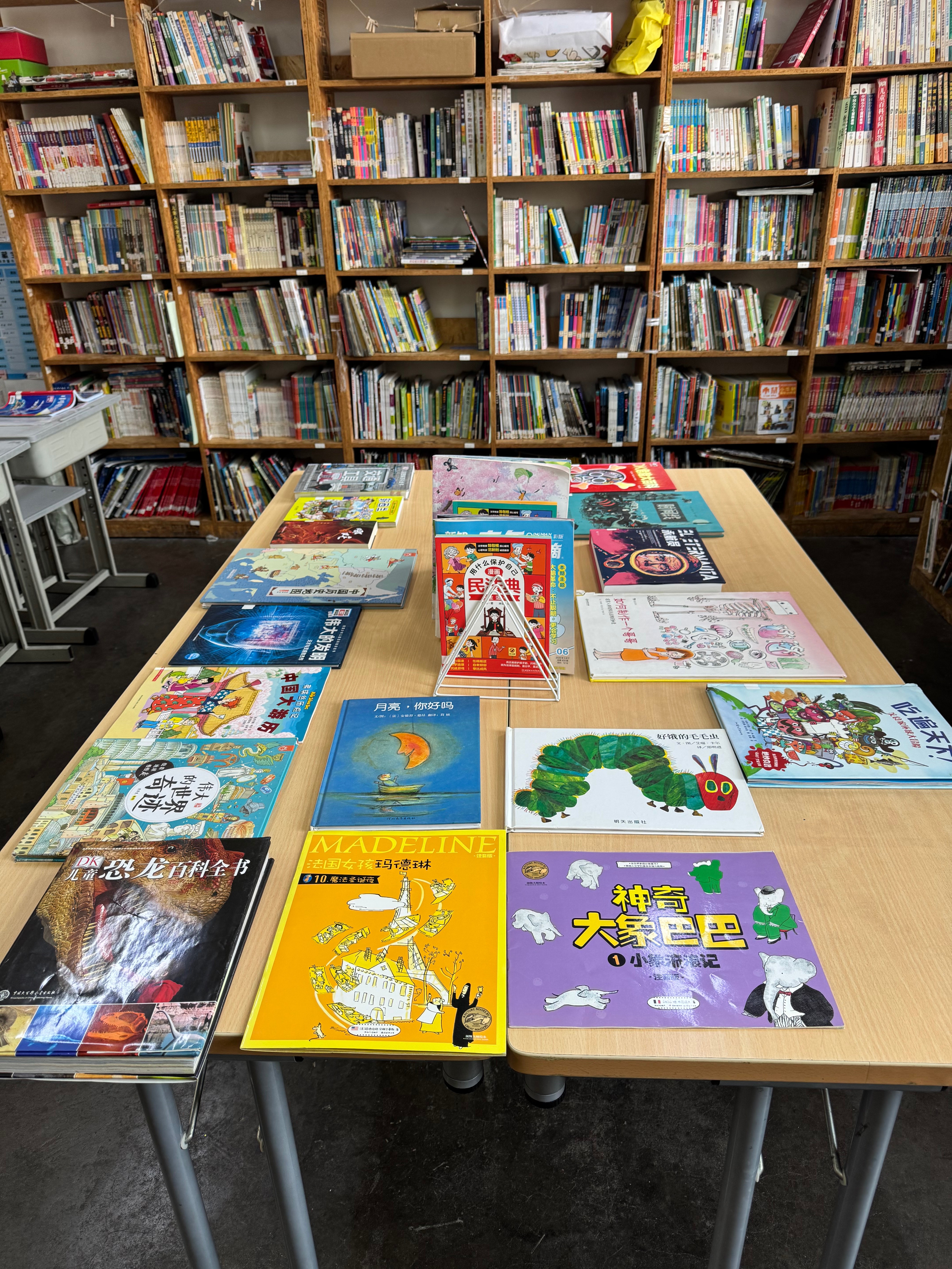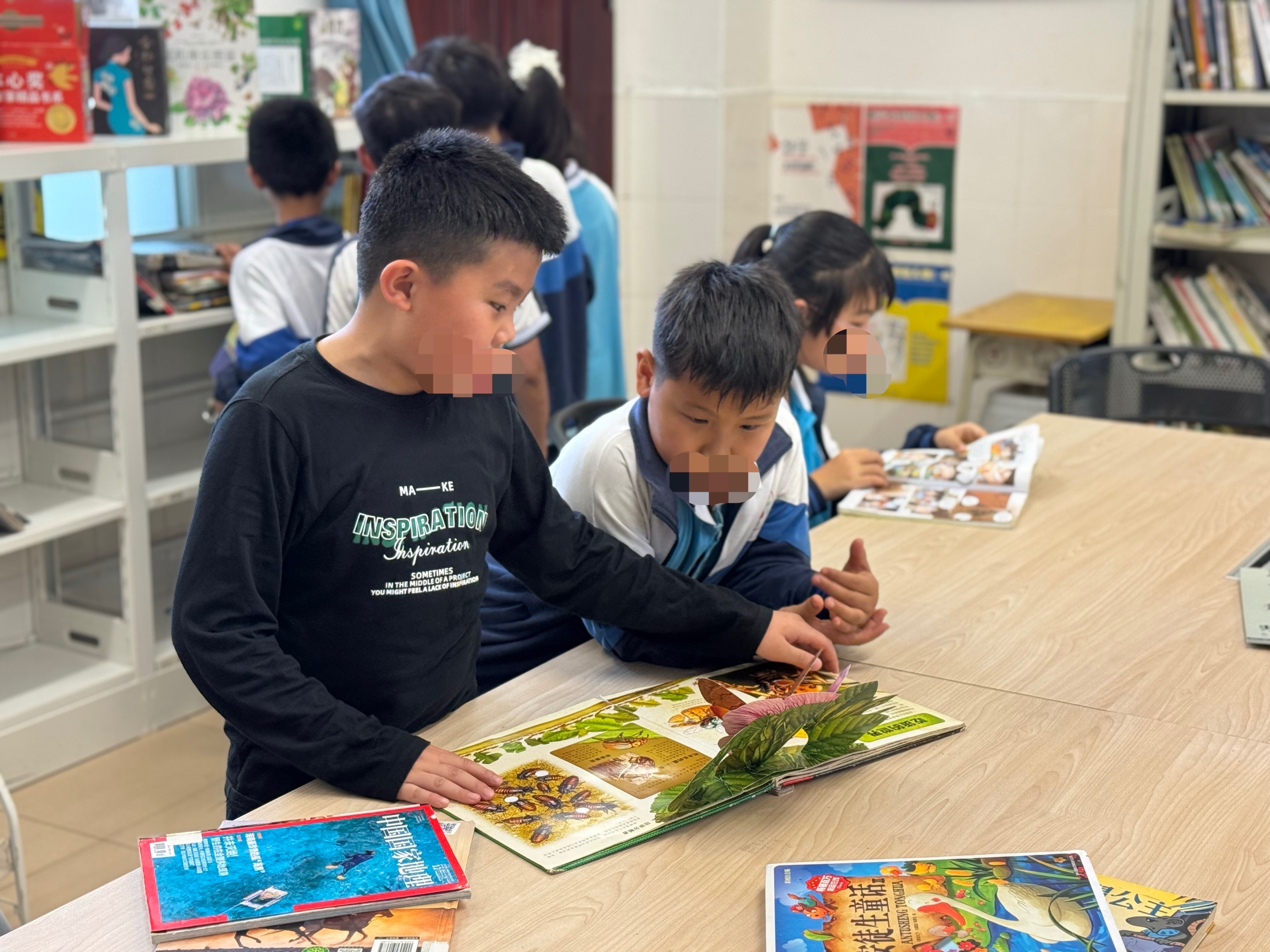 整理书架将过期杂志和堆积的图书下架并打包,录入几本新书,LJ进一年级二班讲......